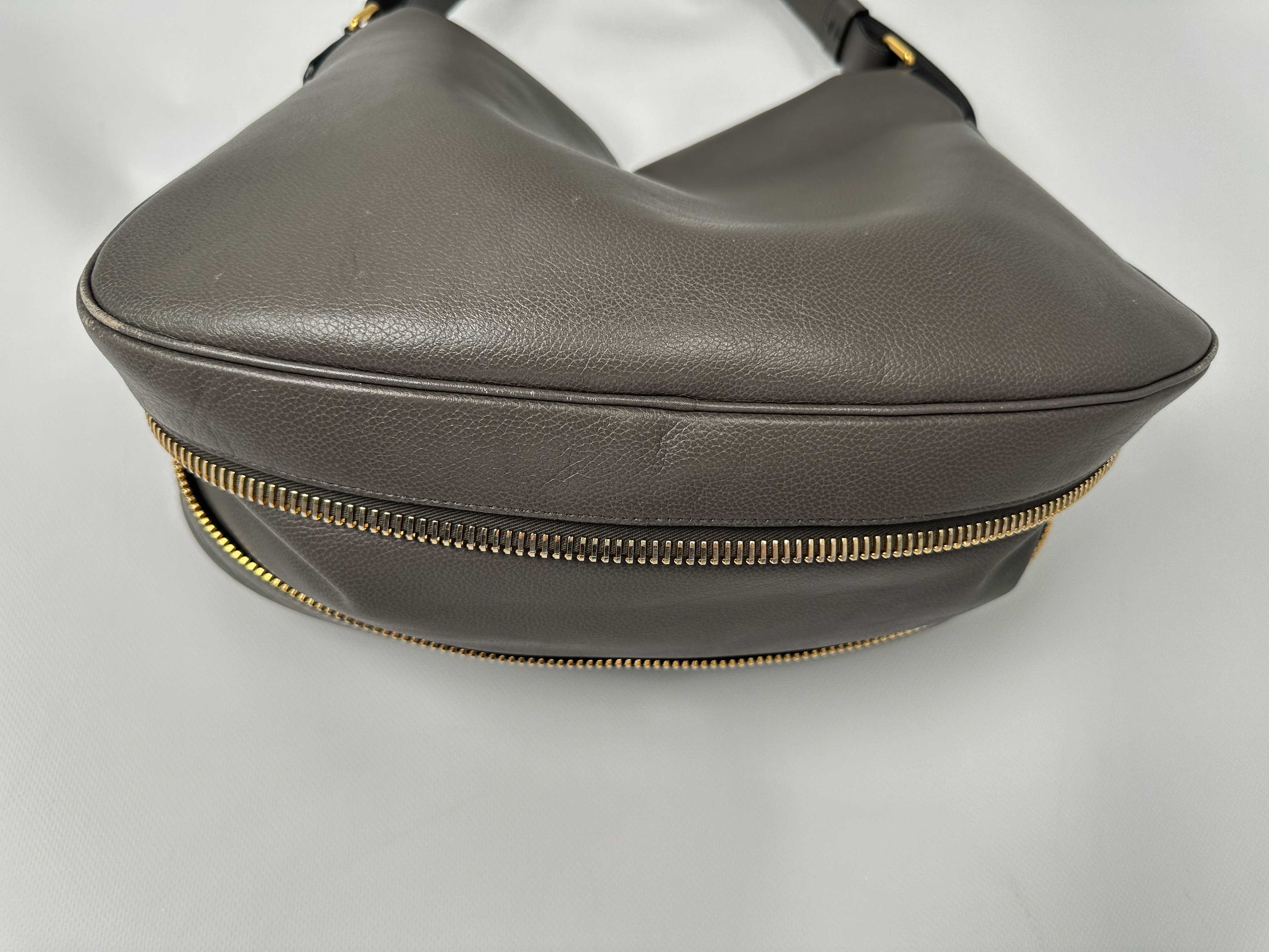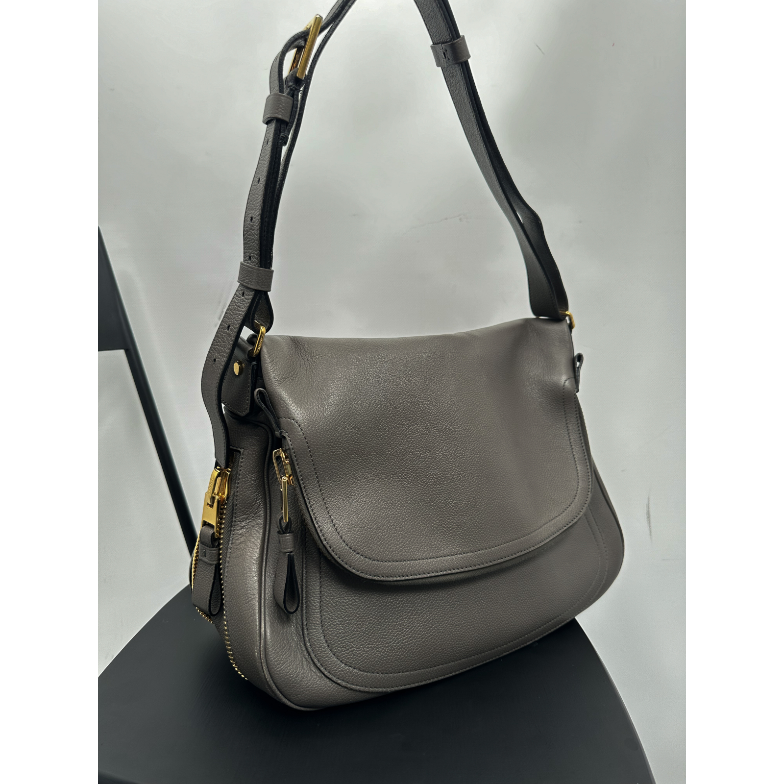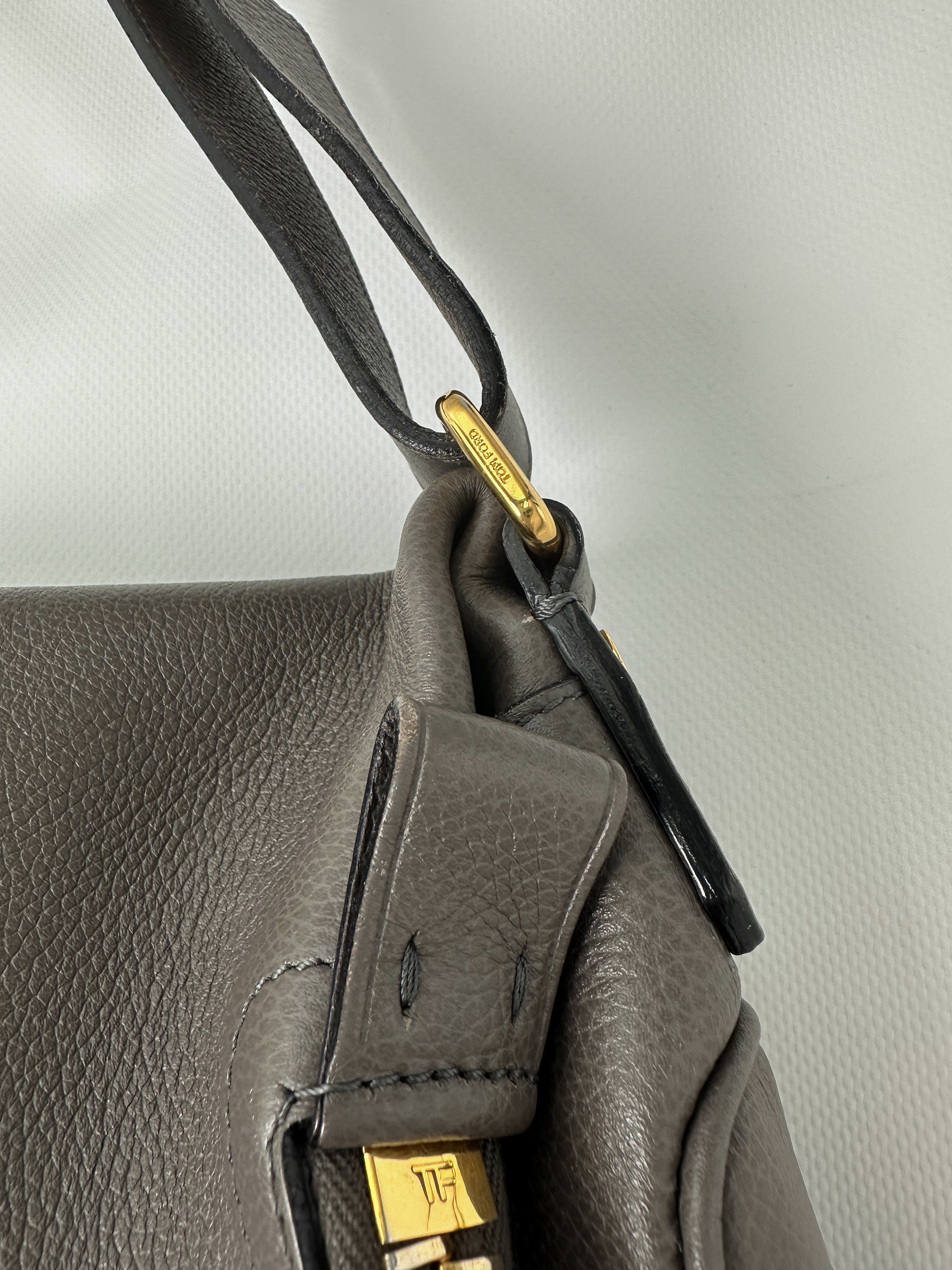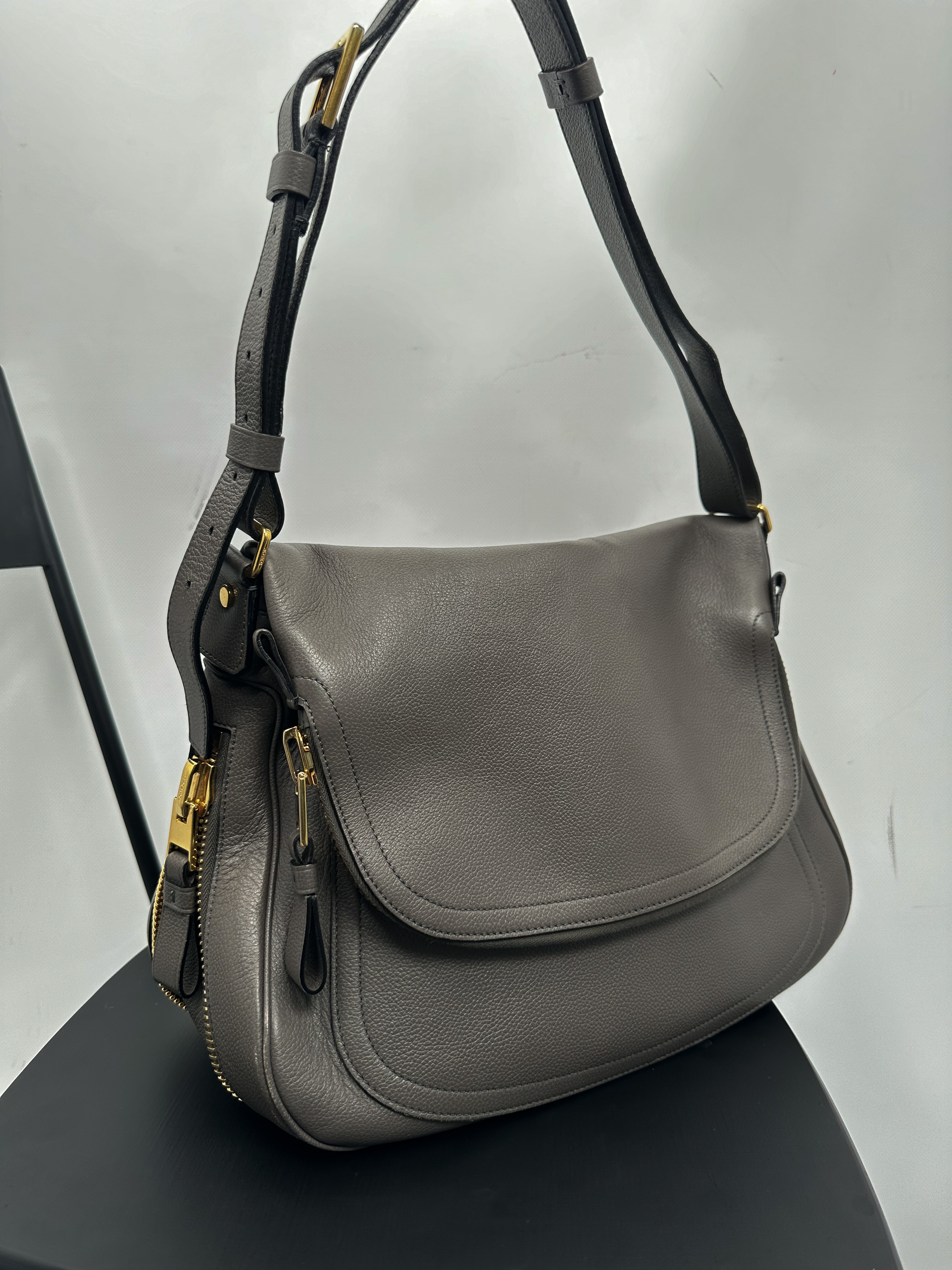 "Skórzana torebka na ramię w kolorze taupe, trapezowy kształt, dekoracyjne przeszycia, regulowany pasek wykończony złotą klamrą, regulowana głębokość, zasuwana kieszeń pod klapą, czarne wnętrze, jedna komora z zasuwaną kieszenią, używana. Stan dobry, przetarte rogi torebki. Model: Jennifer. Wymiary: szerokość 37cm , wysokość 30cm, głębokość 17cm."