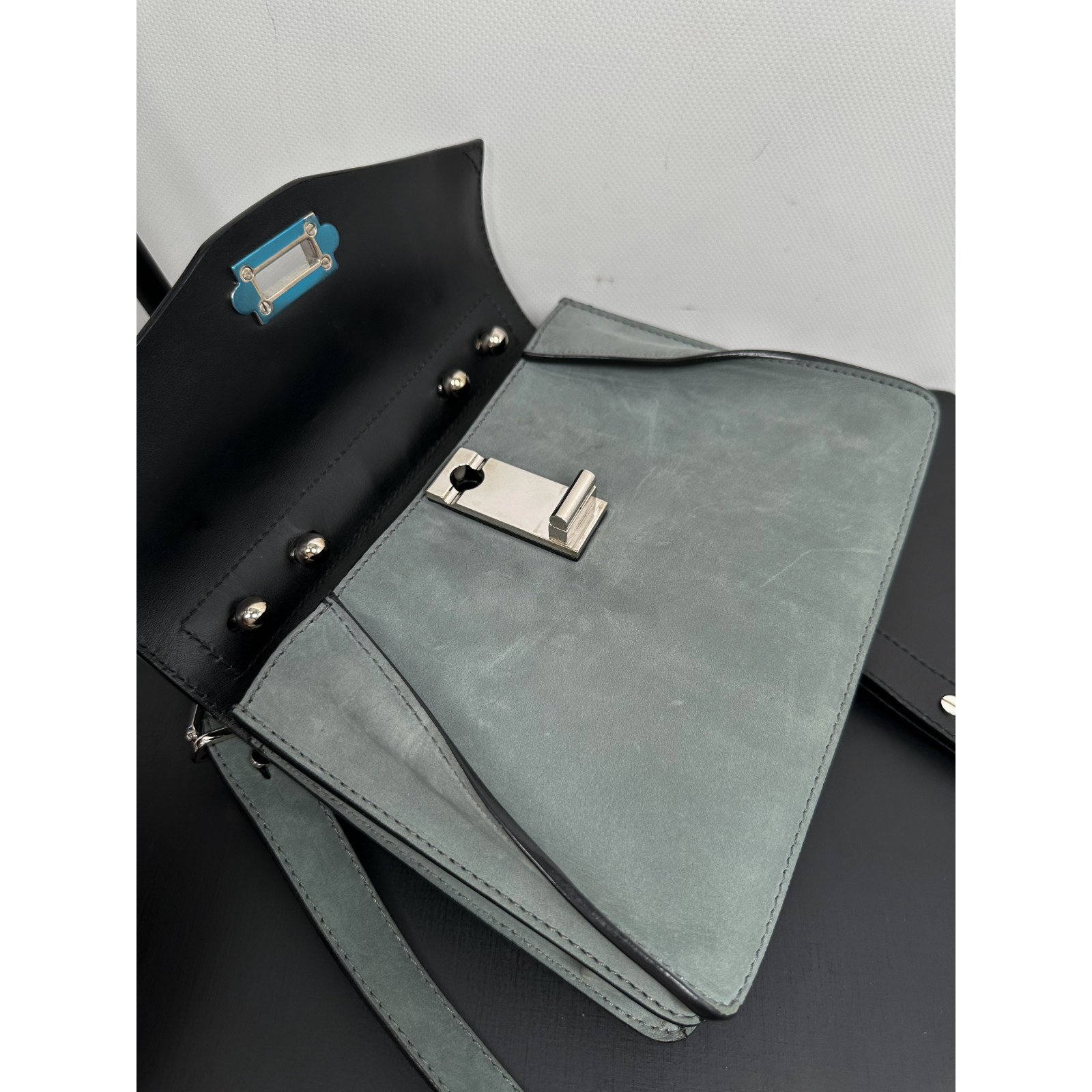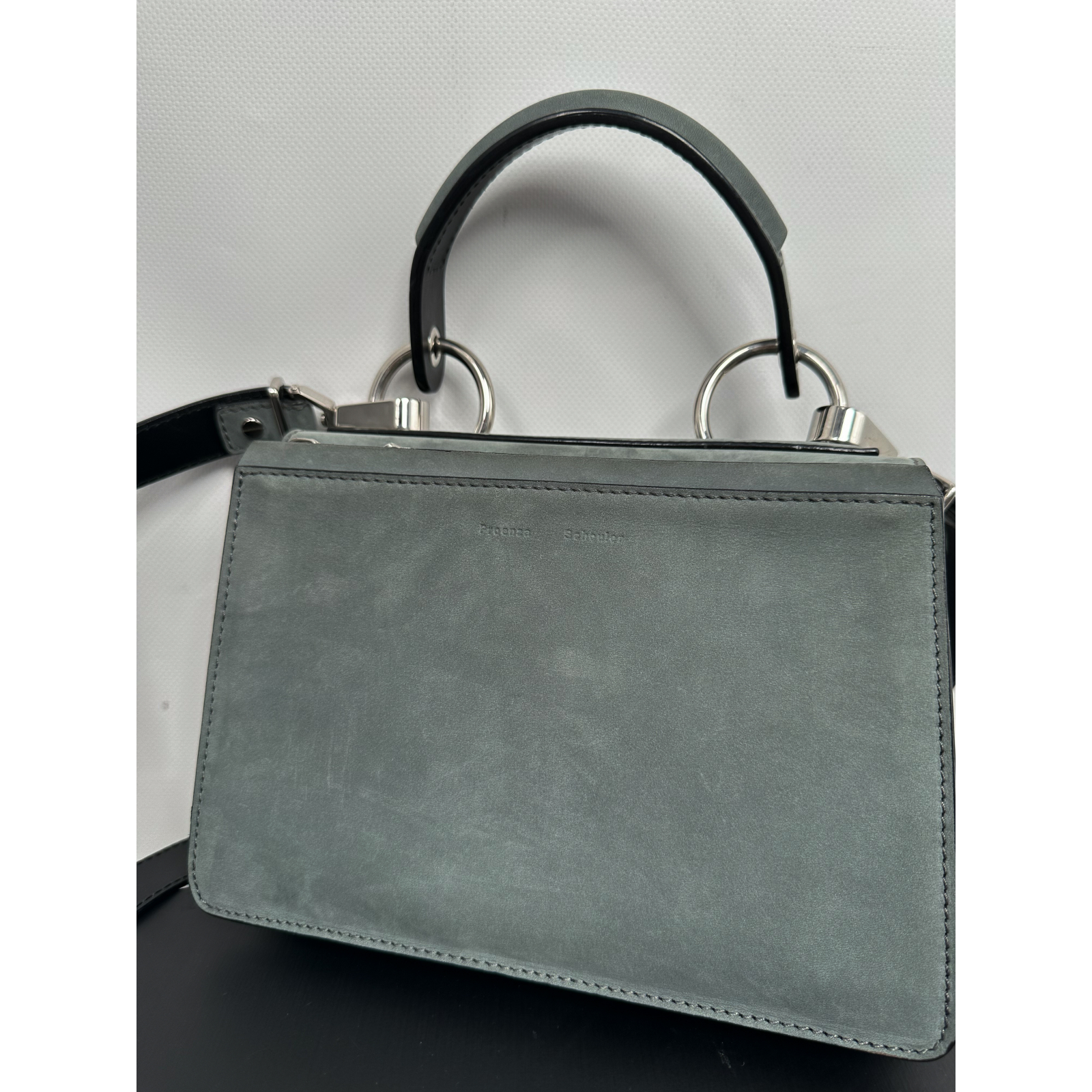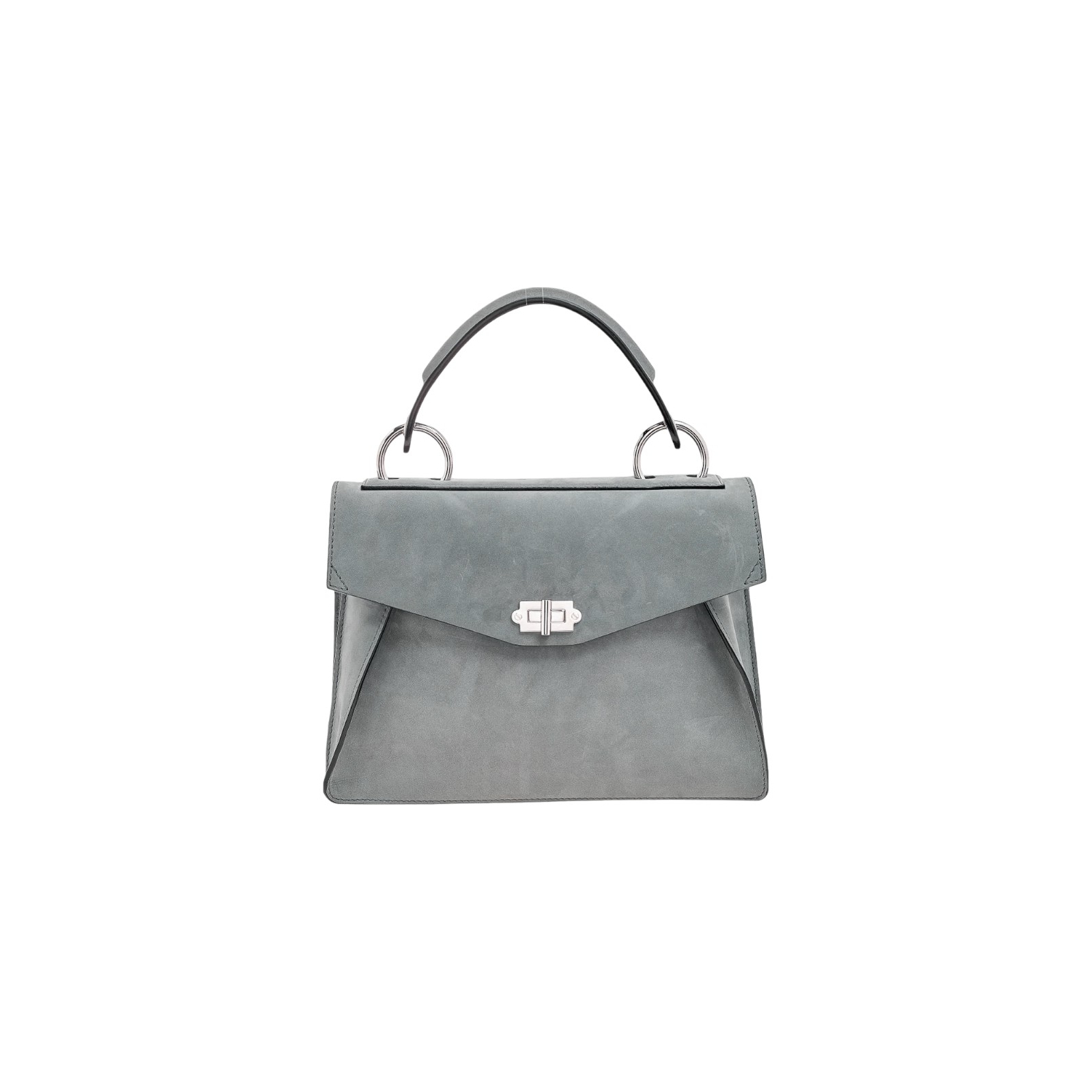 "Szaroniebieska mała skórzana zamszowa torebka na ramię, uchwyt w górnej części, odpinany regulowany pasek na ramię, przekręcane srebrne zapięcie na klapie w przedniej części, srebrne okucia, w zestawie z workiem przeciwkurzowym, zasuwana kieszeń w tylnej części z wytłaczanym logo marki, jedna komora wewnątrz, czarne wnętrze, używana. Stan bardzo dobry, delikatne ryski na metalowych elementach oraz skórze. Wymiary: szerokość 24cm, wysokość 18cm, głębokość 6cm."