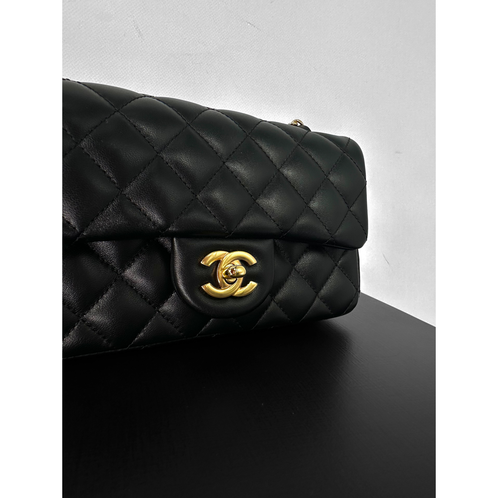 "Czarna mała skórzana pikowana torebka, miękka skóra, złote zapięciem z logo marki na przodzie, długi pasek na ramię ozdobiony złotym łańcuchem, jedna komora z kieszenią wewnątrz, w zestawie z kartą, workiem przeciwkurzowym oraz certyfikatem oryginalności entrupy. Stan idealny. Wymiary: szerokość 19,5cm, wysokość 11cm, głębokość 6,5cm. Model: mini flap."