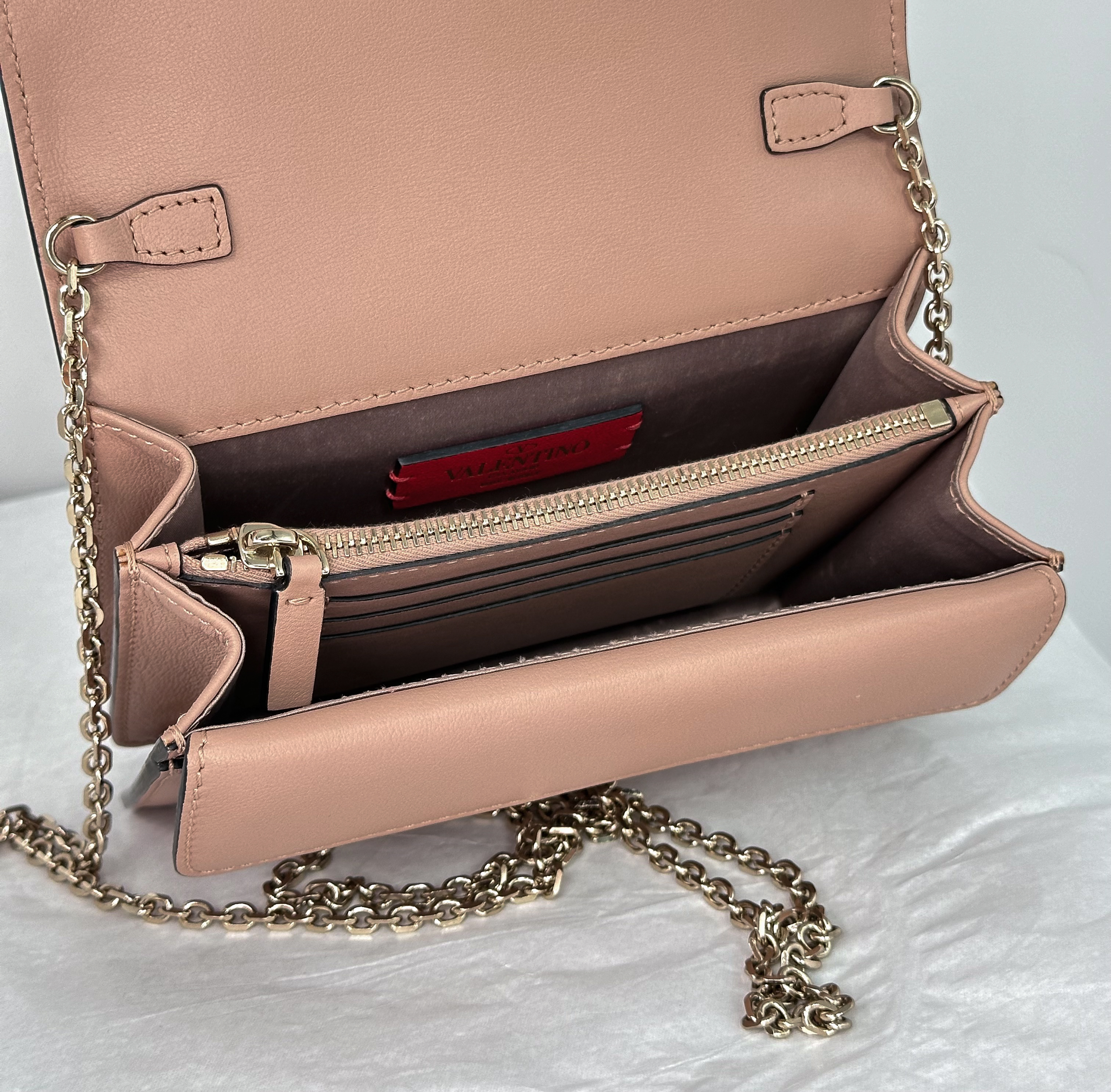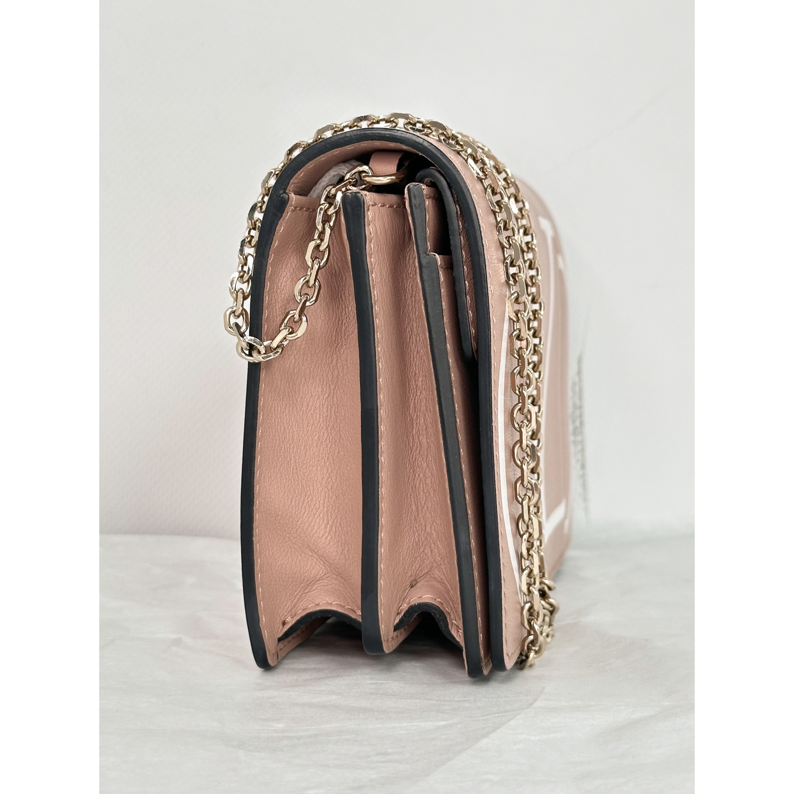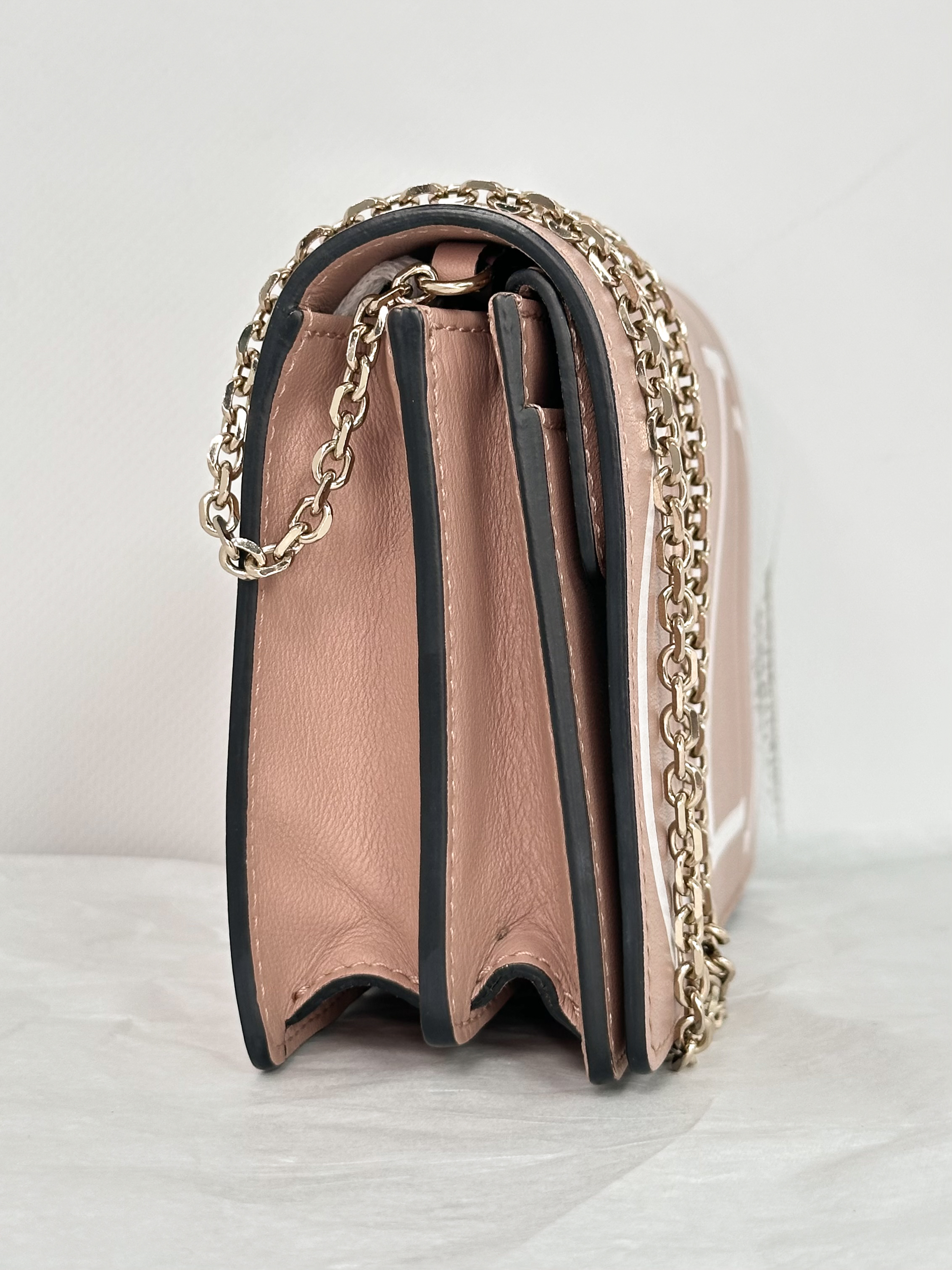 "Torebka w kolorze brudnego różu, z białym logo marki, na złotym łańcuszku. Worek przeciwkurzowy w komplecie. Wymiary: szerokość 16,5cm, głębokość 5cm, wysokość 12cm."