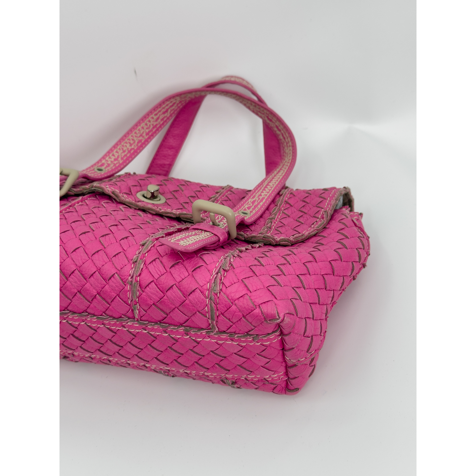 "Różowa torebka z szarymi przeszyciami, w charakterystyczny pleciony wzór dla marki, w środku wykończona brązowym zamszem. Zapinana na szare zapięcie. Posiada dodatkowy pasek. Możliwość noszenia do ręki oraz crossbody. Worek przeciwkurzowy w komplecie. Torebka jest używana, zapięcie ma zdarty lakier. Wymiary: szerokość 35cm, wysokość 18cm, głębokość 10cm."