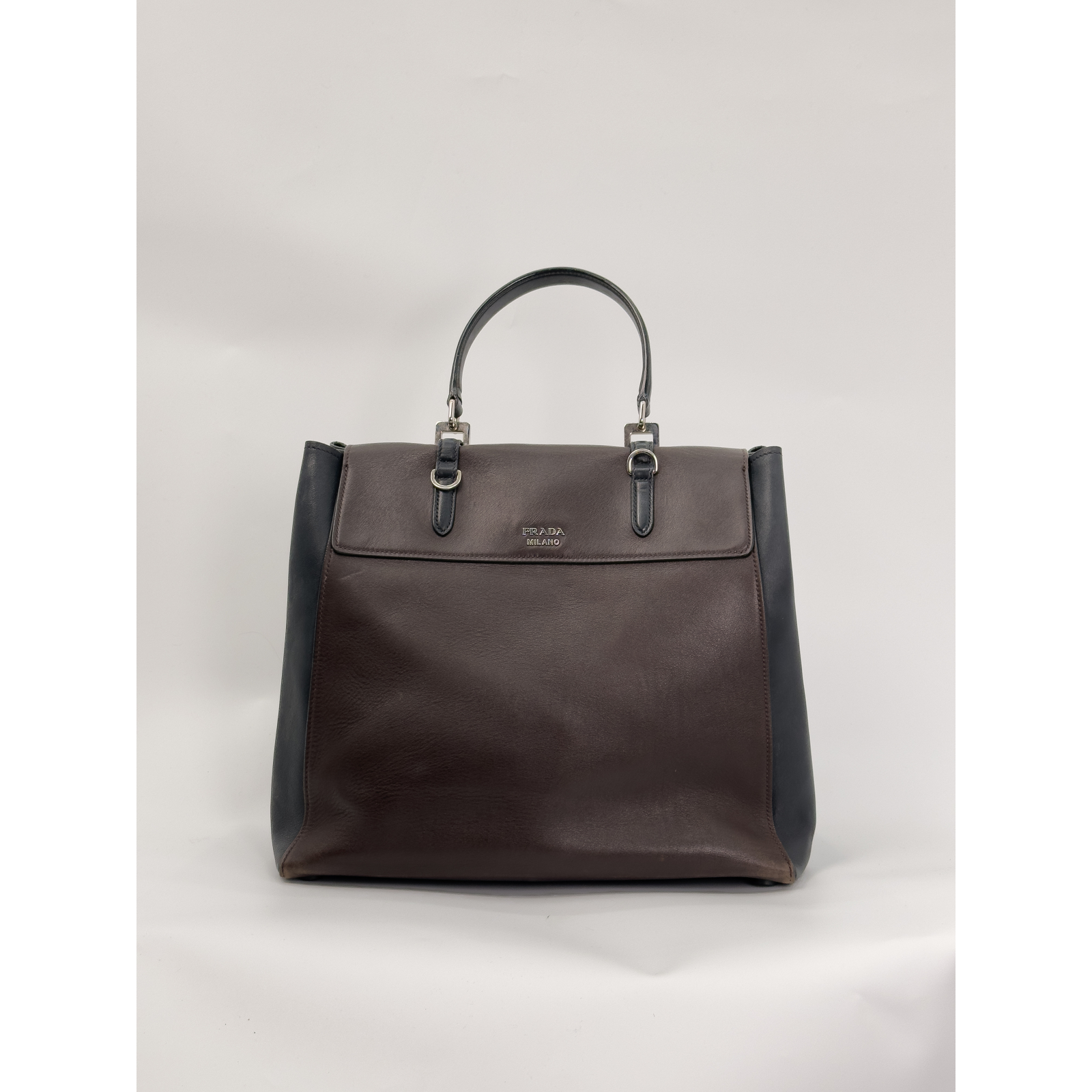 "Czarno-brązowa skórzana torebka, trapezowy kształt, czarny uchwyt do ręki w górnej części wykończony dwoma paskami, dwa przekręcane zapięcia na klapie, srebrne logowane okucia, logo marki w tylnej części, cztery nóżki od spodu, zwężana po bokach, dwie duże komory wewnątrz oraz kieszeń, używana. Stan dobry, delikatne zadrapania na skórze, przetarcia na nóżkach oraz rogach, rysy na metalowych elementach. Wymiary: szerokość 35cm, wysokość 29cm, głębokość 19cm."