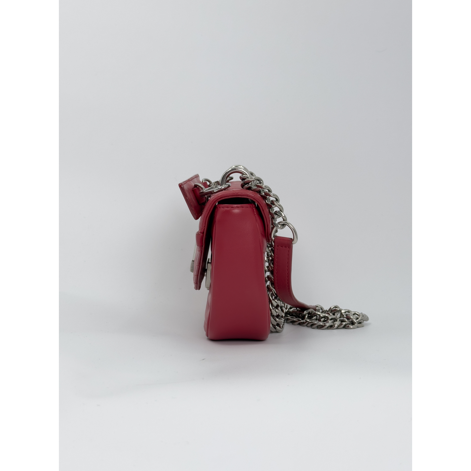 "Czerwona torebka z metalowymi okuciami. Model: New Wave Chain Bag. Mała torebka z pikowanej skóry licowej. Zawieszona jest na długim, nieodpinanym łańcuszku o grubych ogniwach w kolorze srebrnym. Dodatkowa wstawka ze skóry licowej ułatwia ułożenie jej na ramieniu. Łańcuszek można także przewlec przez metalowe obręcze i skrócić jego długość o połowę. Ten model można nosić zarówno na ramieniu, na krzyż lub przez dodatkowy - odpinany uchwyt w ręku. Odczepiany pasek ze skóry naturalnej ozdobiony jest logo w kolorach tęczy. Na klapie torebka wbite ma dwa dżety w kolorze srebrnym oraz duże logo z zachodzących na siebie liter: "L" i V". Zapinana jest na klamrę z zabezpieczającym zatrzaskiem. W środku ma jedną komorę i pojedynczą, małą kieszeń bez zapięcia. Dół torebki jest lekko falowany. Skład: 100% skóra naturalna. Pudełko oraz worek w komplecie. Torebka jest w bardzo dobrym stanie, posiada przybrudzenia w środku oraz skóra jest pomarszczona w niektórych momentach. Wymiary: szerokość 21cm, wysokość 14cm, głębokość 5,5cm."