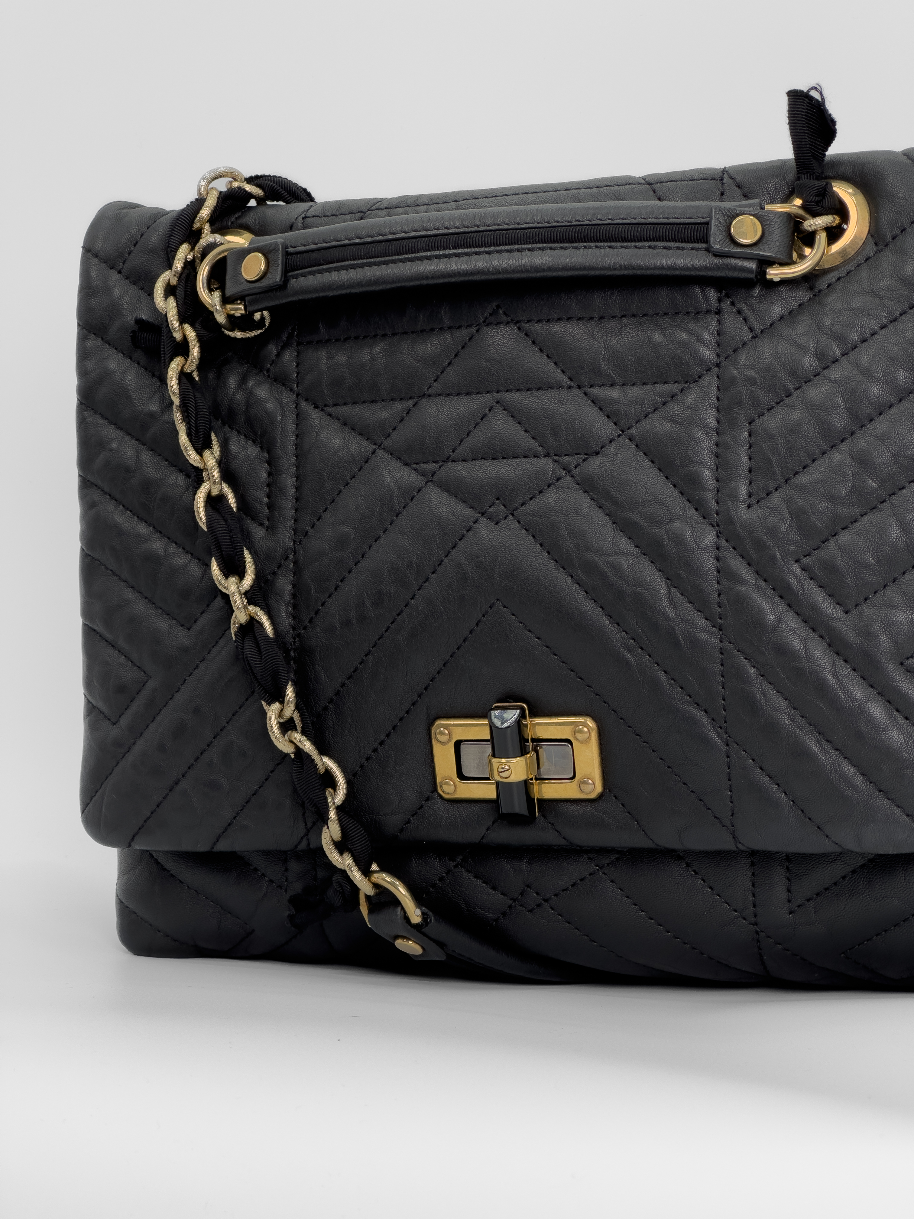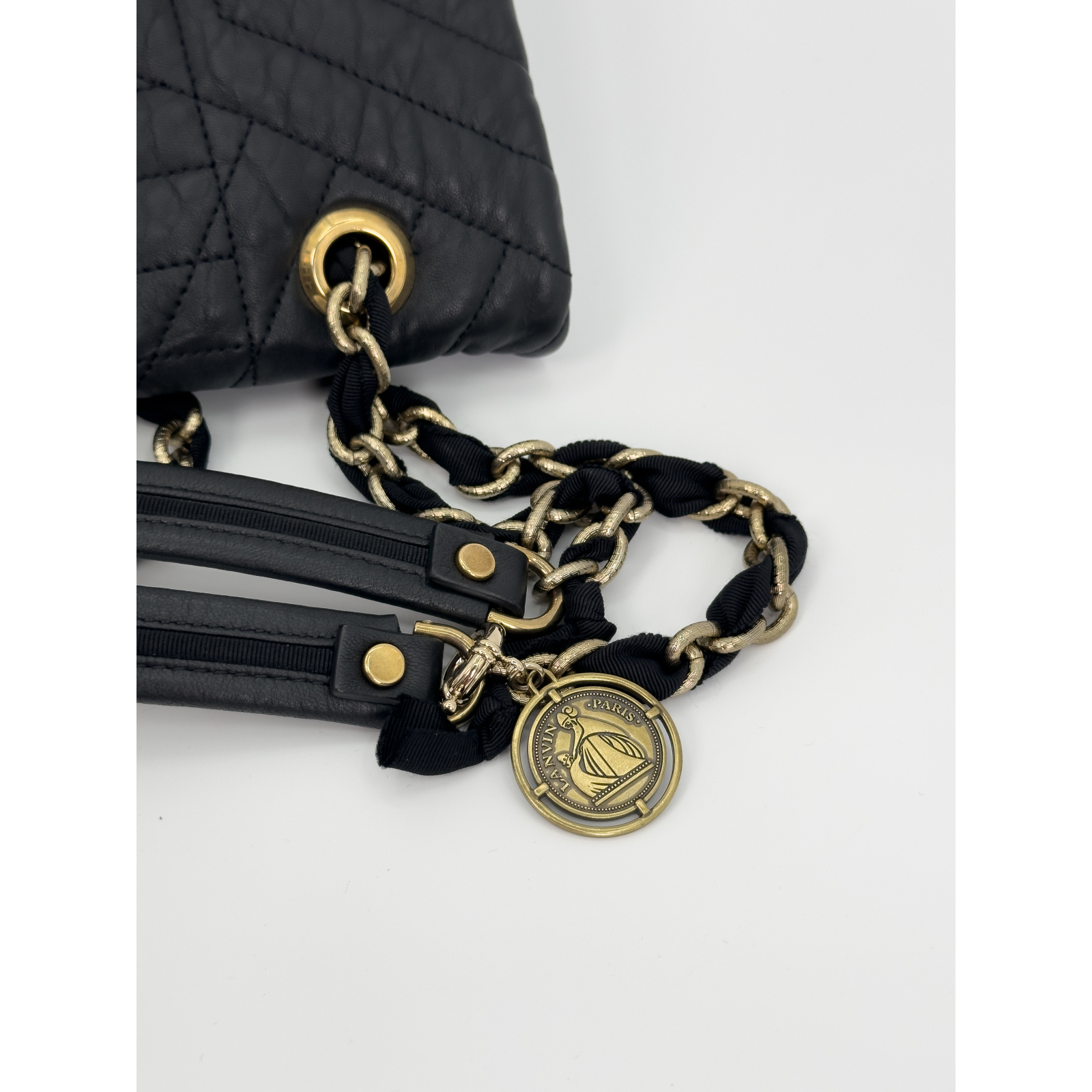 "model: Happy; Czarna skórzana marszczona, pikowana torebka na ramię, kwadratowy kształt, ozdobiona złoto-czarnym przekręcanym zapięciem na klapie, czarny pasek na ramię wykończony złotym łańcuchem, skórzanymi wstawkami oraz brelokiem z grafiką charakterystyczną dla marki, jedna komora wewnątrz z trzema kieszeniami, w tym jedną zasuwaną. Stan bardzo dobry, delikatne przetarcie na jednym rogu. Wymiary: szerokość 29cm, wysokość 25cm, głębokość 11cm."