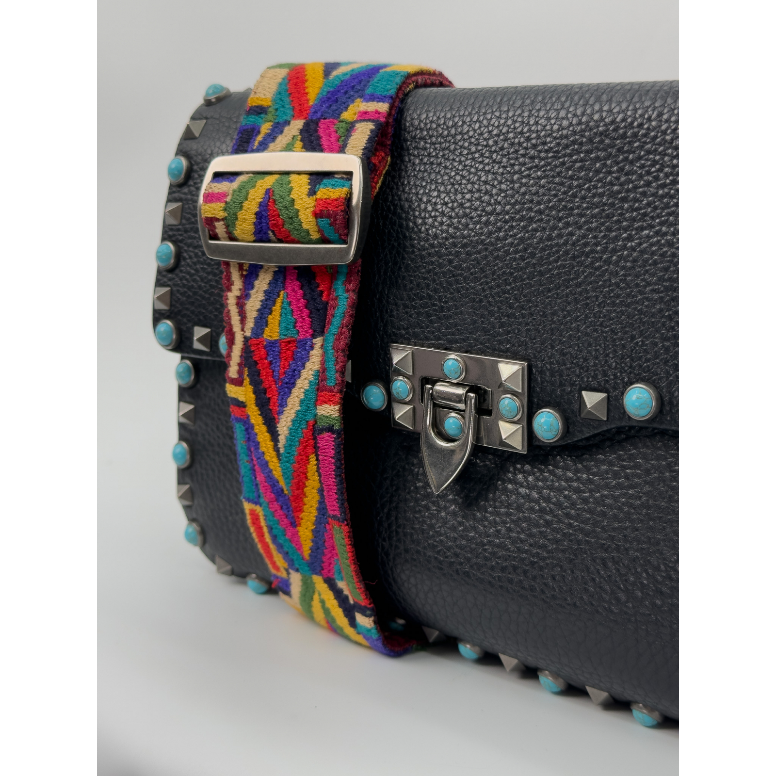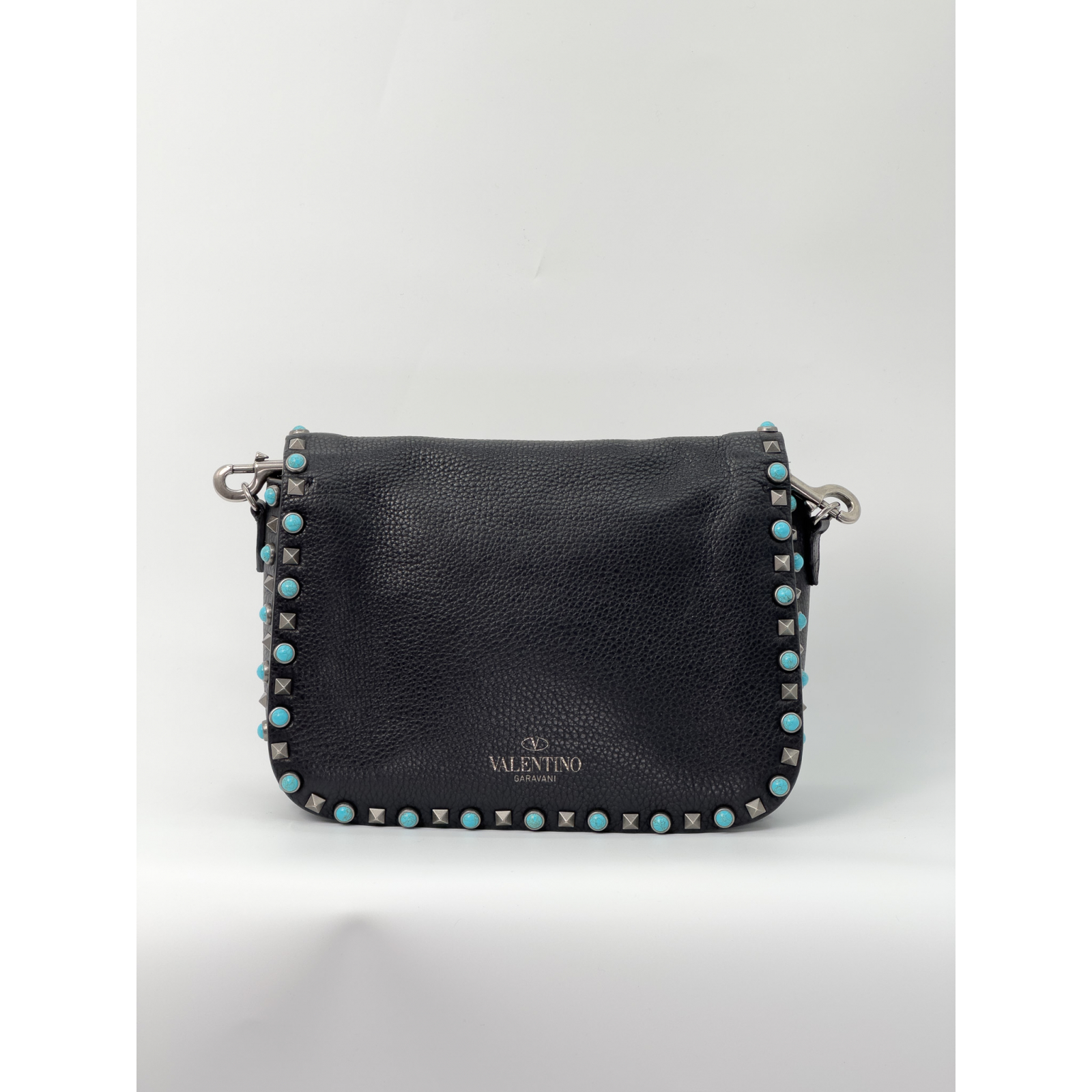 "Czarna skórzana torebka na ramię ozdobiona turkusowymi kamieniami oraz srebrnymi ćwiekami, groszkowa skóra, prostokątny kształt, długi odpinany, regulowany pasek na ramię wykończony kolorową materiałową wstawką, zapięcie na klapie, logowane okucia, zamszowe wnętrze, trzy komory wewnątrz z zasuwaną kieszenią, srebrne logo marki w tylnej części, w zestawie z workiem przeciwkurzowym. Stan bardzo dobry. Wymiary: szerokość 25,5cm, wysokość 19cm, głębokość 7cm."