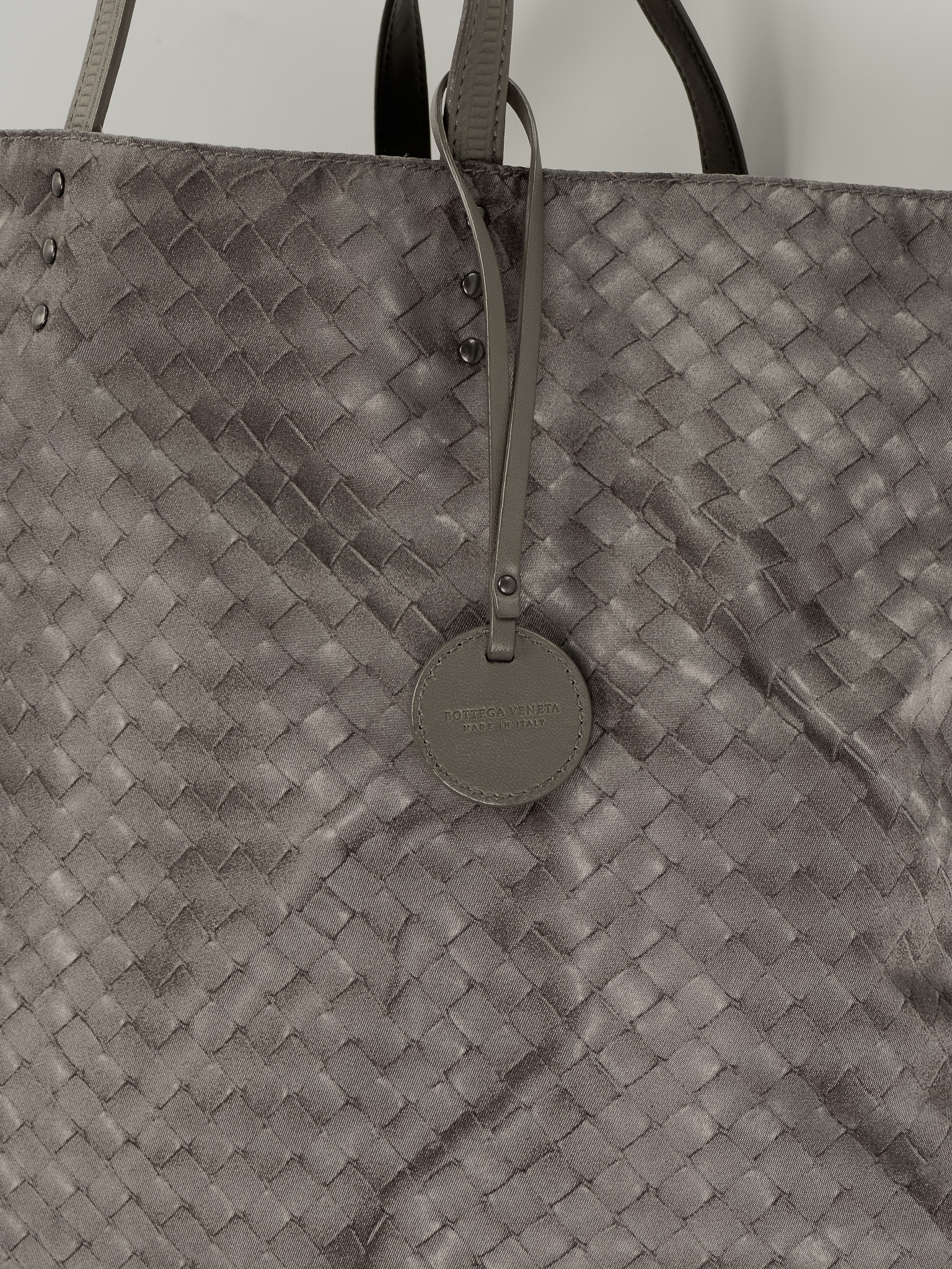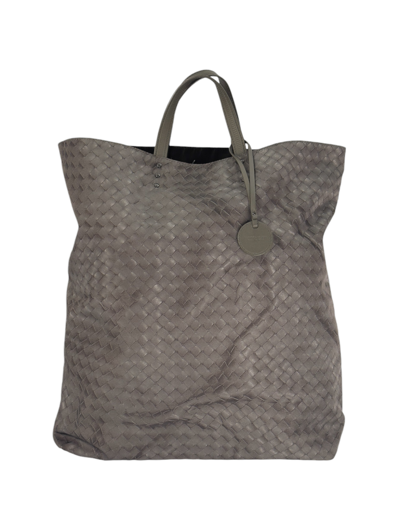 "Szarozielona materiałowa torebka ozdobiona plecieniem, dwa skórzane uchwyty w górnej części z brelokiem z logo marki oraz grafiką motyla, duża, prostokątny kształt, niezapinana, jedna duża komora wewnątrz. Stan bardzo dobry. Wymiary: szerokość 39cm, wysokość 37cm, głębokość 8,5cm."