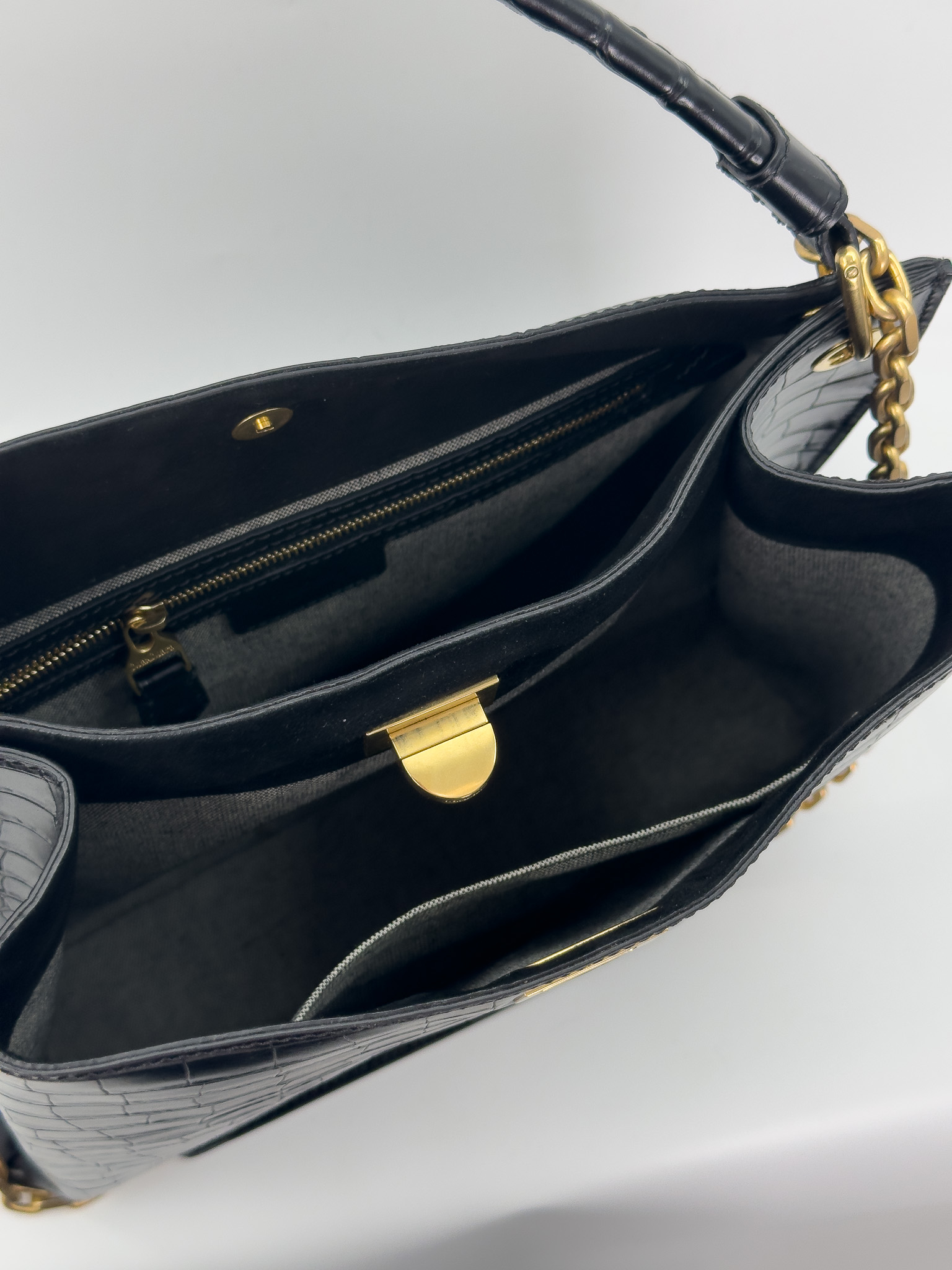"Czarna torebka wytłaczany wzór skóry krokodyla. Złote okucia. Posiada rączkę oraz pasek w formie łańcucha. Stan bardzo dobry, rogi posiadają delikatne przetarcia. Wymiary: szerokość 33cm, wysokość 30cm, głębokość 12cm."
