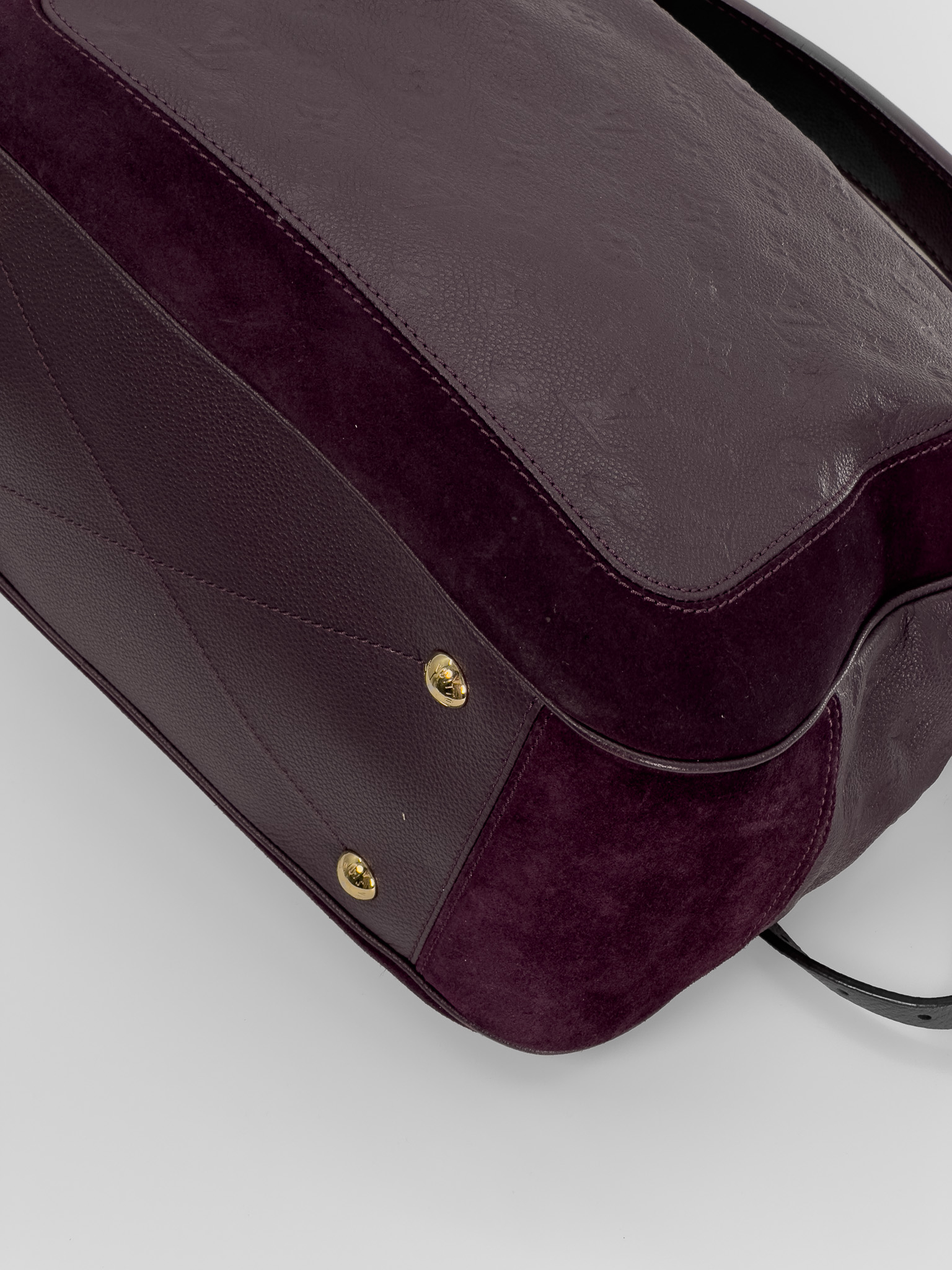 "Model: Audacieuse. Fioletowa skórzana torebka w monogram marki, zamszowe wstawki, złote okucia, uchwyt do ręki, długi, regulowany, odpinany pasek na ramię, zapinana na dwa suwaki wykończone kłódką, dwie komory wewnątrz oraz dwie kieszenie, cztery nóżki od spodu, w zestawie z kluczykami. Stan bardzo dobry, posiada przetarcia na zamszu oraz rogach. Wymiary: szerokość 34cm, wysokość 31cm, głębokość 14cm."