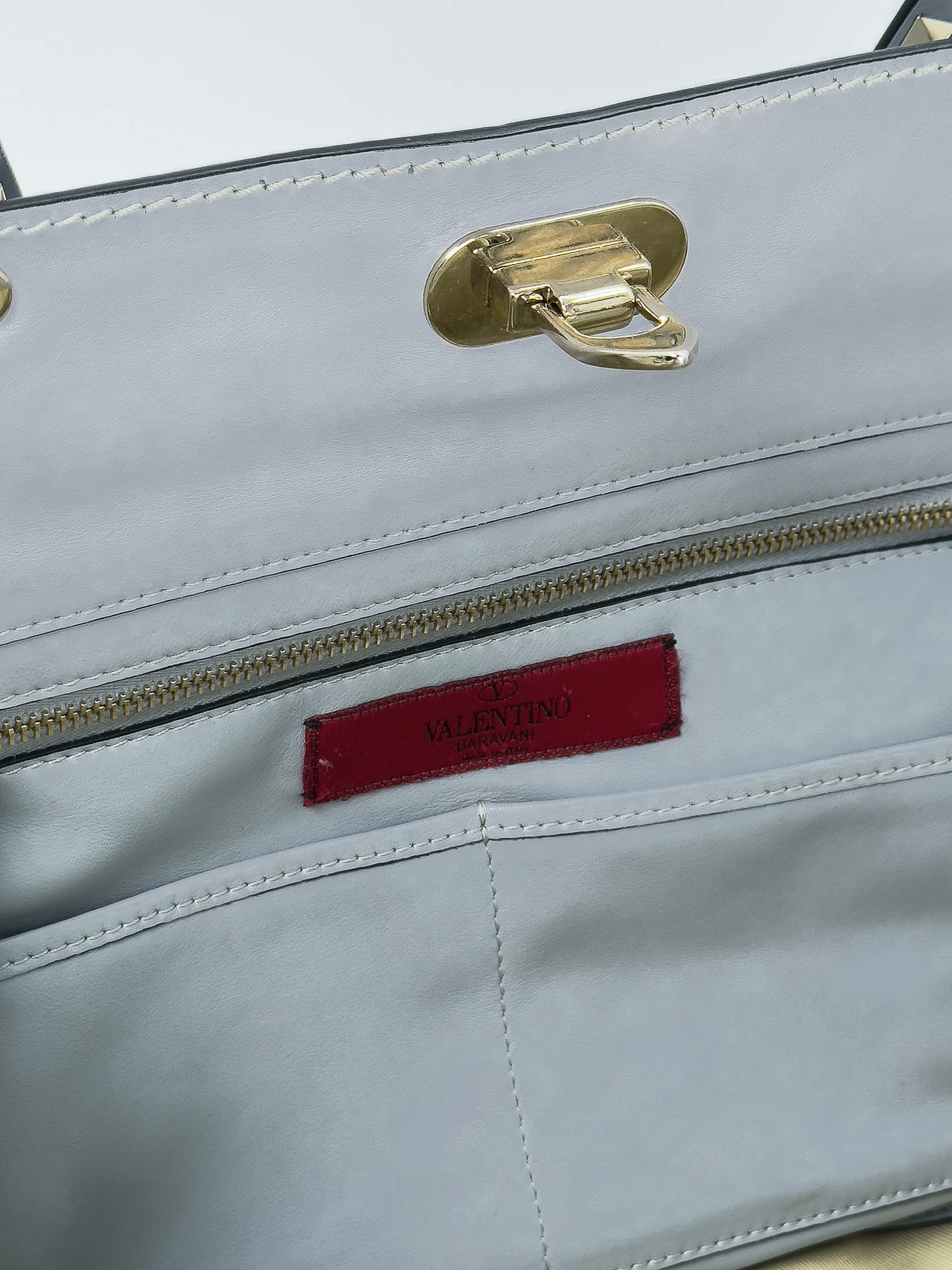 "Błękitna skórzana torebka typu shopper, ozdobiona złotymi ćwiekami, dwa uchwyty do ręki oraz długi odpinany pasek na ramię, złote logo marki w tylnej części, pięć logowanych nóżek od spodu, jedna komora wewnątrz z trzema kieszeniami, materiałowe wnętrze. Stan bardzo dobry, delikatne rysy na metalowych elementach, ślady kleju przy jednym rogu, niewielkie zadrapania na skórze oraz różowe plamy wewnątrz zasuwanej kieszeni. model The Rockstud medium leather trapeze bag. Wymiary: szerokość 33cm, wysokość 26cm, głębokość 13cm."