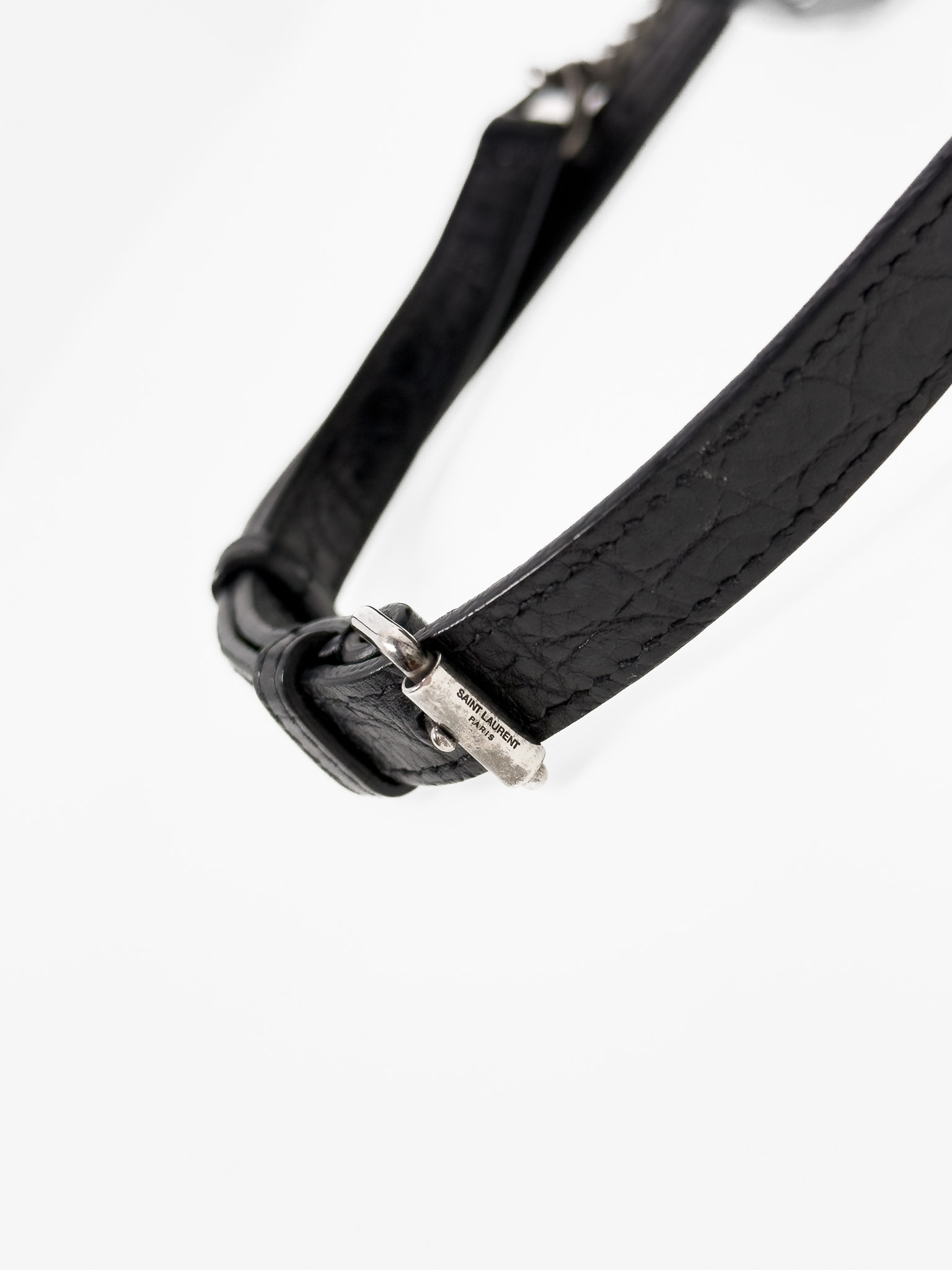 "Czarna skórzana torebka w print krokodyla, mała, miękka skóra, regulowany pasek na ramię wykończony srebrną łańcuchową wstawką, srebrne logo marki w centralnej części, duża kieszeń na klapie zapinana na zapięcie magnetyczne, zasuwana kieszeń z tyłu, dwie przegrody wewnątrz, dwie kieszenie, w zestawie z workiem przeciwkurzowym, używana. Stan dobry, delikatne marszczenia na skórze, rysy i przetarcia na metalowych elementach. Wymiary: szerokość 23cm, głęļokość 7cm, wysokość 15cm."