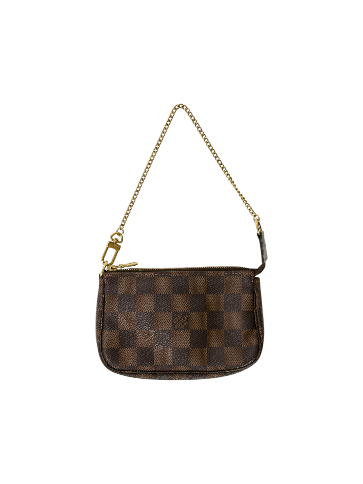 "Mini Pochette Accessoires 760 damier. Brązowa torebka w motyw damier z logo marki, mała, złoty łańcuch do ręki, zapinana na logowany suwak, czerwone wnętrze. Stan bardzo dobry, delikatnie zabrudzone wnętrze, minimalne rysy na metalowych elementach. Wymiary: szerokość 15cm, wysokość 9,5cm, głębokość 2,5cm."