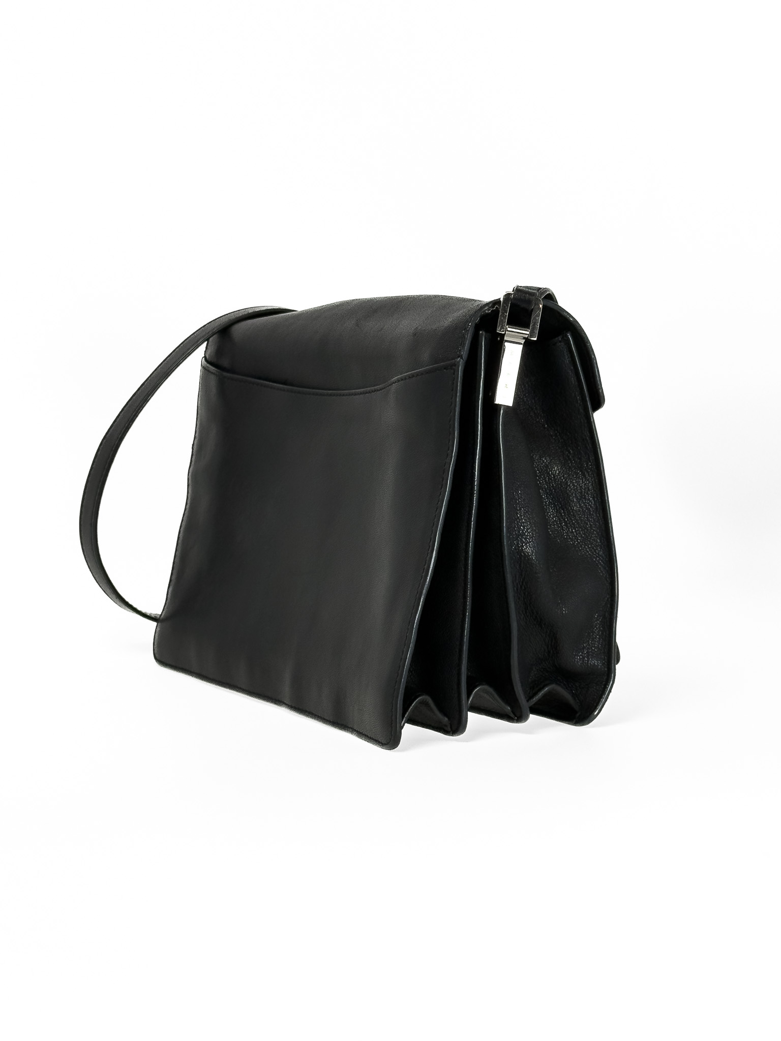"Czarna skórzana torebka na ramię, miękka groszkowa, połyskująca skóra, regulowany pasek na ramię, logowane srebrne okucia, zapięcie pod klapą, trzy komory, dwie zasuwane kieszenie. Wymiary: szerokość 29cm, wysokość 18cm, głębokość 12cm."