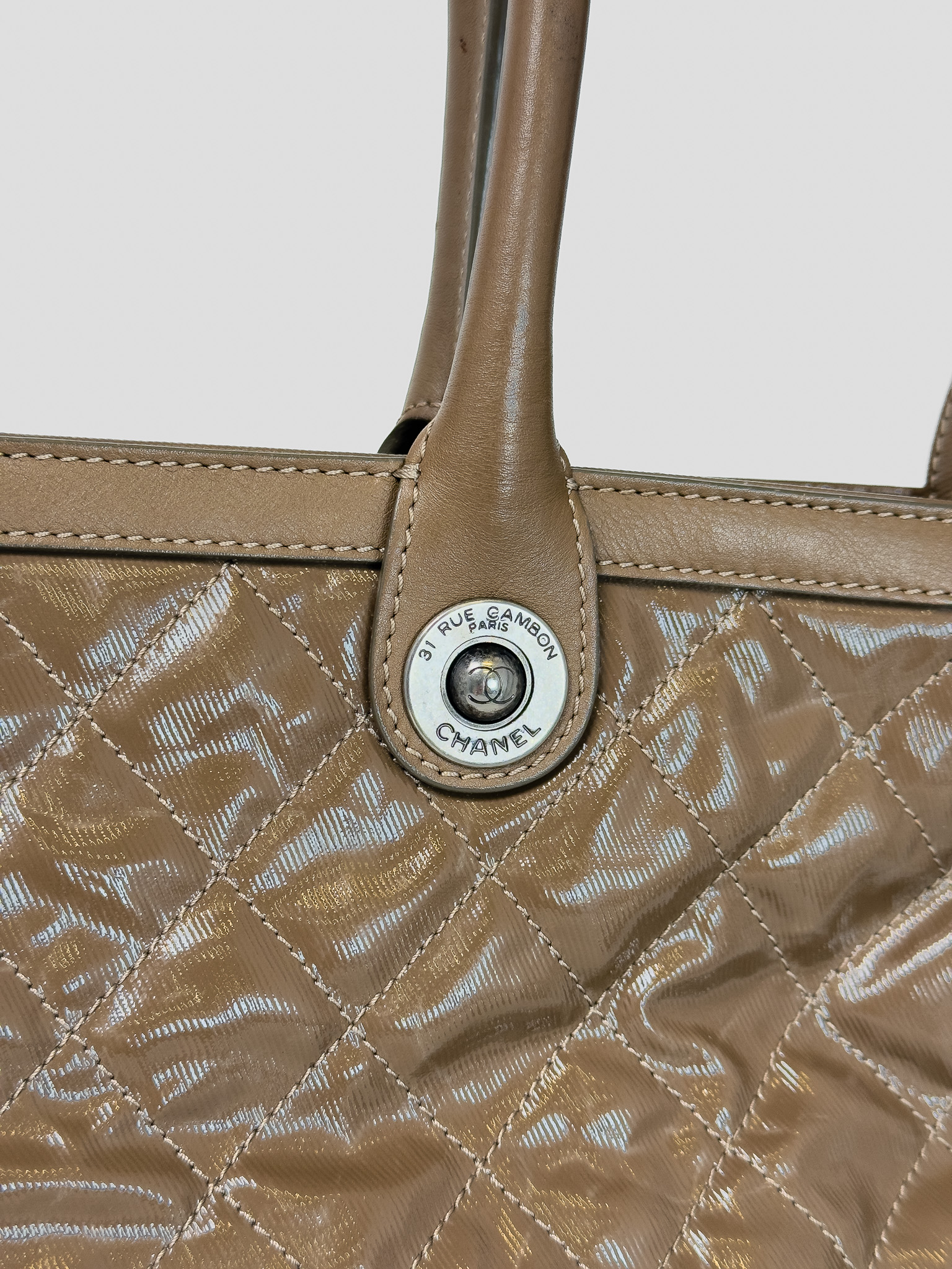 "Brązowa pikowana lakierowana torebka na ramię ozdobiona brelokiem w kształcie logo marki, srebrne logowane okucia, dwa uchwyty na ramię, zapinana na suwak, cztery nóżki od spodu, bordowe materiałowe wnętrze, jedna komora, trzy kieszenie, używana. Stan: zadowalający, mocne zarysowania na podstawie oraz przetarcia na rogach, delikatne plamy na skórze, zabrudzenia na podszewce, zarysowania na metalowych okuciach."