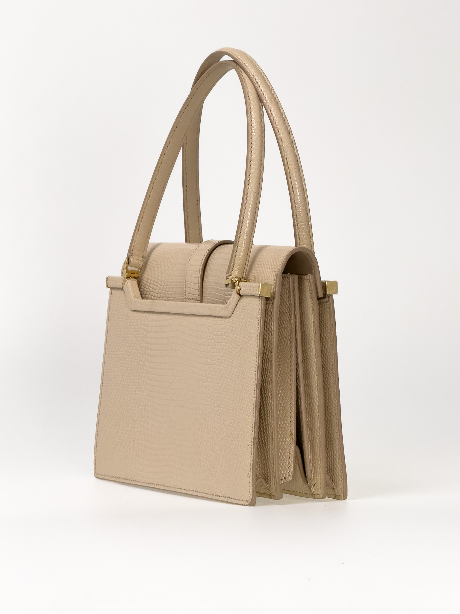"Beżowa skórzana torebka w motyw zwierzęcy, mała, dwa uchwyty do ręki w górnej części, złote logo marki na pasku, dwie komory wewnątrz, dwie kieszenie, prostokątny kształt, złote okucia. Stan bardzo dobry, posiada delikatne ślady kleju w bocznej części oraz przetarcia od spodu."