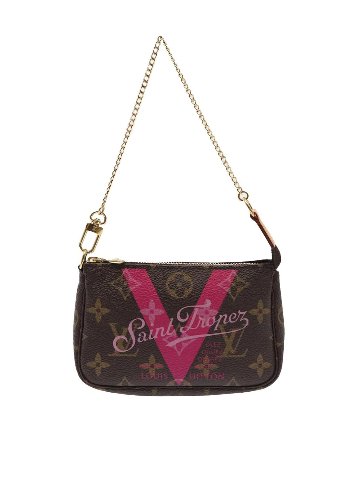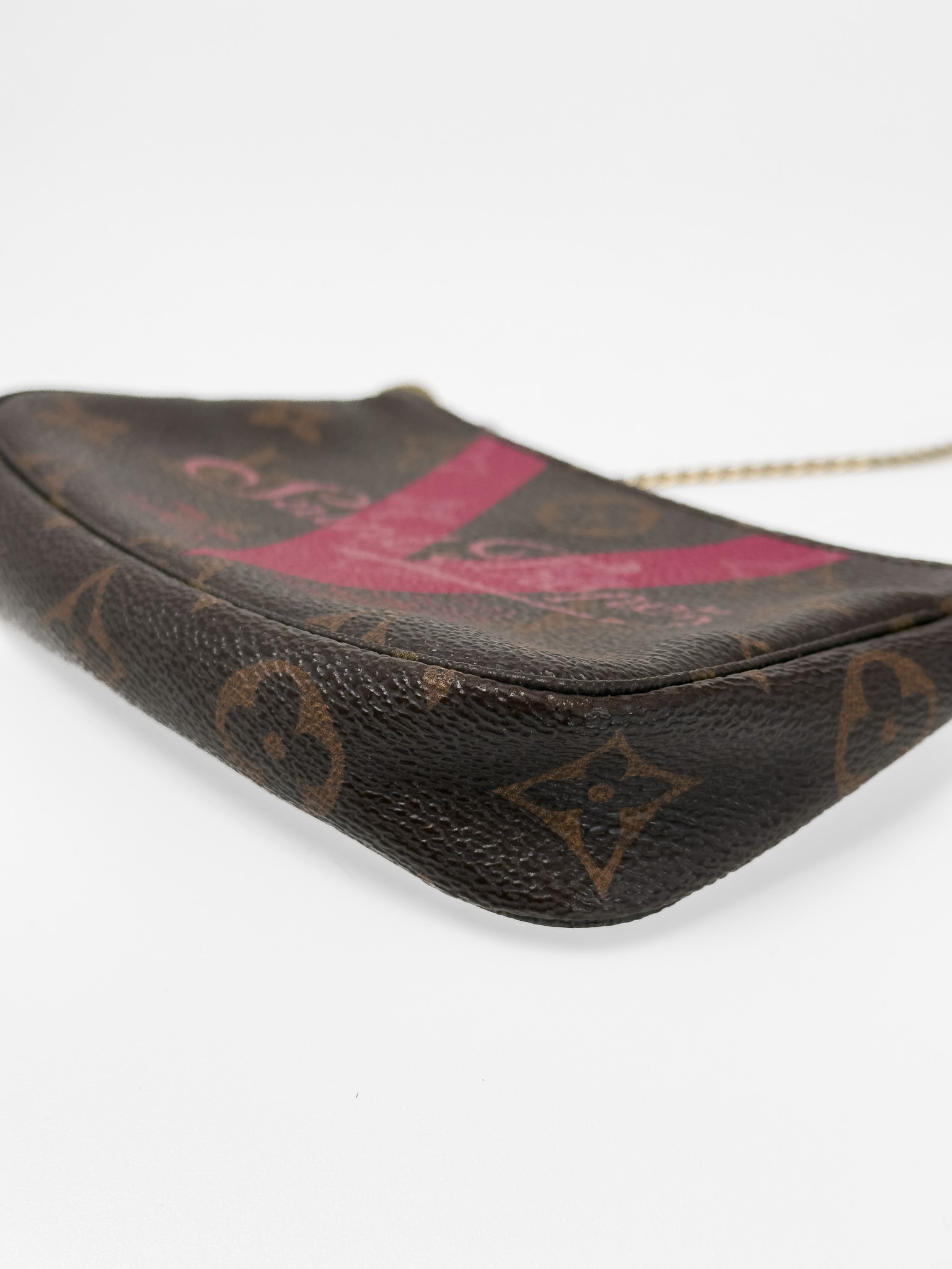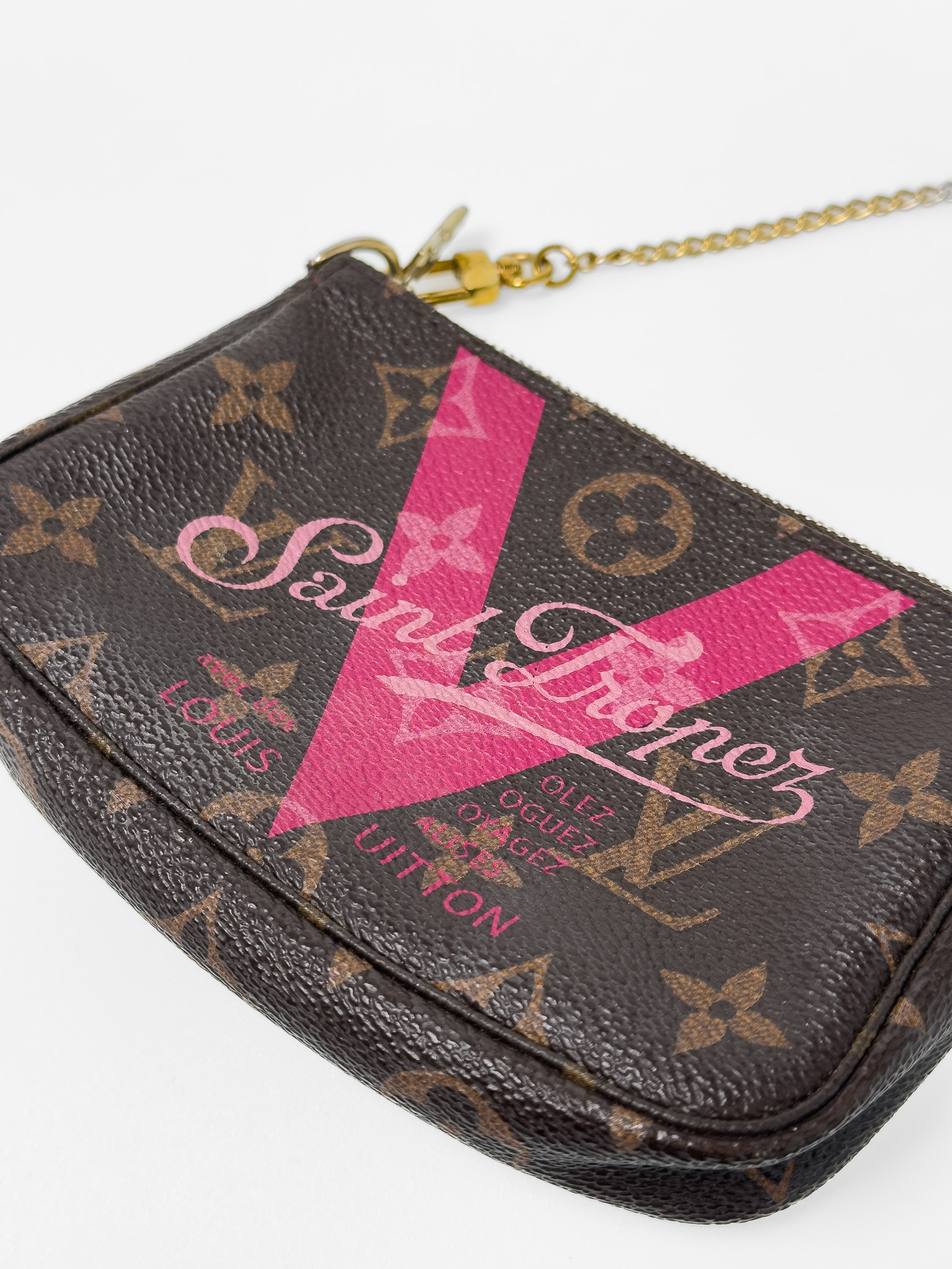 "Model: Mini Pochette Pink V Grenade in Monogram; Brązowa torebka w monogram ozdobiona różową grafiką "Saint Tropez" z logo marki, mała, złoty łańcuch do ręki, zapinana na logowany suwak, materiałowe wnętrze w kolorze magenta, jedna komora. Stan bardzo dobry, przetarcia na skórze przy łańcuchu oraz na metalowych elementach. Wymiary: szerokość 15cm, wysokość 9,5cm, głębokość 3cm."