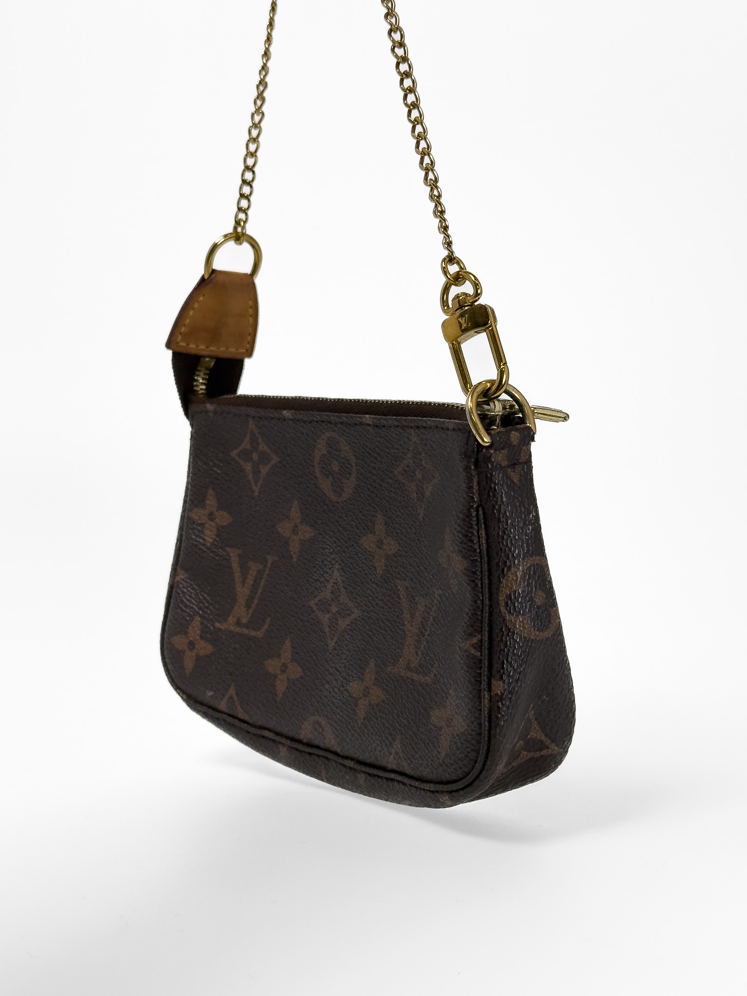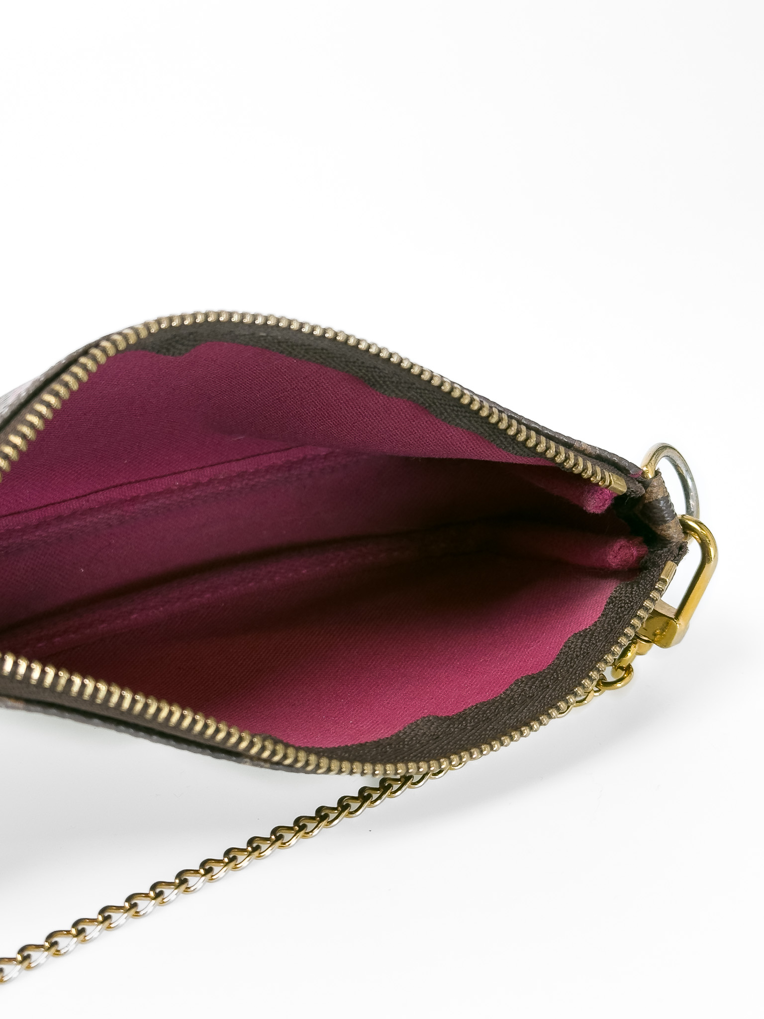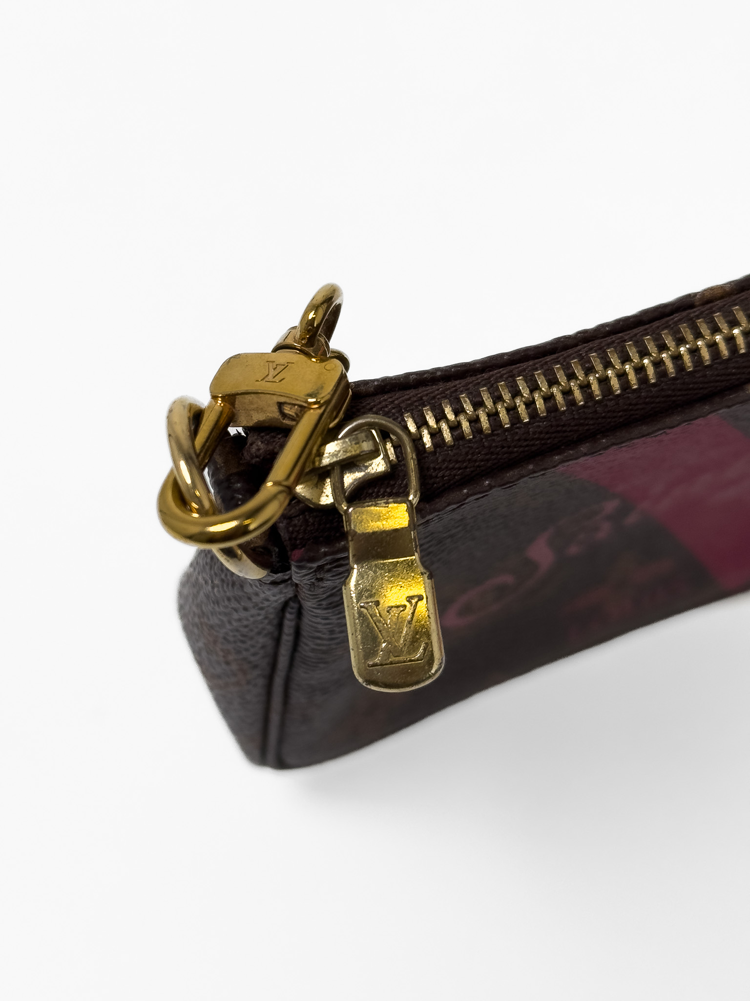 "Model: Mini Pochette Pink V Grenade in Monogram; Brązowa torebka w monogram ozdobiona różową grafiką "Saint Tropez" z logo marki, mała, złoty łańcuch do ręki, zapinana na logowany suwak, materiałowe wnętrze w kolorze magenta, jedna komora. Stan bardzo dobry, przetarcia na skórze przy łańcuchu oraz na metalowych elementach. Wymiary: szerokość 15cm, wysokość 9,5cm, głębokość 3cm."
