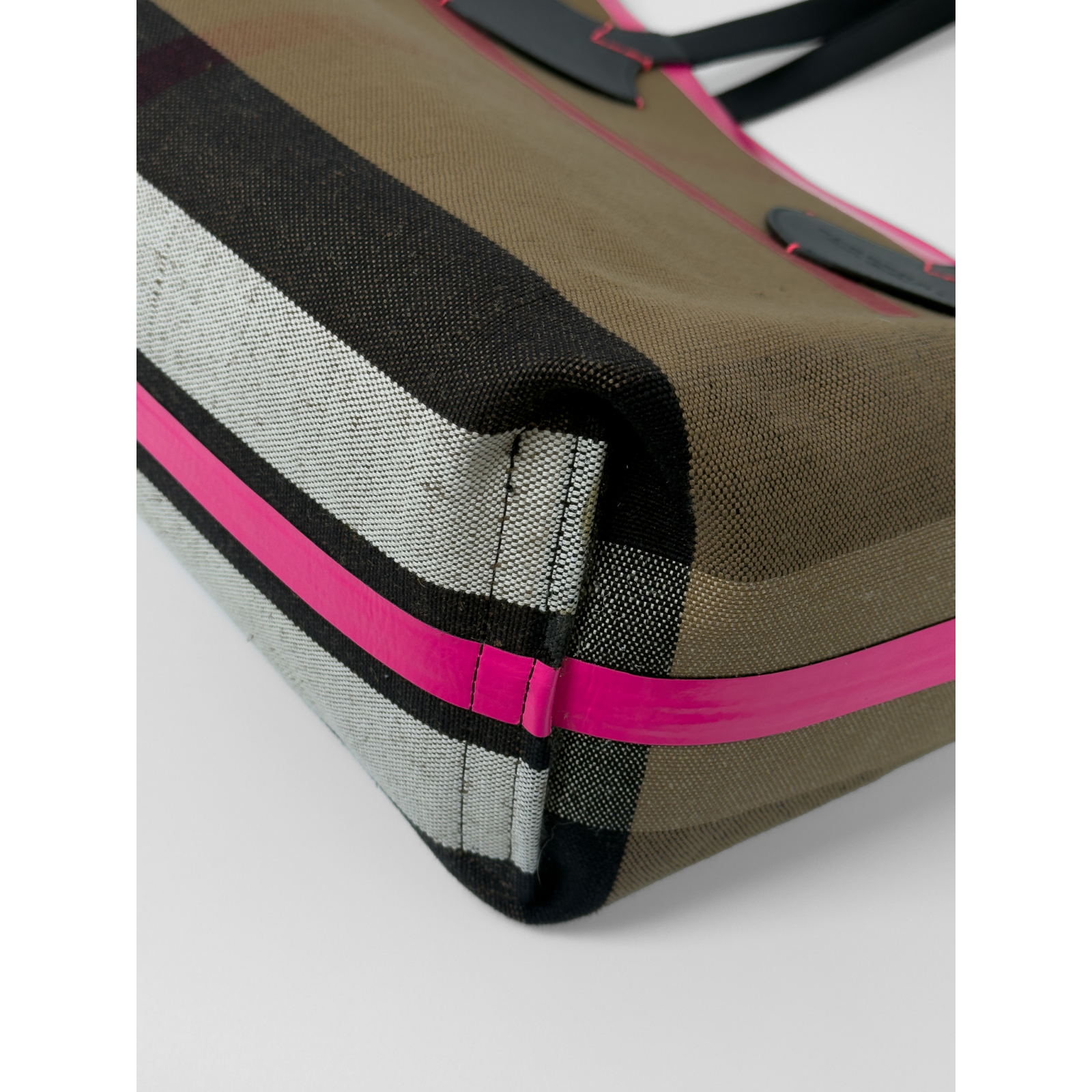 "Dwustronna torebka typu shopper. czarna/ w charakterystyczną dla marki kratę, różowa lamówka, dwa czarne skórzane uchwyty na ramię wykończone logo marki, worek przeciwkurzowy w komplecie. Stan bardzo dobry, posiada delikatnie przetarte rogi ze śladami kleju. Wymiary: szerokość 36cm, wysokość 31cm, głębokość 15cm."