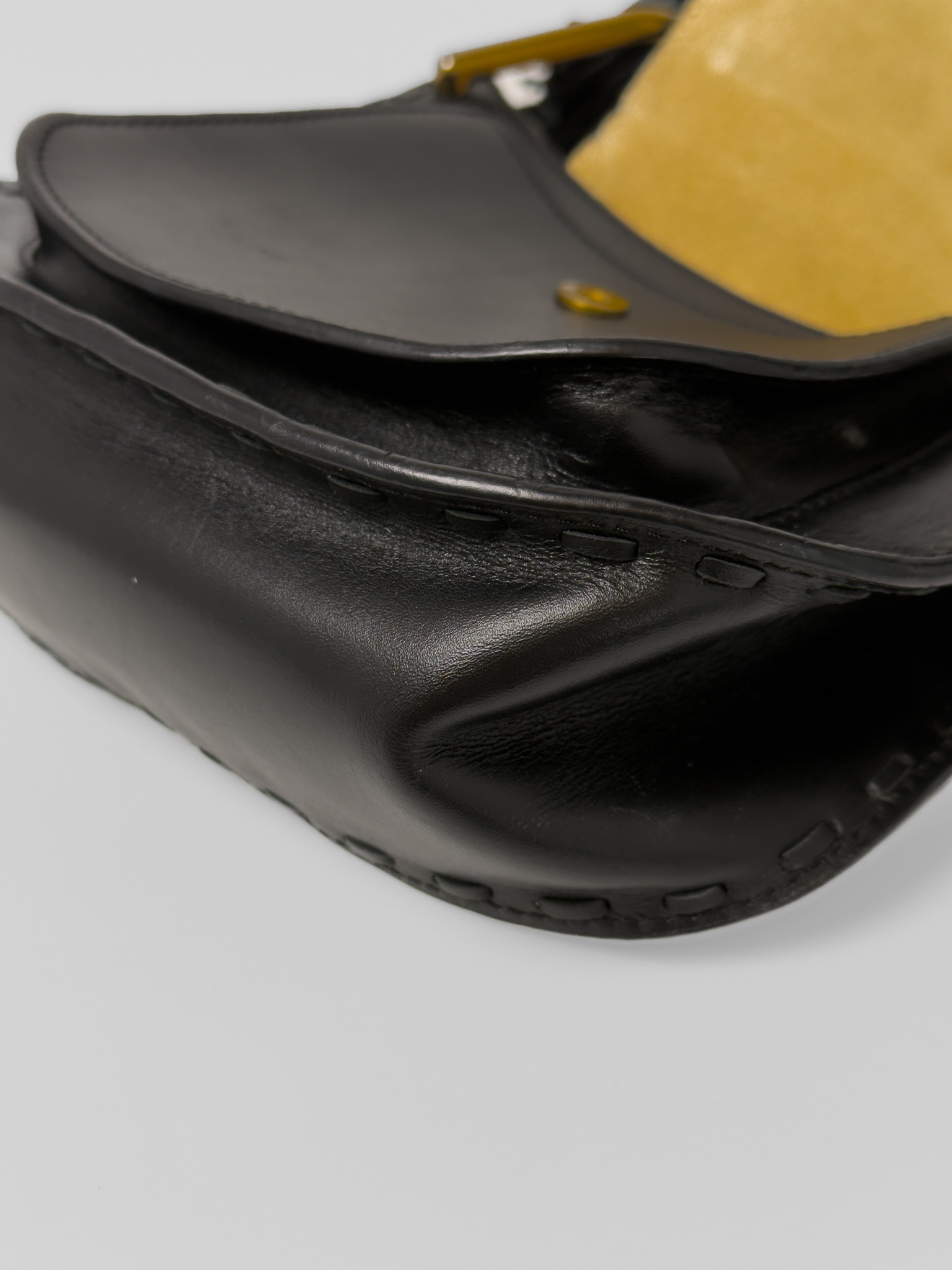 "Czarna skórzana torebka ozdobiona zamszowymi chwostami, zaokrąglony kształt, wytłaczane logo marki na przodzie, skórzany, regulowany pasek na ramię, złotym okucia, gładka skóra, zapięcie magnetyczne, beżowe zamszowe wnętrze, jedna komora, kieszeń pod klapą, używana. Stan dobry, posiada rysy na skórze. Wymiary: szerokość 24cm, wysokość 17cm, głębokość 9cm."