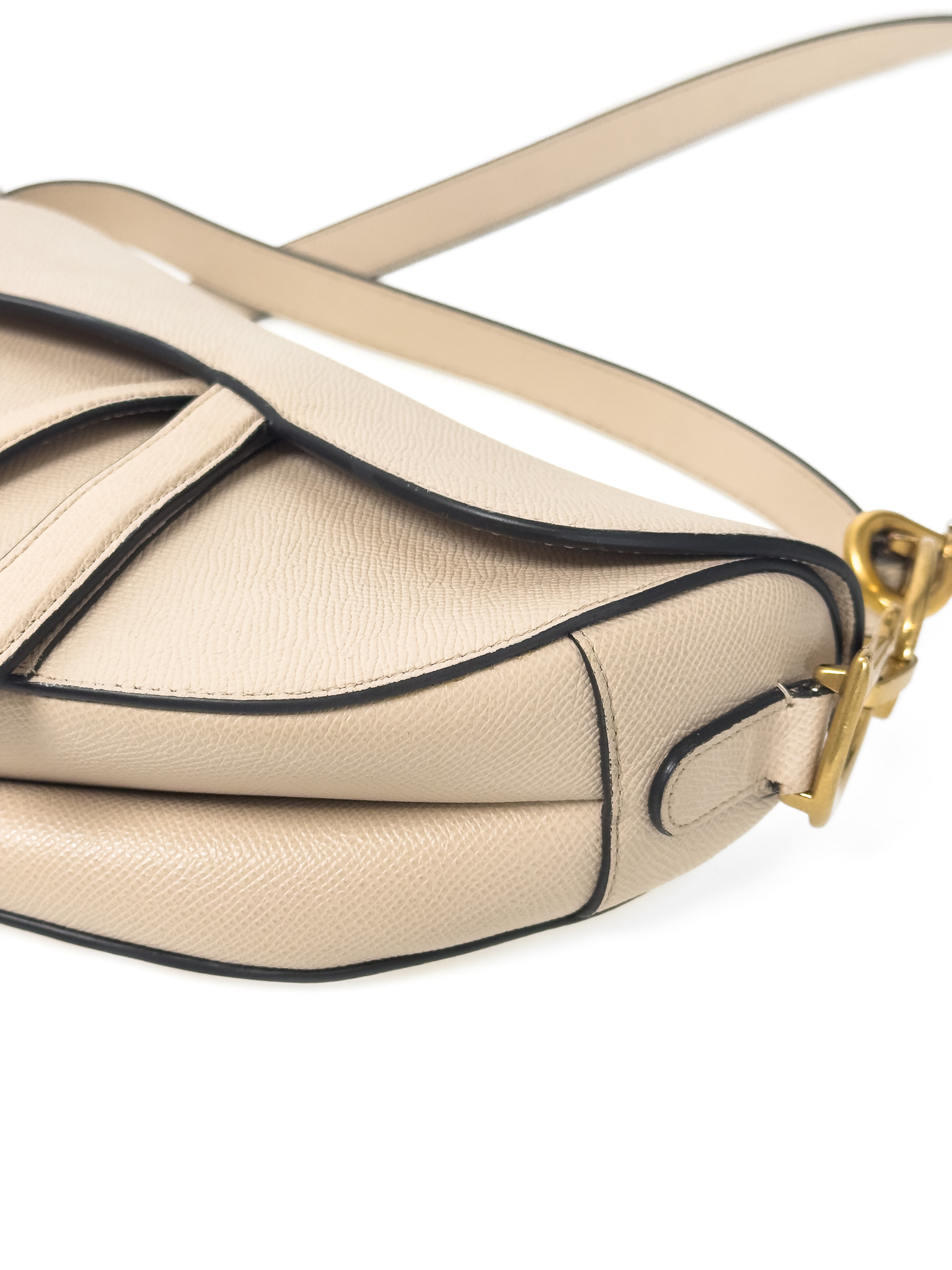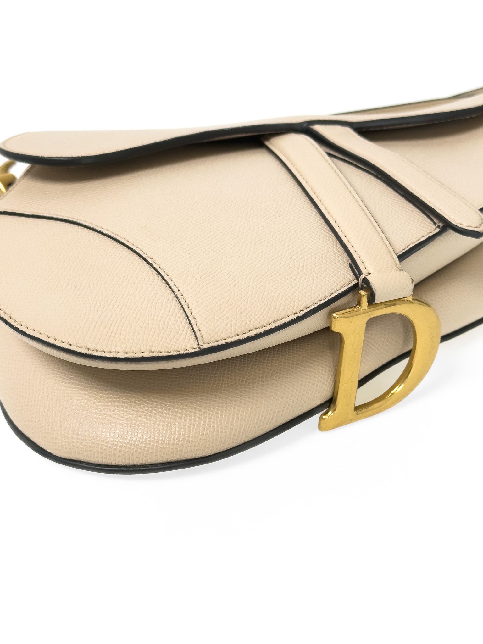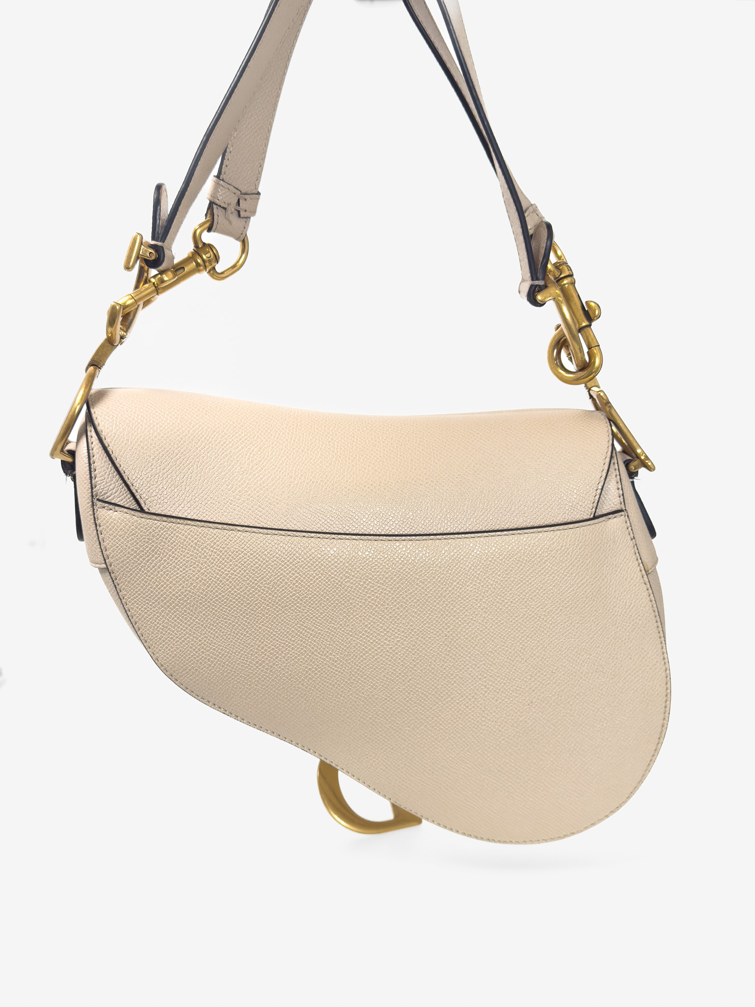 "Jasnobeżowa skórzana torebka na ramię w kształcie siodła, zapinana na magnes pod klapą ozdobioną dużym złotym inicjałem marki, dwa paski na ramię różnej długości, kieszeń w tylnej części, zamszowe wnętrze, jedna komora z zasuwaną kieszenią, pudełko oraz worek przeciwkurzowy w zestawie. Stan bardzo dobry, metalowe elementy posiadają delikatne rysy oraz przetarcia, minimalne zabrudzenia wewnątrz. Model: Saddle Bag. Wymiary: szerokość 24cm , długość 20cm, głębokość 6cm."