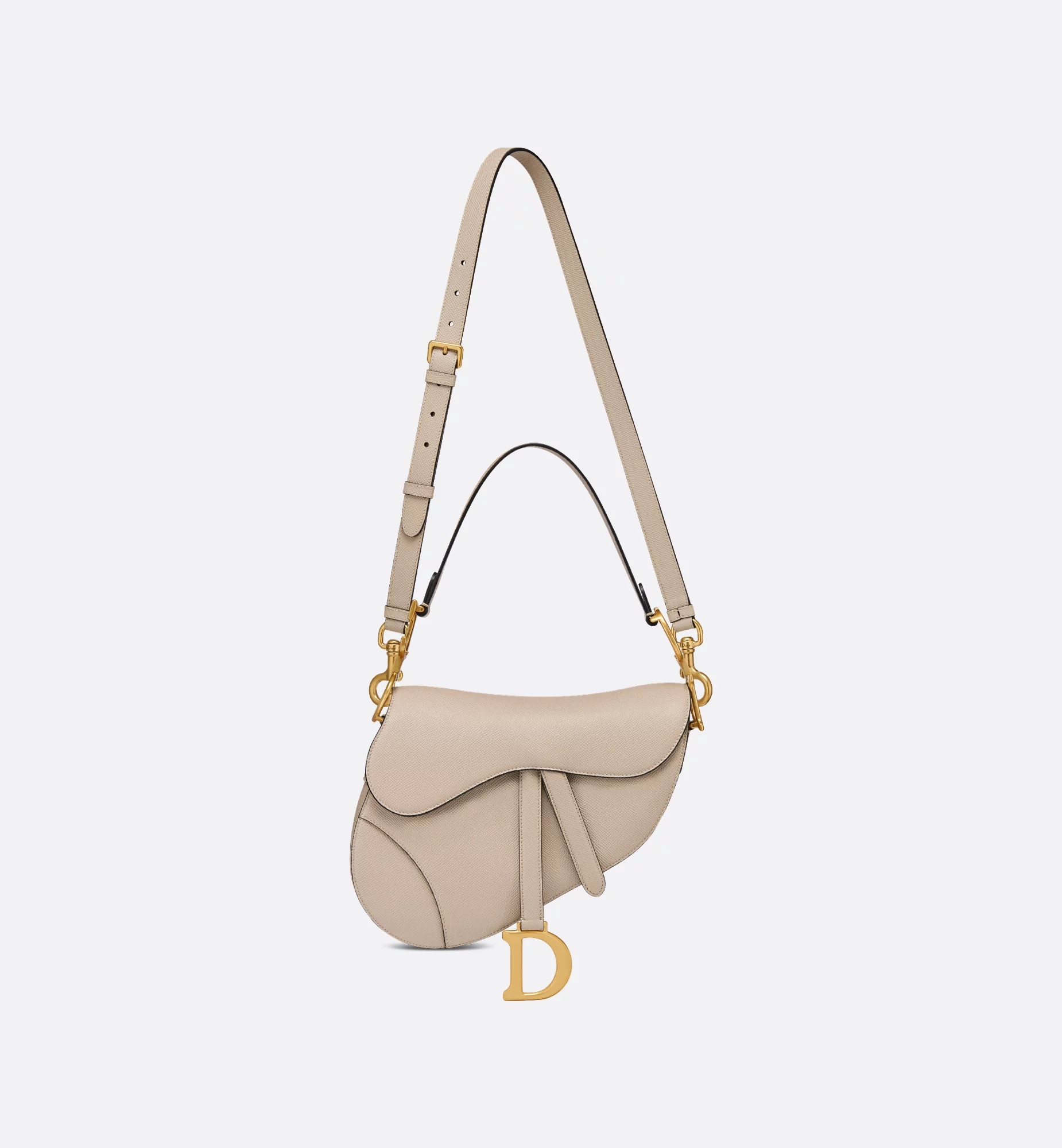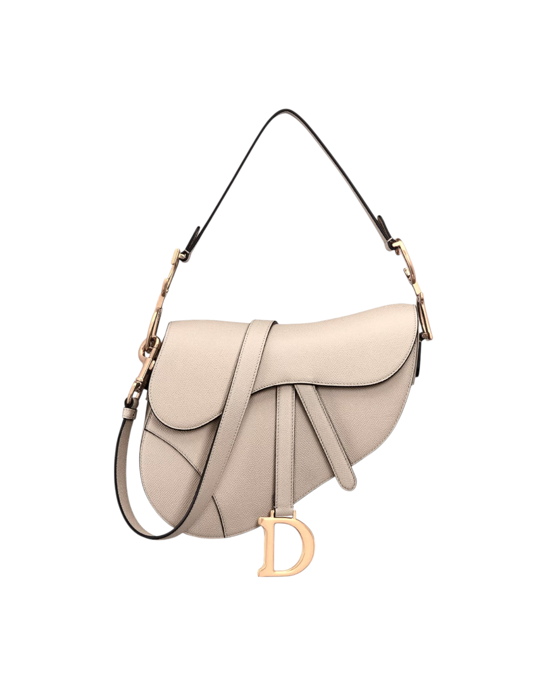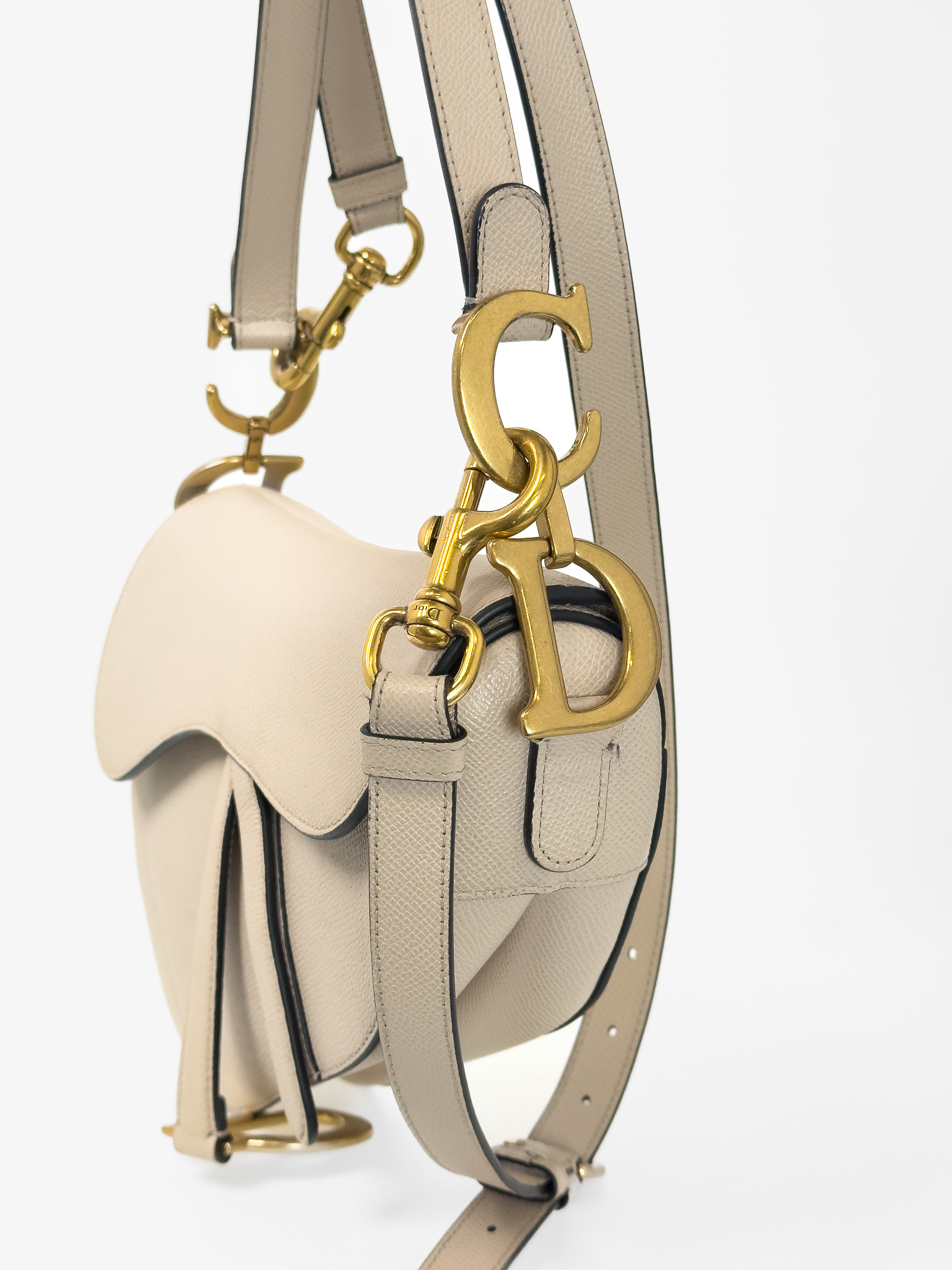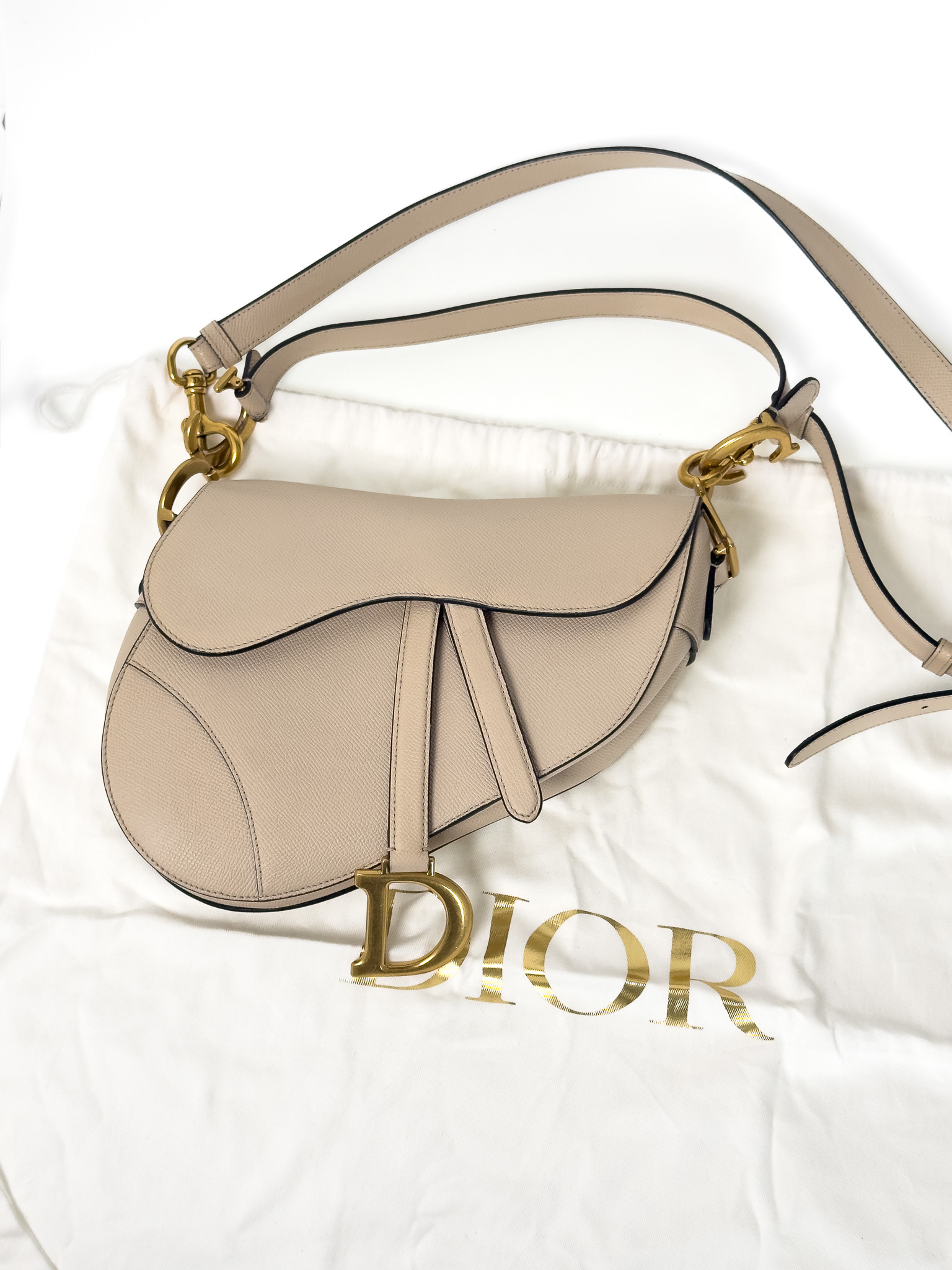 "Jasnobeżowa skórzana torebka na ramię w kształcie siodła, zapinana na magnes pod klapą ozdobioną dużym złotym inicjałem marki, dwa paski na ramię różnej długości, kieszeń w tylnej części, zamszowe wnętrze, jedna komora z zasuwaną kieszenią, pudełko oraz worek przeciwkurzowy w zestawie. Stan bardzo dobry, metalowe elementy posiadają delikatne rysy oraz przetarcia, minimalne zabrudzenia wewnątrz. Model: Saddle Bag. Wymiary: szerokość 24cm , długość 20cm, głębokość 6cm."