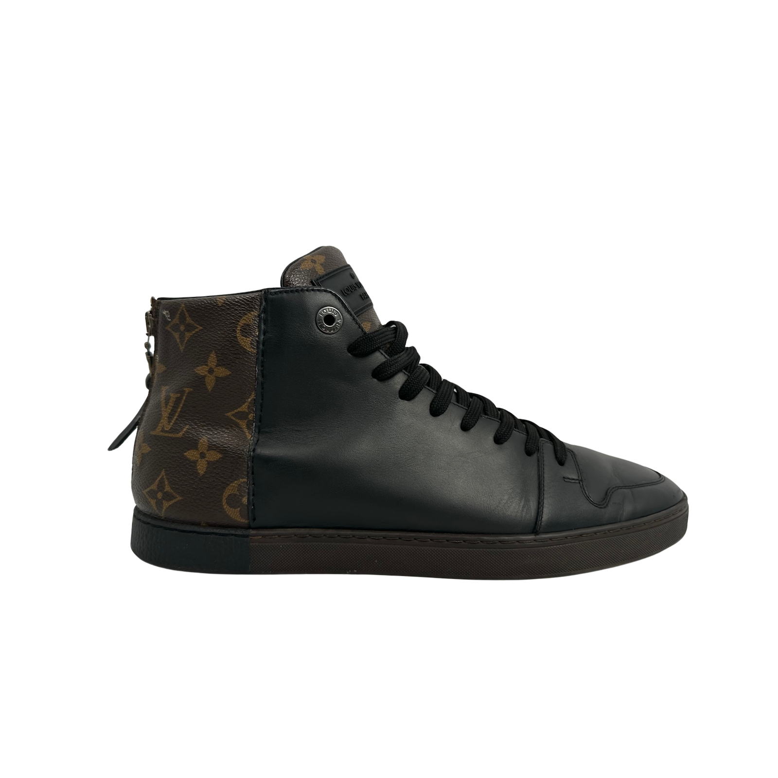 "Czarne skórzane trampki, brązowy monogram z tyłu oraz na języku, zaokrąglone noski, sznurowane oraz zapinane na suwak przy pięcie, czarne gumowe logo marki na języku oraz na tylnej części podeszwy, używane. Stan bardzo dobry. Rozmiar 7,5."