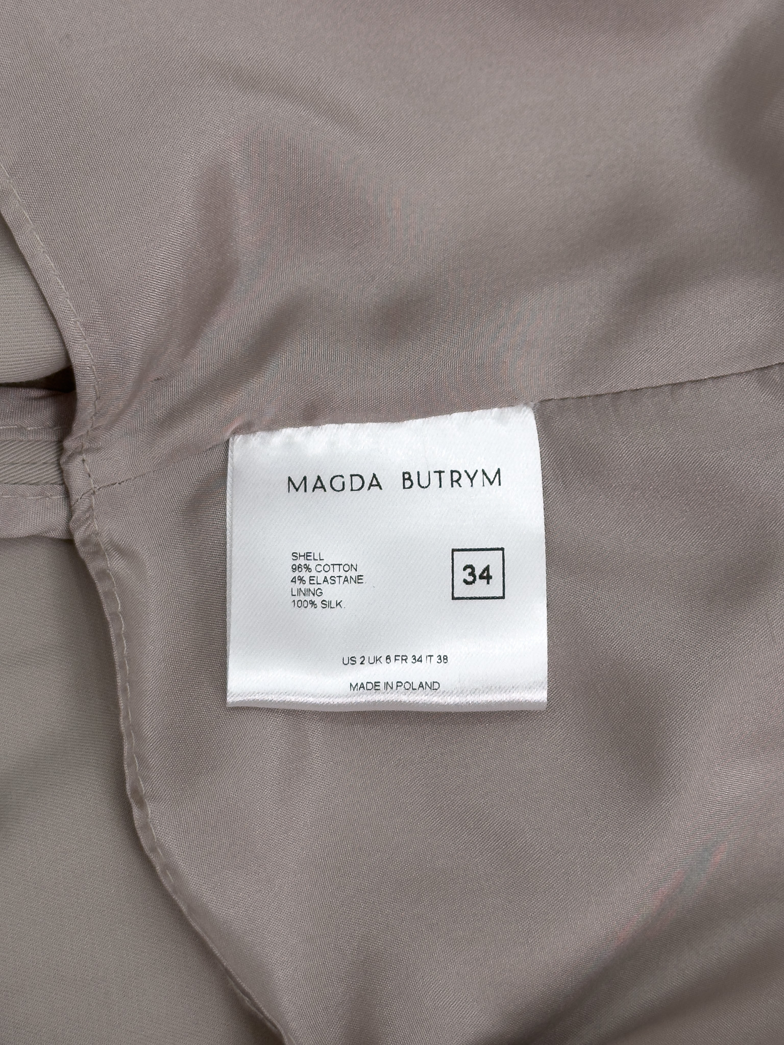 "Trencz w kolorze chłodnego beżu, długi, taliowany, dwurzędowy, zapinany na logowane szylkretowe guziki, poduszki na ramionach, kołnierz, patki, regulowany pasek w pasie oraz przy mankietach, dwie kryte kieszenie po bokach, rozporek. Stan nowy z metką. Rozmiar z metki 34. Skład: 82% bawełna, 18% jedwab; podszewka: 100% jedwab. Wymiary: szerokość mierzona od pachy do pachy 53cm, długość całkowita 130cm."
