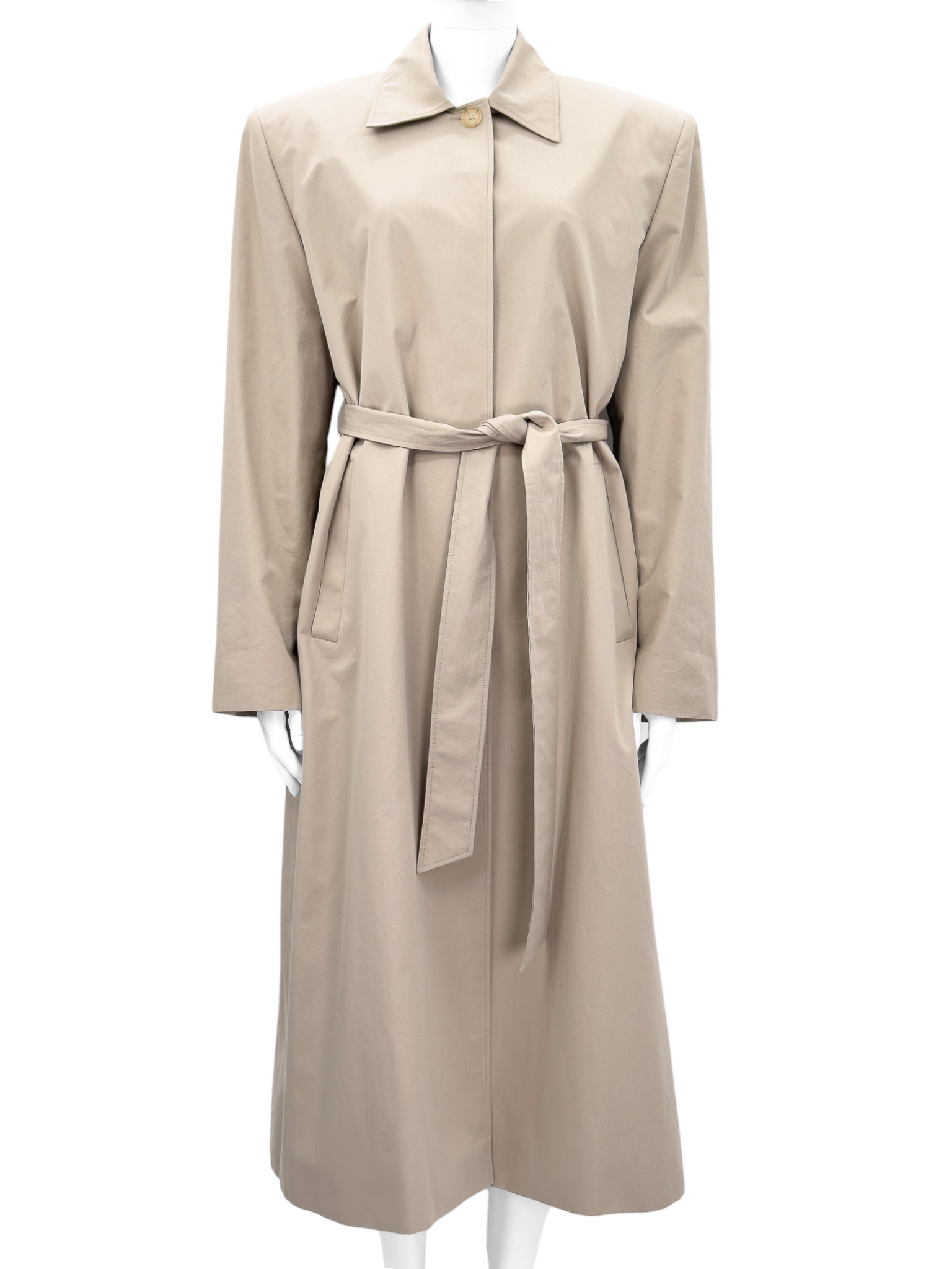 "Beżowy jednorzędowy płaszcz, zapinany wzdłuż na logowane guziki, dwie kryte kieszenie po bokach, poduszki na ramionach, rozporek, pasek w zestawie. Nowy z metkami. Rozmiar z metki 34. Skład: 100% bawełna; podszewka: 100% jedwab. Wymiary: szerokość mierzona od pachy do pachy 60cm, długość całkowita 127cm."