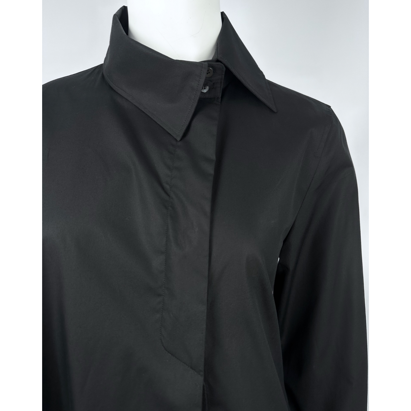 "czarna koszulowa tunika zapinana z przodu na kryte guziki, długi rękaw z mankietem, boczne kieszenie. Rozmiar IT 42. Skład: 100 % bawełna. Wymiary: szer. ramion 41 cm, szer. biustu 49 cm, szer. talii 52 cm, dł. całkowita 90 cm, dł. rękawa 66 cm."