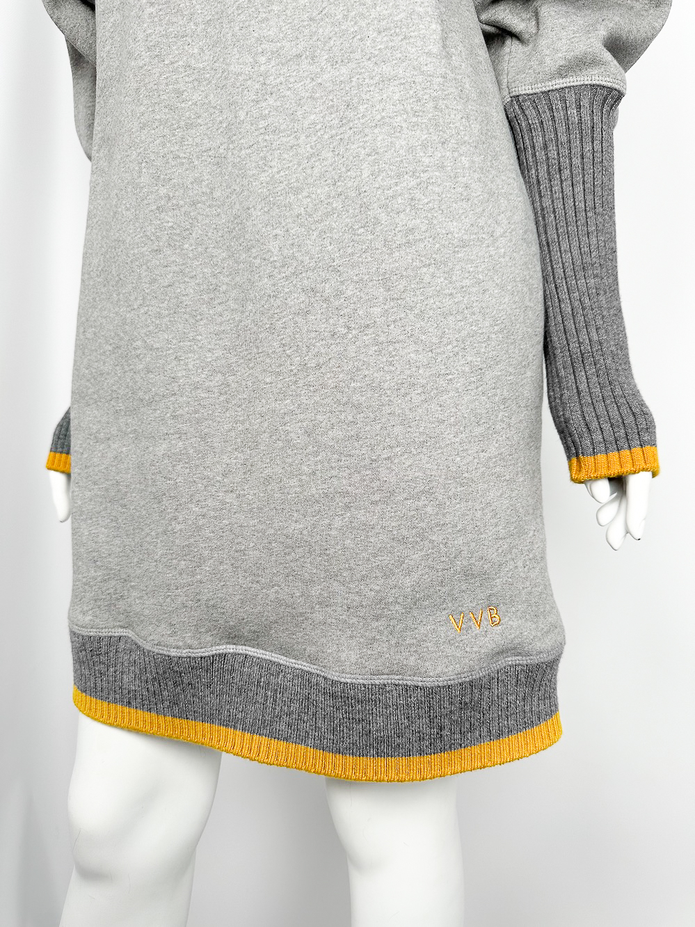 "Szara tunika z dekoltem w serek na plecach, szaro - żółte ściągacze w rękawach oraz na dole tuniki, żółte logowanie marki w rogu sukienki. Rozmiar S z metki. Skład : 100% bawełna. Wymiary: szerokość mierzona od pachy do pachy 50,5cm, długość rękawa 53cm, długość całkowita 90cm."
