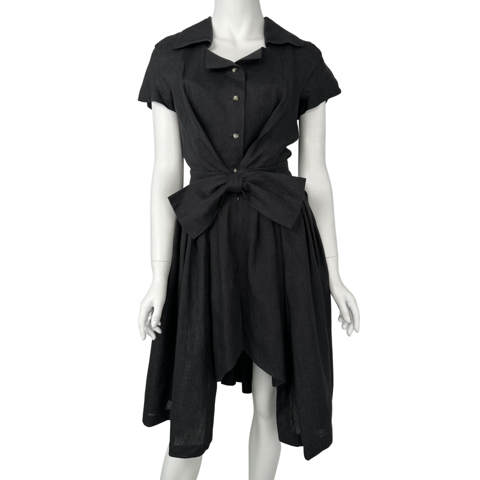 "grafitowa lniana sukienka w stylu szmizjerki, rozkloszowana, z krótkim rękawem, z przodu zapinana na guziki, duża kokarda w talii, asymetryczny dół, skład: 100% lnu, roz.40. Wymiary: szerokość pod pachami 44 cm, długość 103 cm."