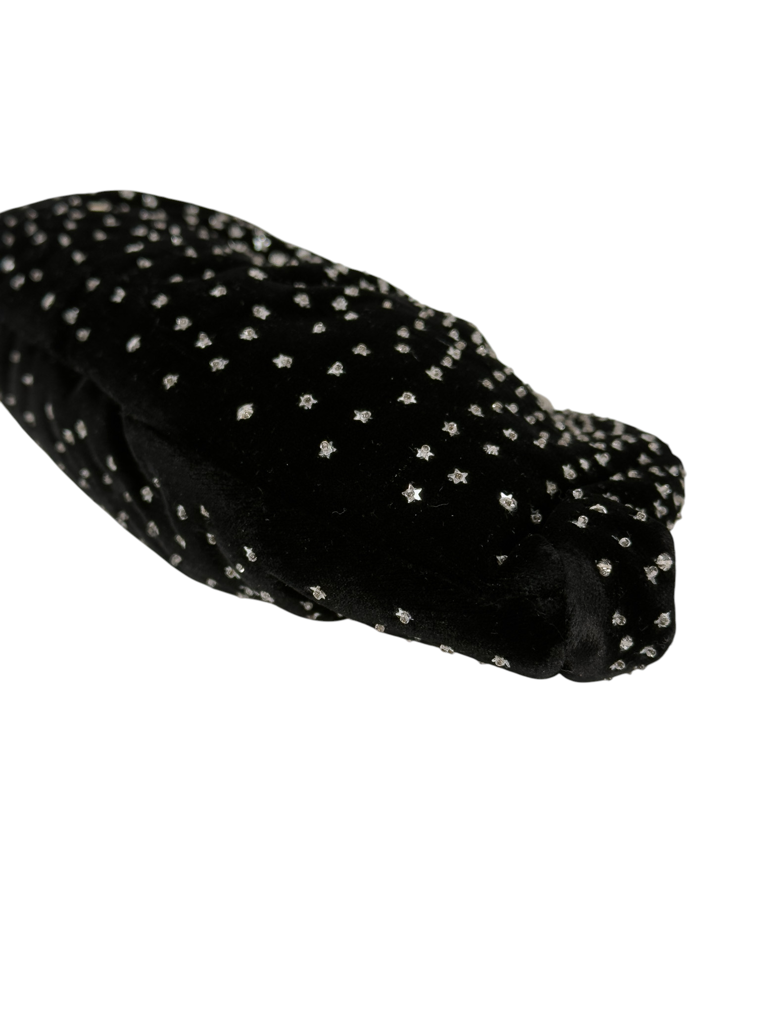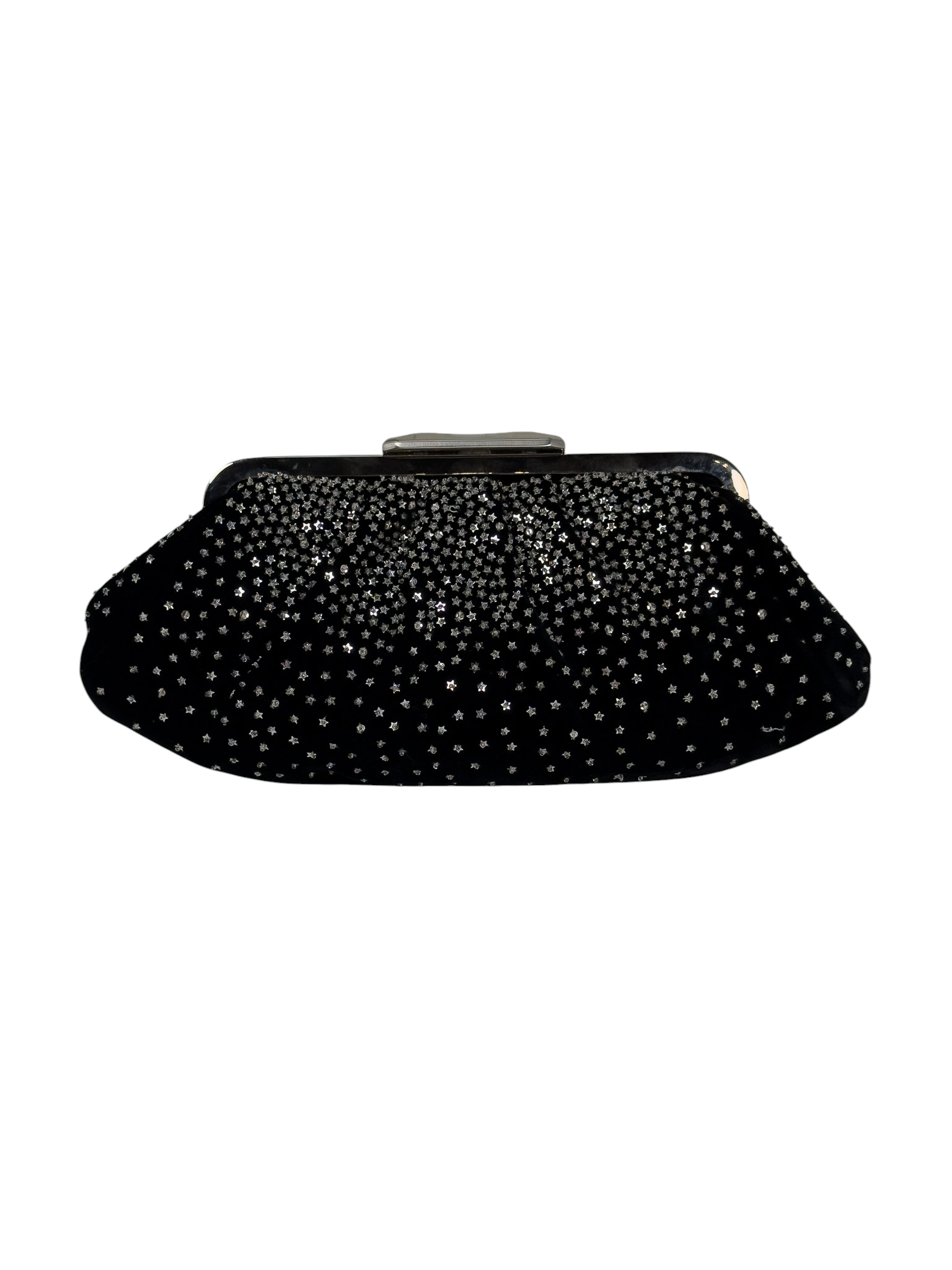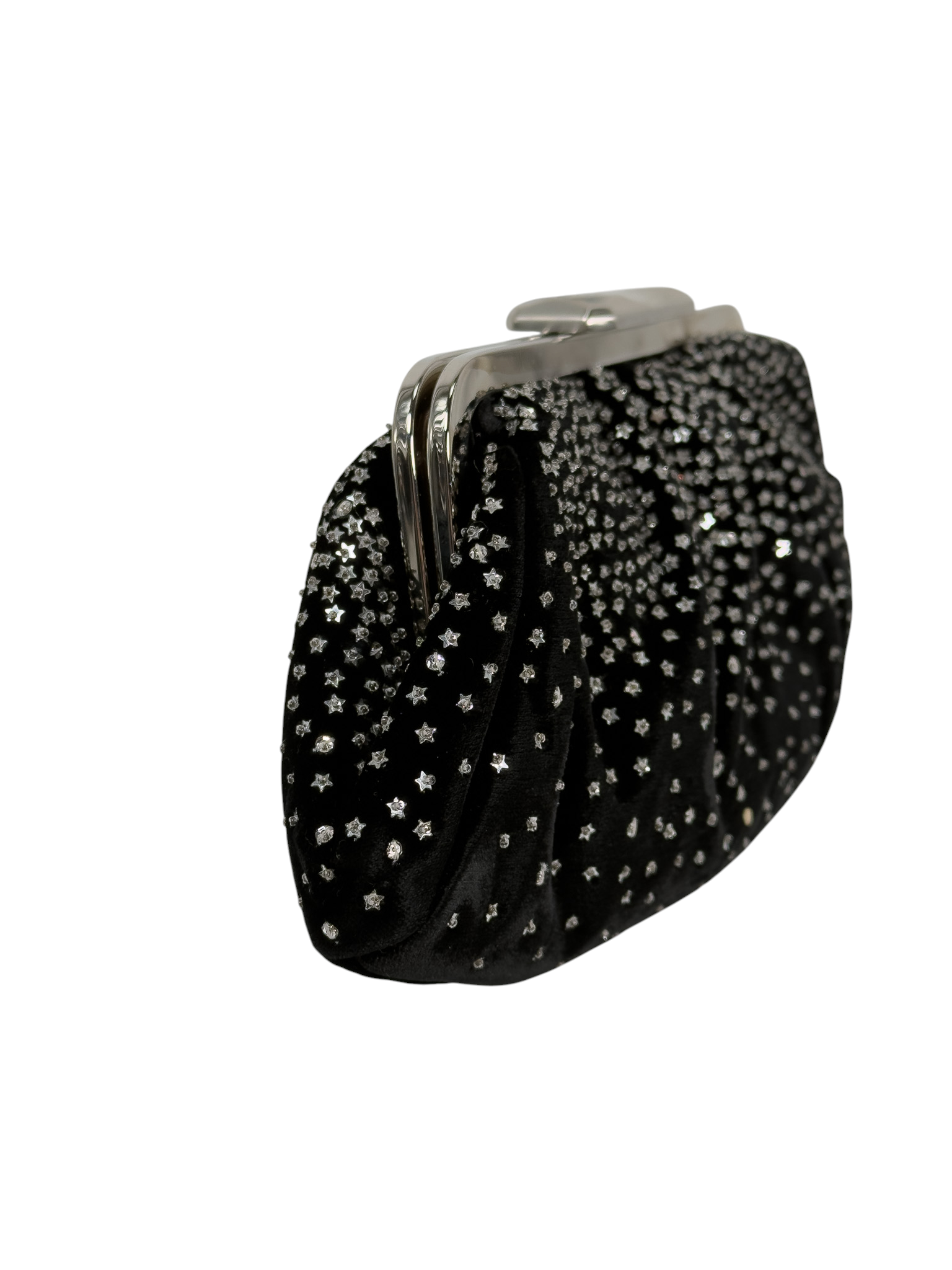 "Czarna welurowa kopertówka ozdobiona naszywanymi drobnymi srebrnymi gwiazdkami, zapinana na srebrny zatrzask, worek przeciwkurzowy w komplecie."