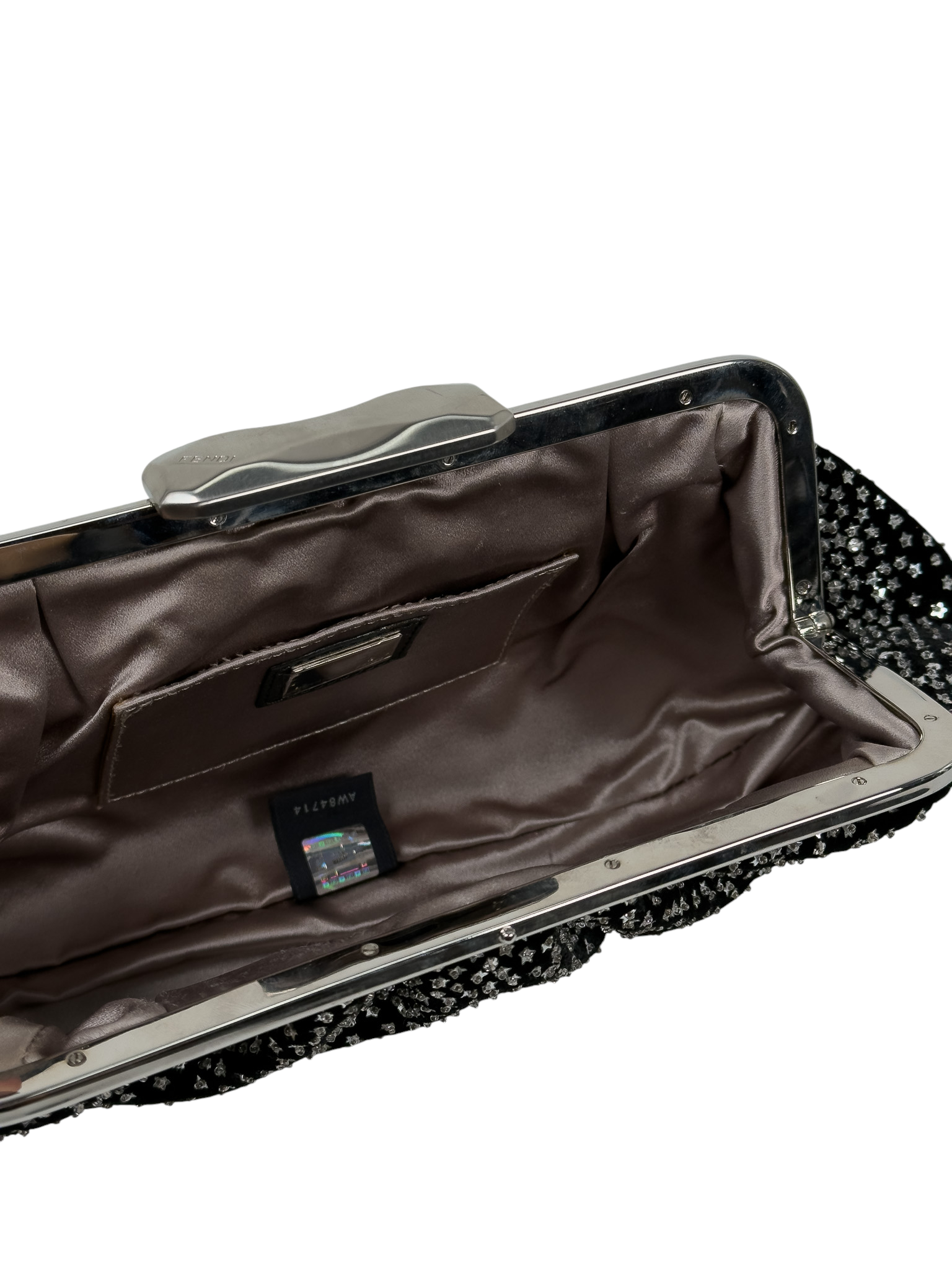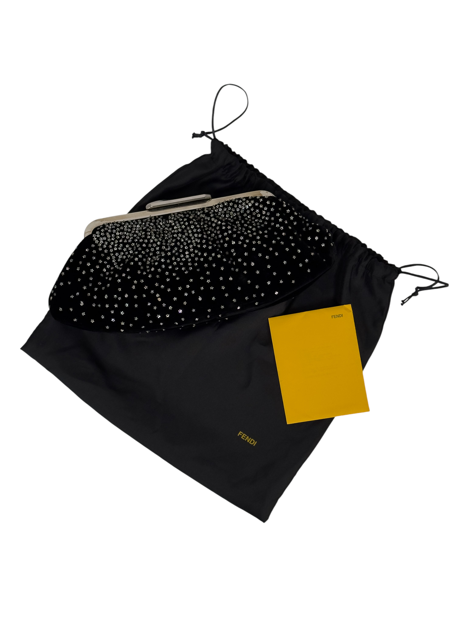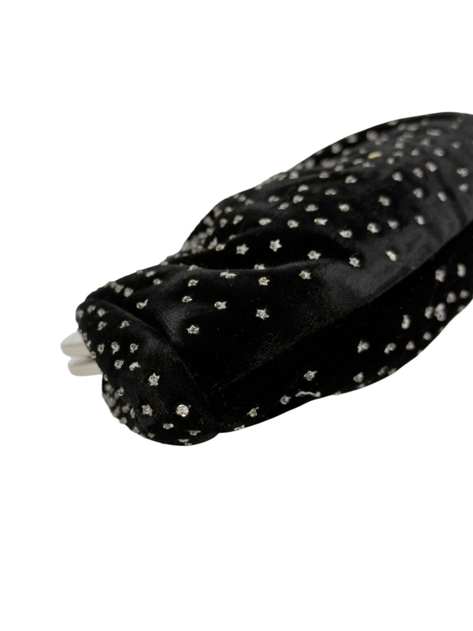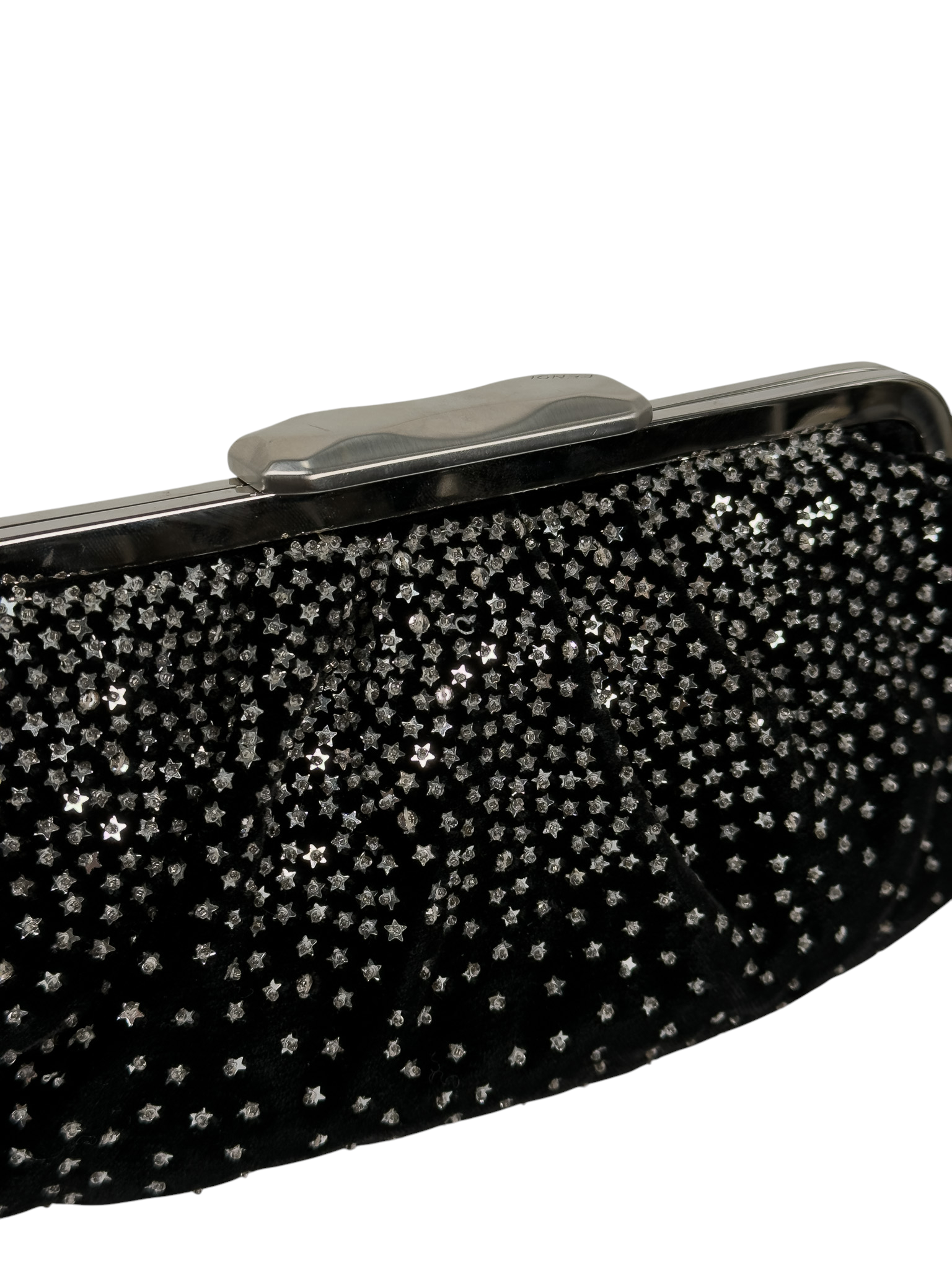 "Czarna welurowa kopertówka ozdobiona naszywanymi drobnymi srebrnymi gwiazdkami, zapinana na srebrny zatrzask, worek przeciwkurzowy w komplecie."