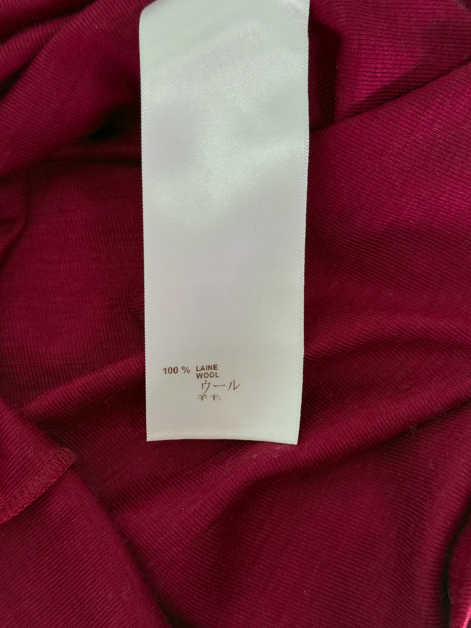 "Bordowa wełniana bluzka z krótkim rękawem, prosty krój, regulowane rękawy welurowymi czarnymi wstawkami oraz złotymi logowanymi detalami, zaokrąglony dekolt. Rozmiar z metki M. Skład: 100% wełna. Wymiary: szerokość mierzona od pachy do pachy 49cm, długość całkowita 62cm."