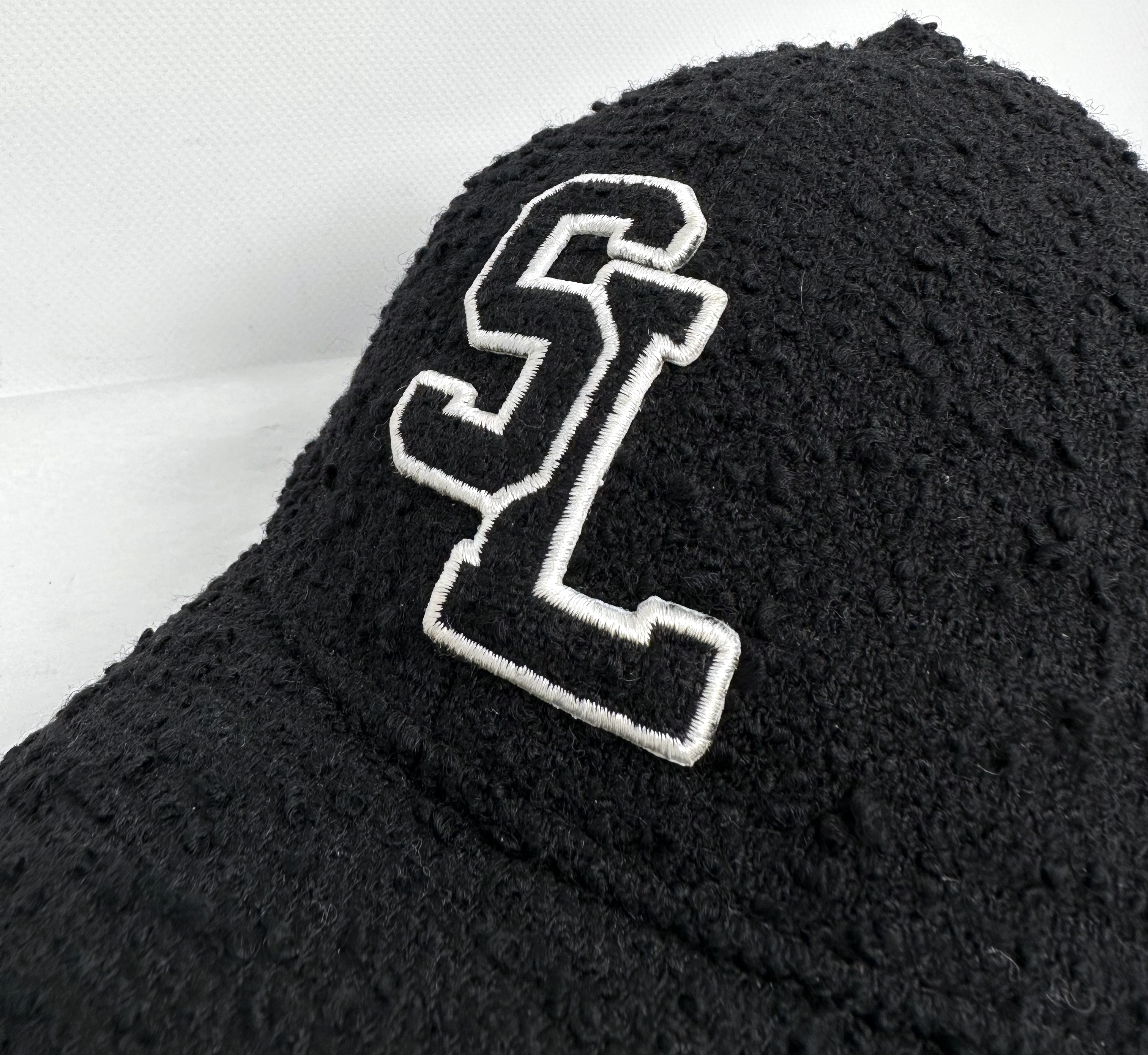 "Czarna wełniana czapka z daszkiem, biało-czarna naszywka z inicjałami marki na przodzie, regulowana w tylnej części, klamra z logo marki. Rozmiar z metki 57. Skład: 93% wełna, 7% poliamid; podszewka: 65% poliester, 35% bawełna."