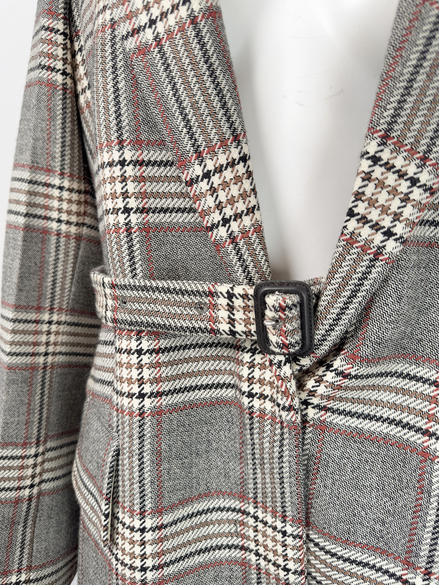 "Szara wełniana marynarka w kratę w odcieniach czerwieni, bieli, czerni oraz brązu, proste rękawy, zapinana na dwa guziki na przodzie, regulowany pasek w pasie, podszewka w kolorze słomkowym, dwie kieszenie z klapami na przodzie, poduszki na ramionach, głęboki dekolt w szpic, jedna zaszyta kieszeń na wysokości biustu. Rozmiar z metki EU 34. Skład: 100% wełna dziewicza; podszewka: 100% wiskoza. Wymiary: długość rękawa 65cm, długość całkowita 79cm, szerokość mierzona od pachy do pachy 49cm."