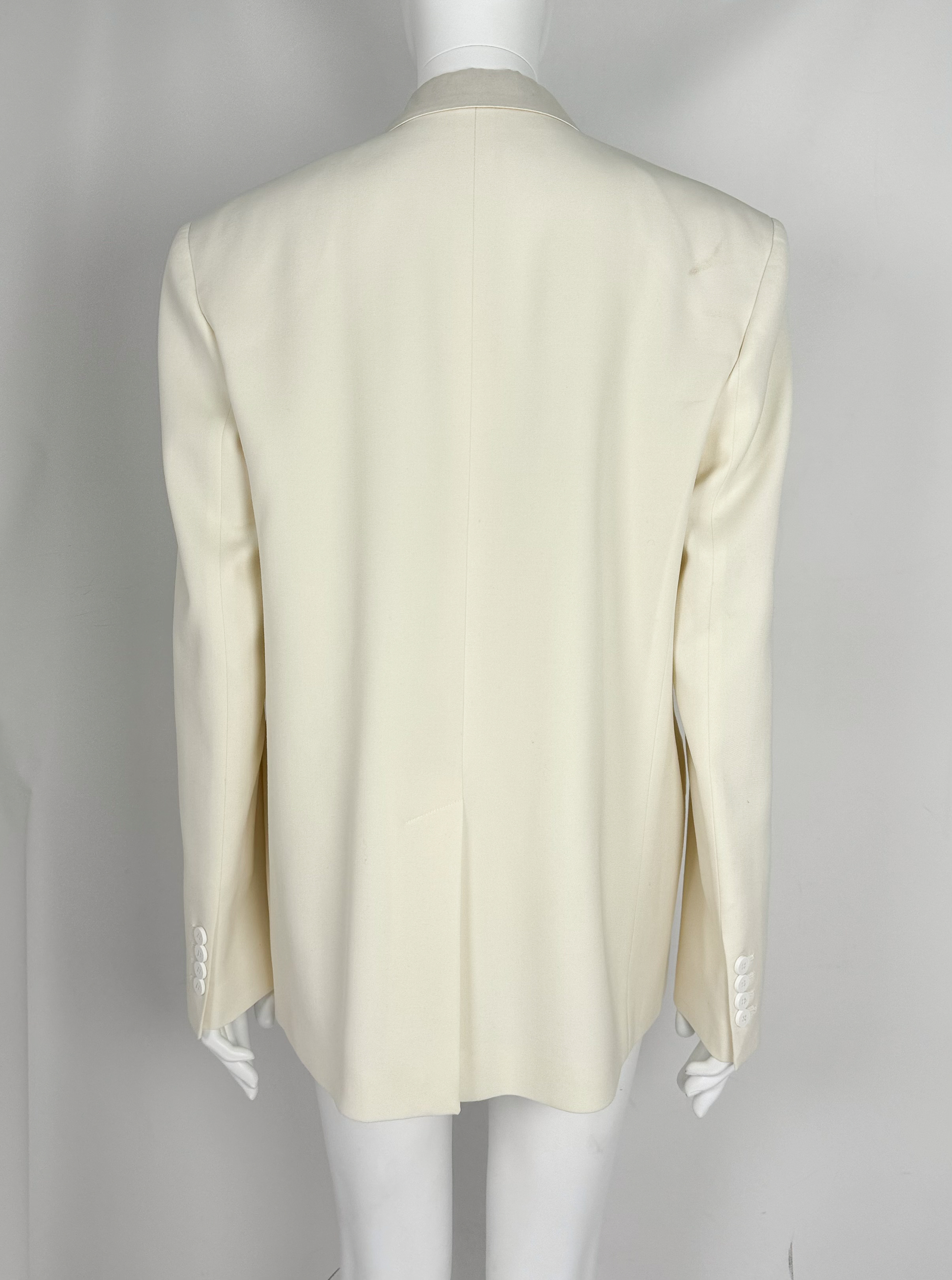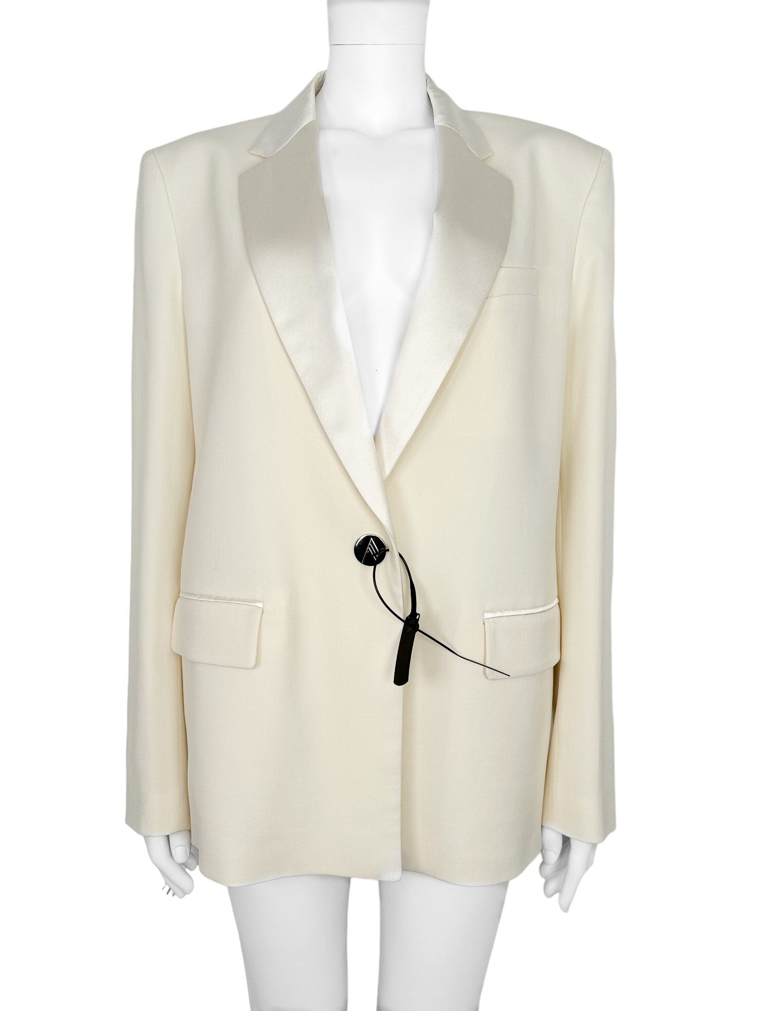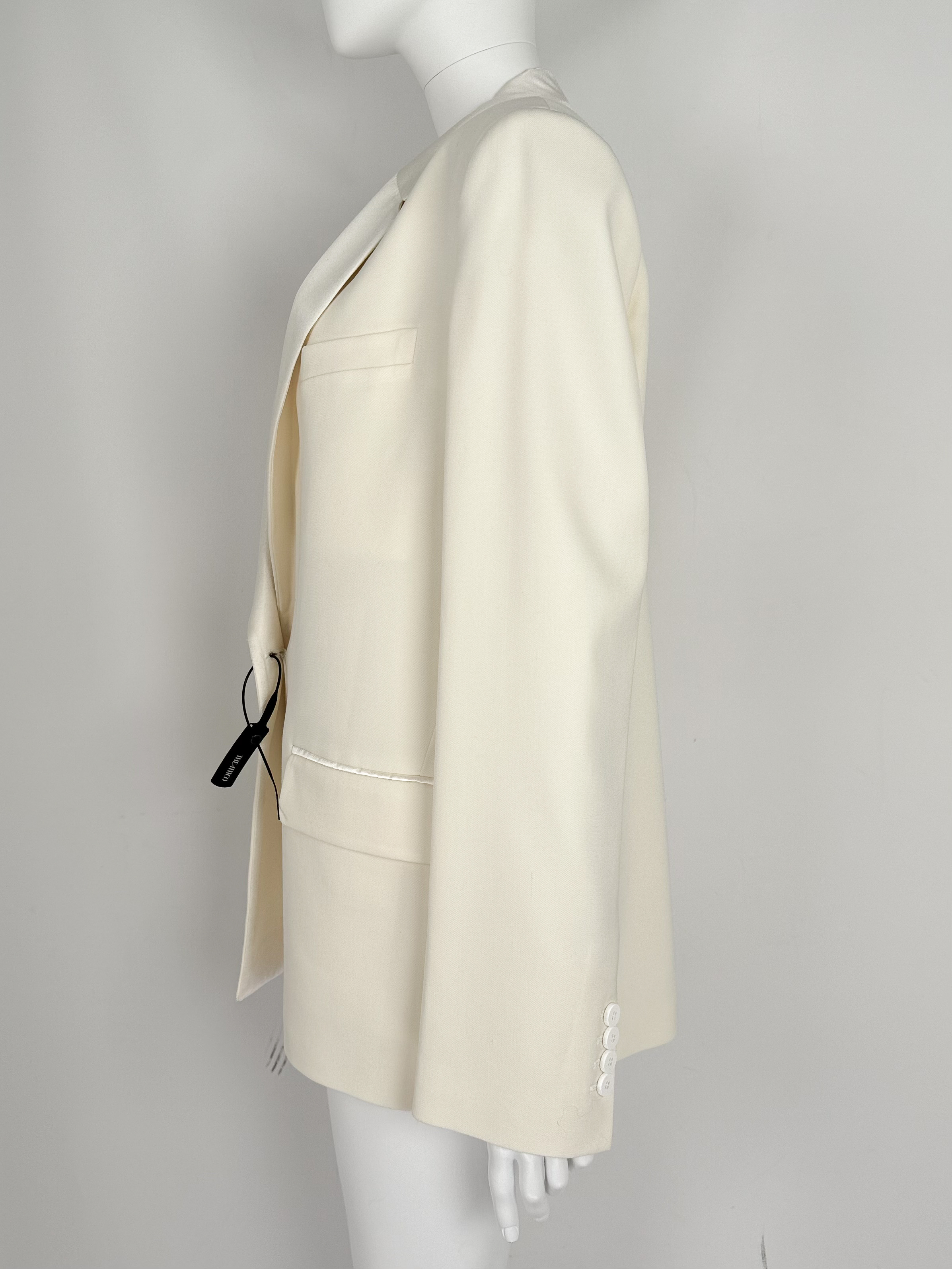 "Model Bianca. Kremowa marynarka zapinana na jeden srebrny guzik, krój oversize. Stan nowa z metkami. Skład: 98% wełna dziewicza, 2% elastan. Pokrowiec w zestawie. Rozmiar z metki 42. Wymiary: szerokość mierzona od pachy do pachy 54cm, długość całkowita 76cm."