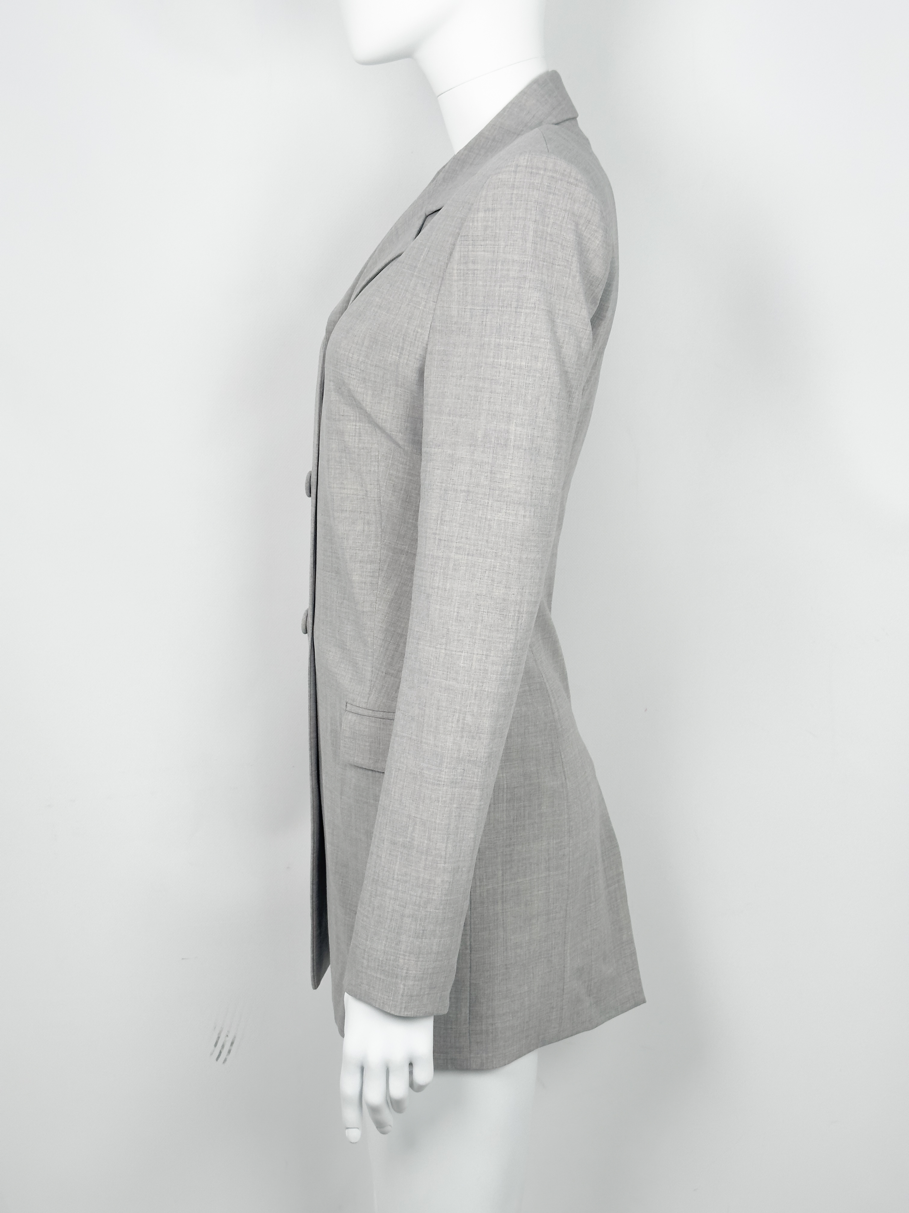 "Jasnoszara wełniana marynarka zapinana na trzy guziki, taliowana, dłuższy krój, proste przeszycia, rozporek, poduszki na ramionach, dwie zaszyte kieszenie z klapami po bokach, mankiety zapinane na cztery guziki. Stan bardzo dobry. Rozmiar z metki 34. Skład: 96% wełna, 4% elastan; podszewka: 90% jedwab, 10% elastan. Wymiary: szerokość mierzona od pachy do pachy 45cm, długość całkowita 80cm."