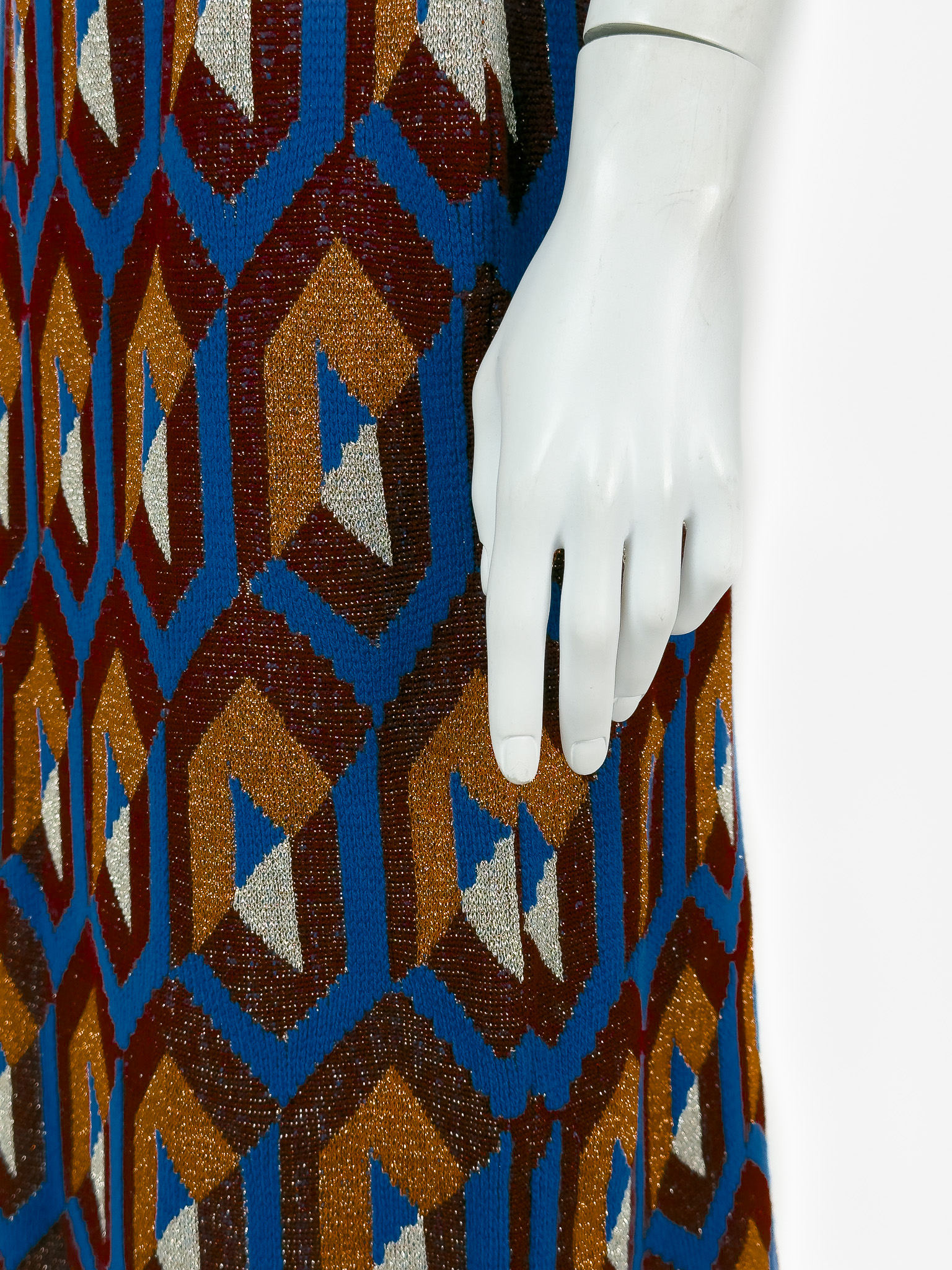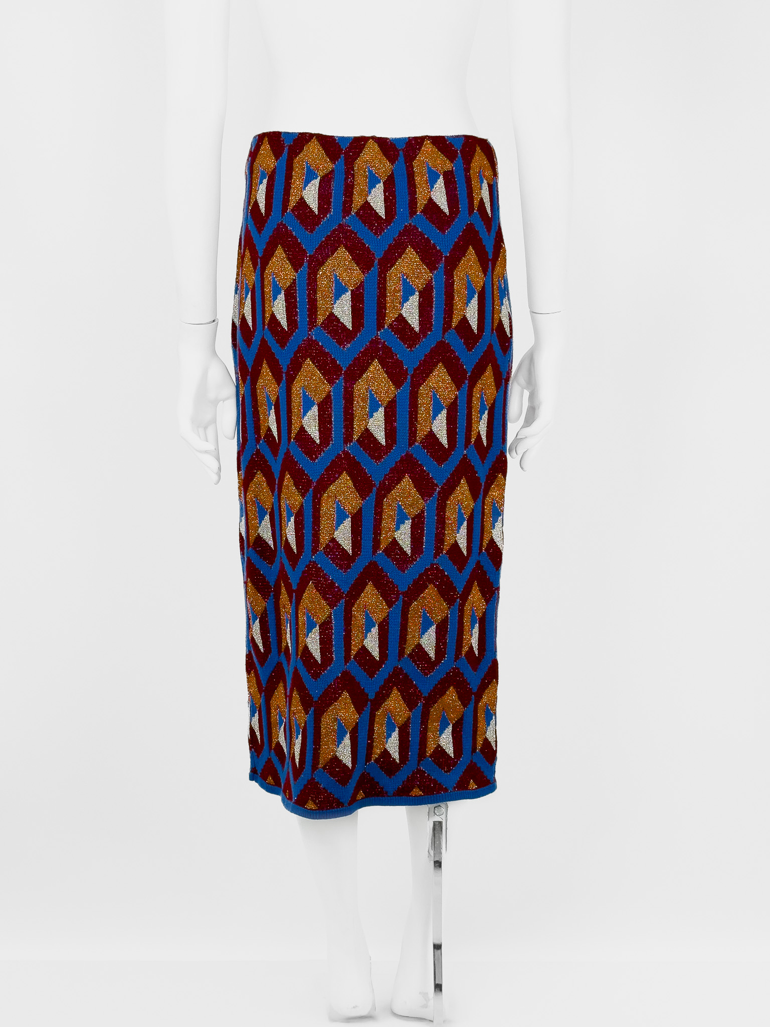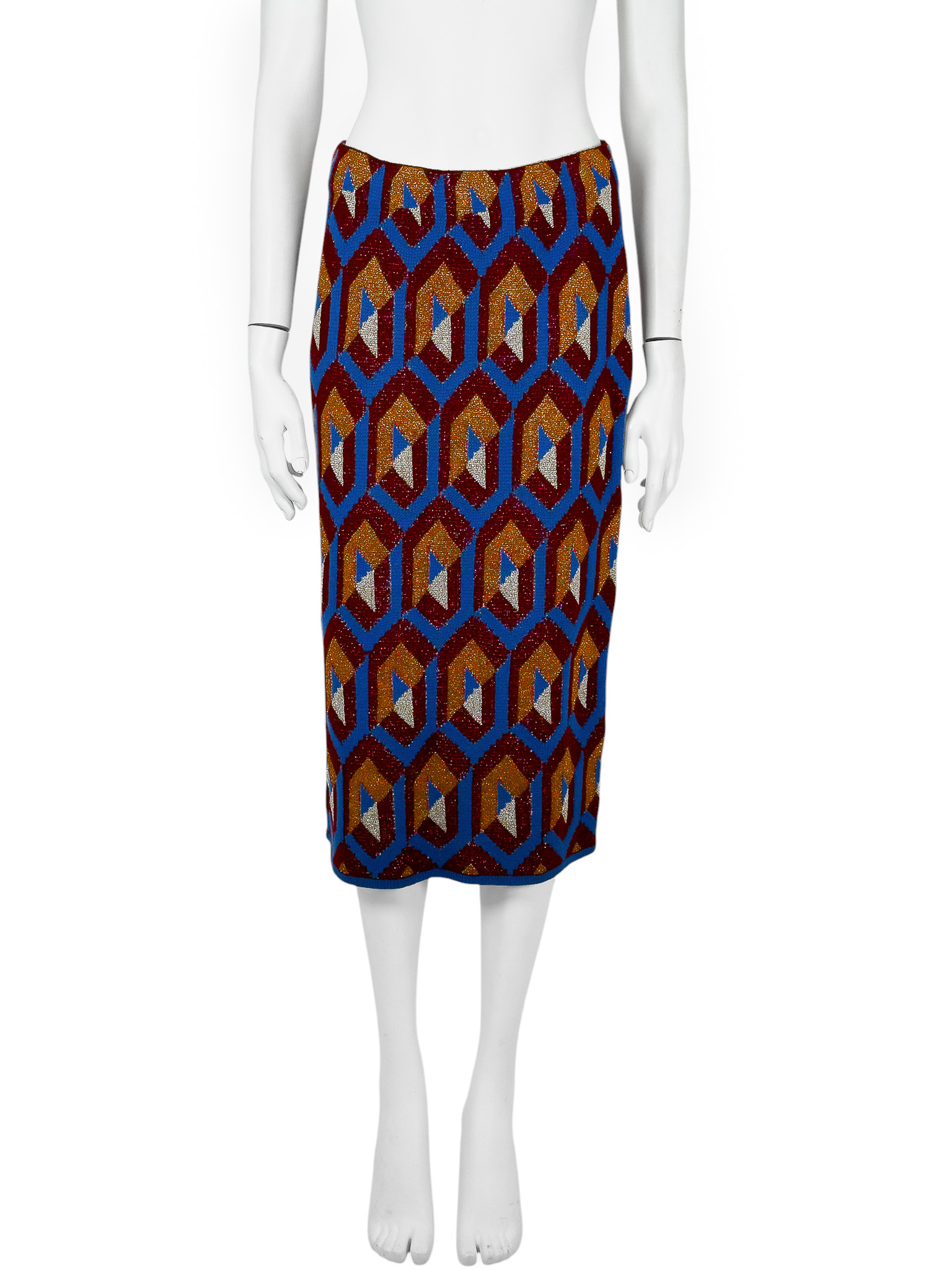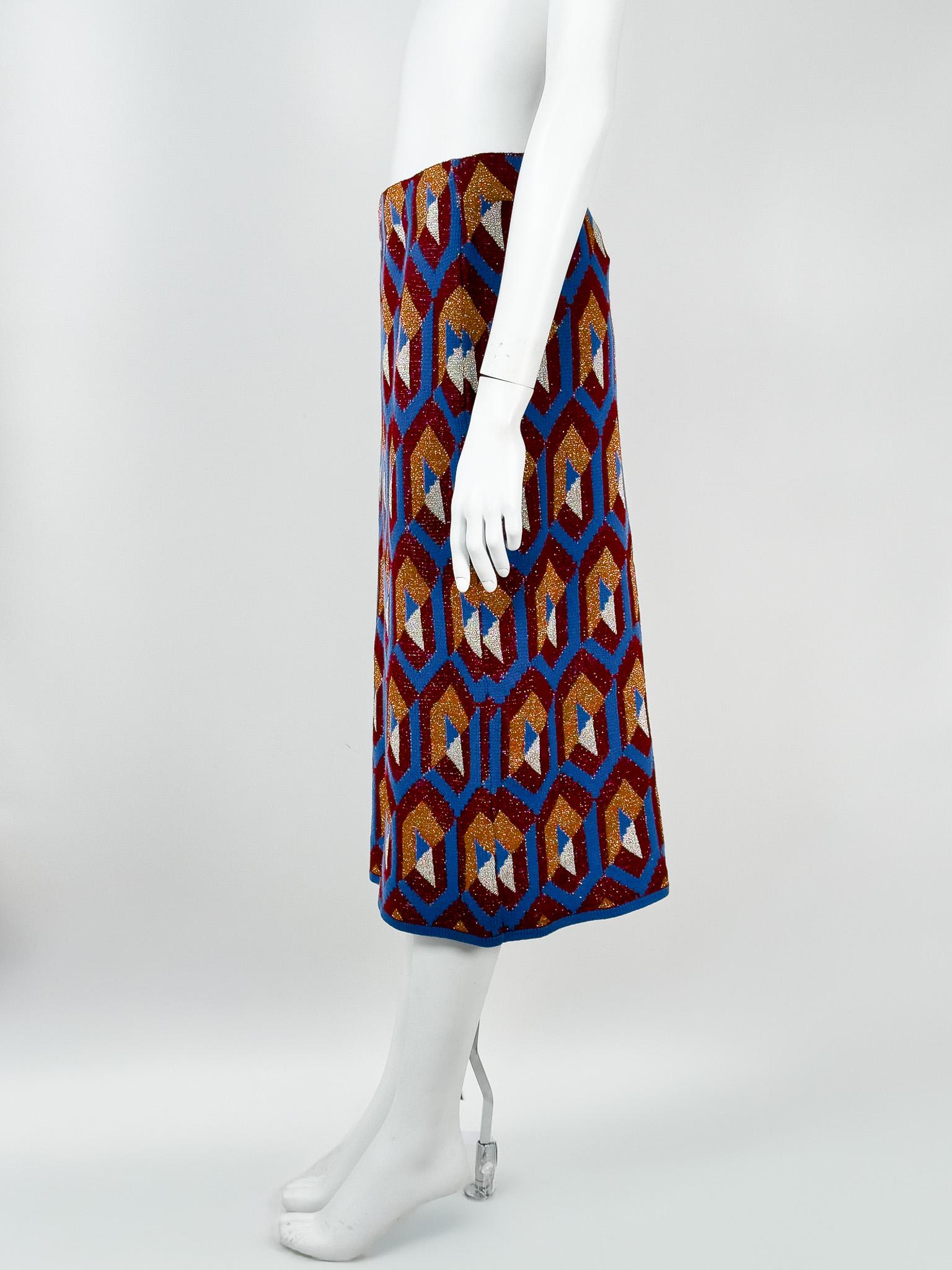 "Niebieska wełniana spódnica w błyszczący pomarańczowo-bordowo-srebrny wzór, prosty, dopasowany krój, za kolano, guma w pasie. Stan bardzo dobry. Rozmiar z metki M. Skład: 32% wełna, 31% wełna merynosów, 24% poliester, 13% metalizowany poliester. Wymiary: szerokość w pasie 37cm, długość całkowita 80cm."