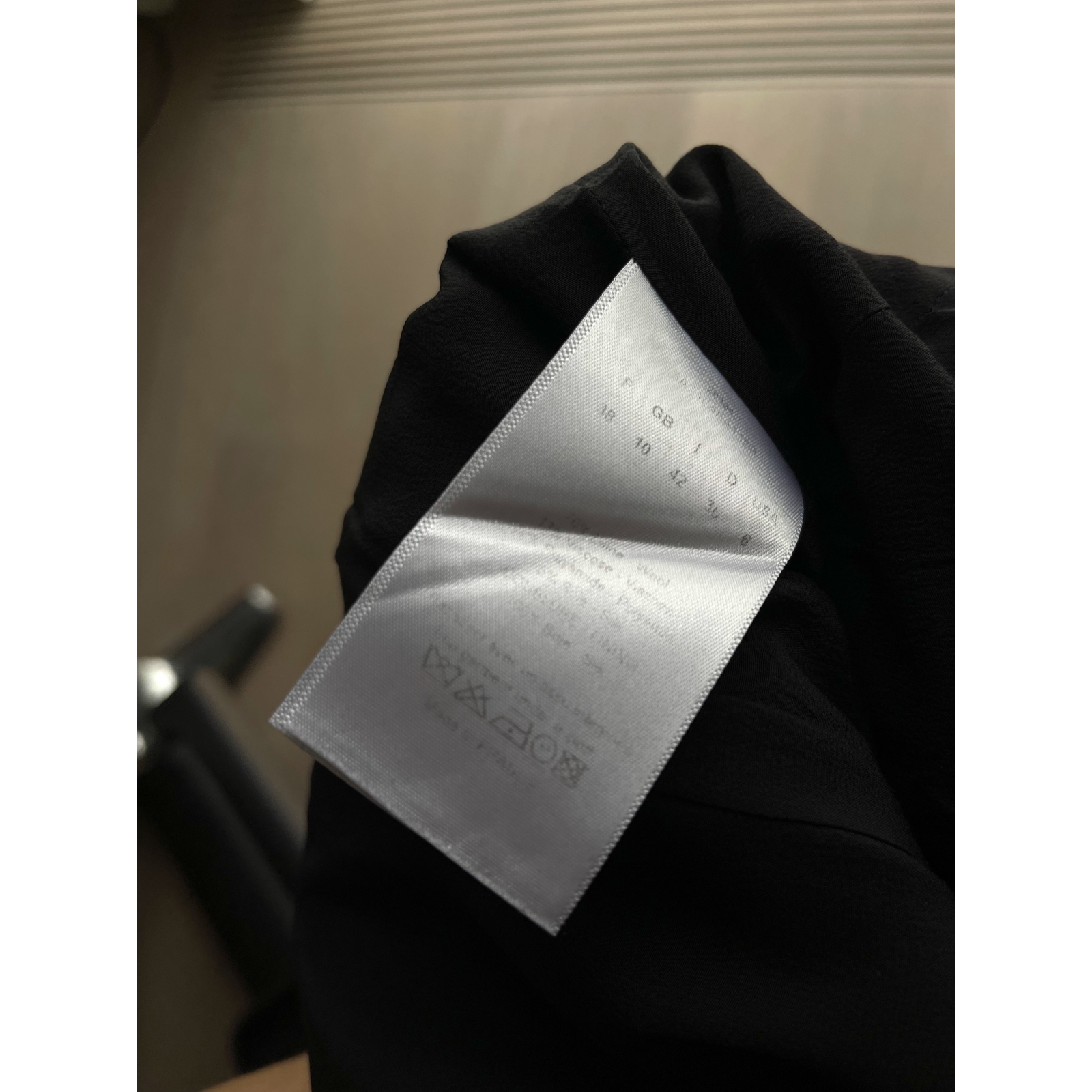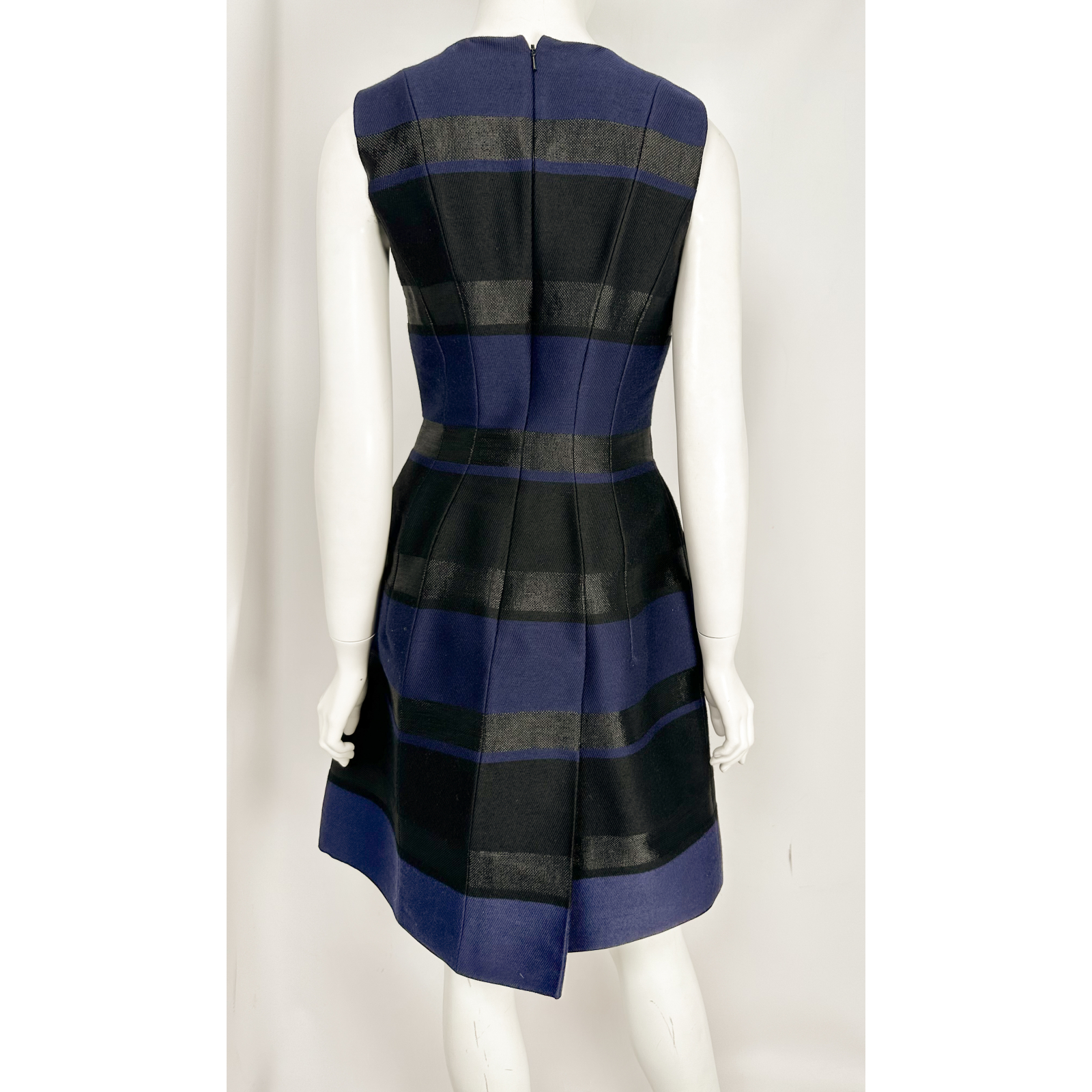 "Czarno-granatowa wełniana sukienka w poziome pasy wykonana z łączonych materiałów, bez rękawów, długość do kolan, dwie klapy imitujące kieszenie po bokach, okrągły dekolt, zapinana w tylnej części na kryty suwak oraz haftkę, taliowana, rozkloszowany dół, wykończona prostymi przeszyciami, czarna jedwabna podszewka. Rozmiar IT 42. Częściowo wytarta metka ze składem, w składzie m. in.: 70% wełna, wiskoza, poliamid, jedwab; podszewka: 100% jedwab. Wymiary: szerokość mierzona od pachy do pachy 42cm, długość całkowita 96cm, szerokość w talii 34cm."
