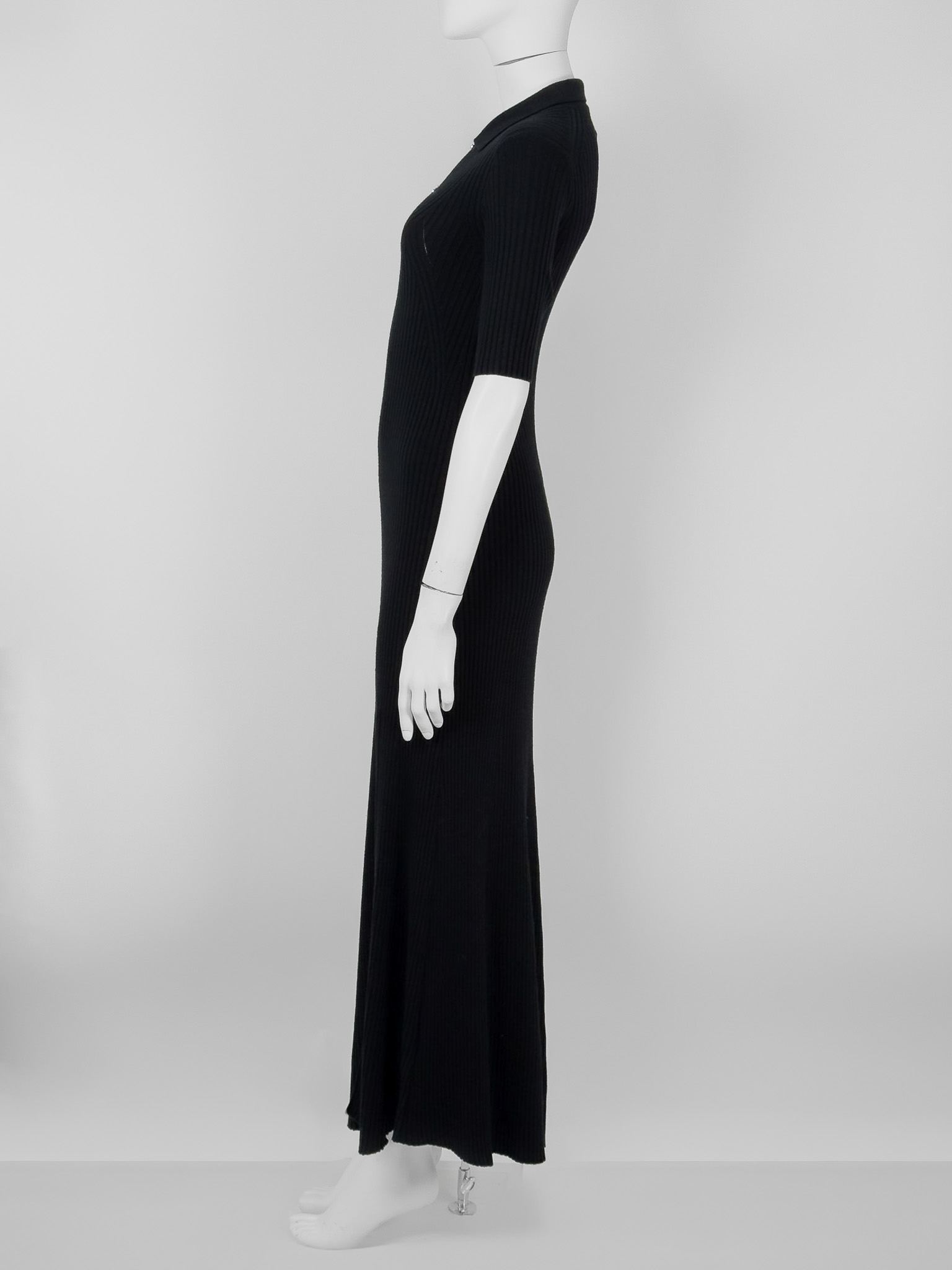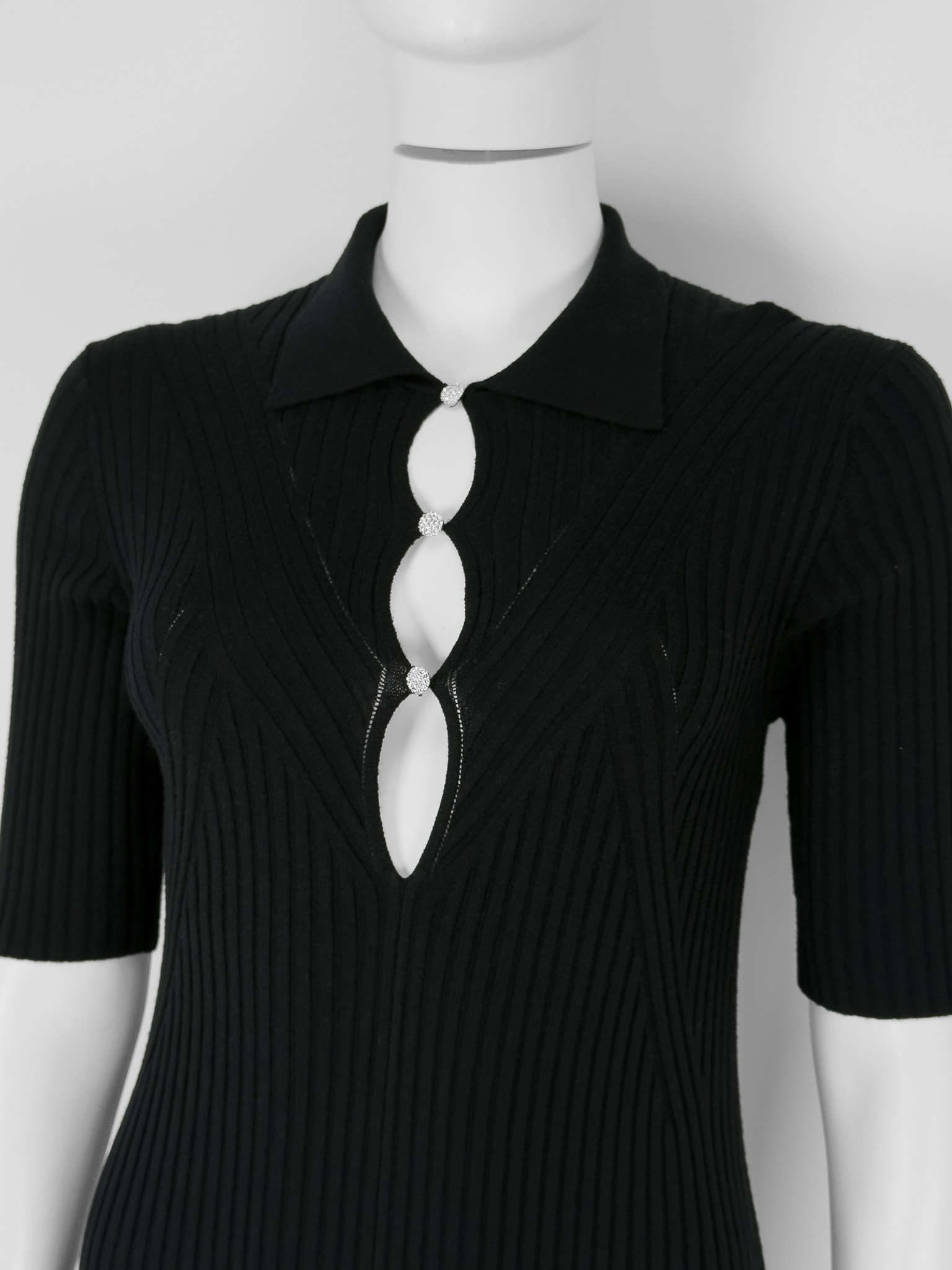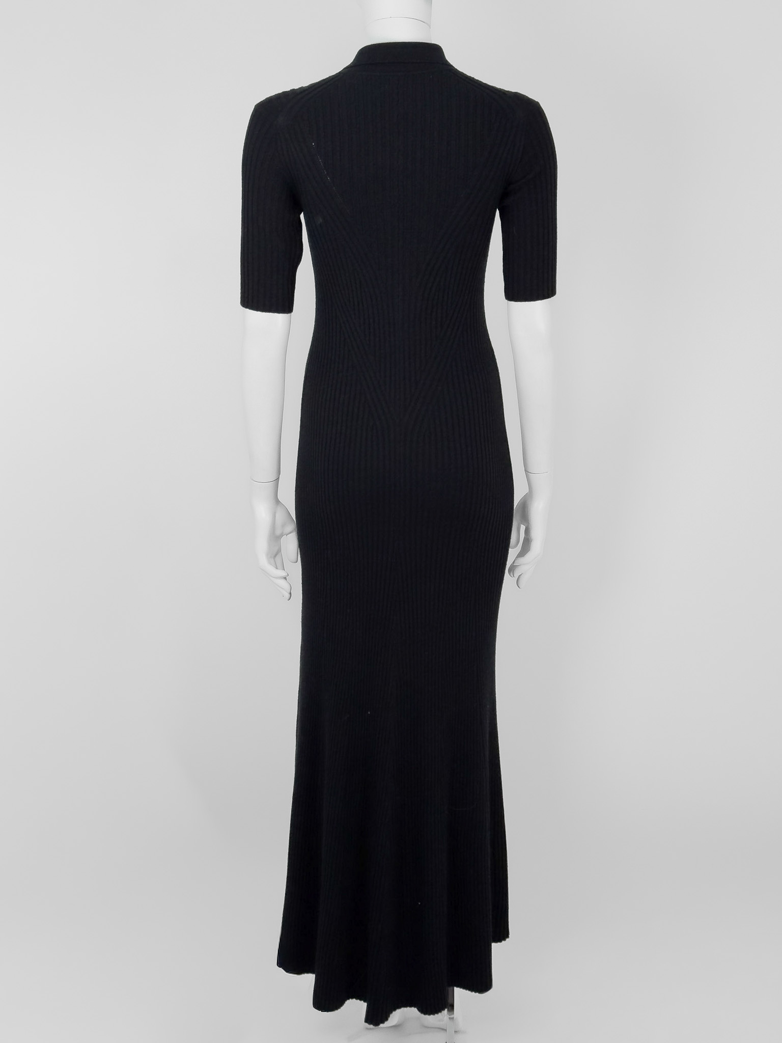 "Czarna wełniana długa prążkowana sukienka z krótkim rękawem, z przodu trzy odpinane guziki wysadzane cyrkoniami, ozdobne wycięcia, rozcięcie na przodzie. Stan nowa z metką. Skład: 90% wełna z merynosów, 10% poliester. Rozmiar z metki M. Wymiary: szerokość mierzona od pachy do pachy 38cm, długość całkowita 145cm."