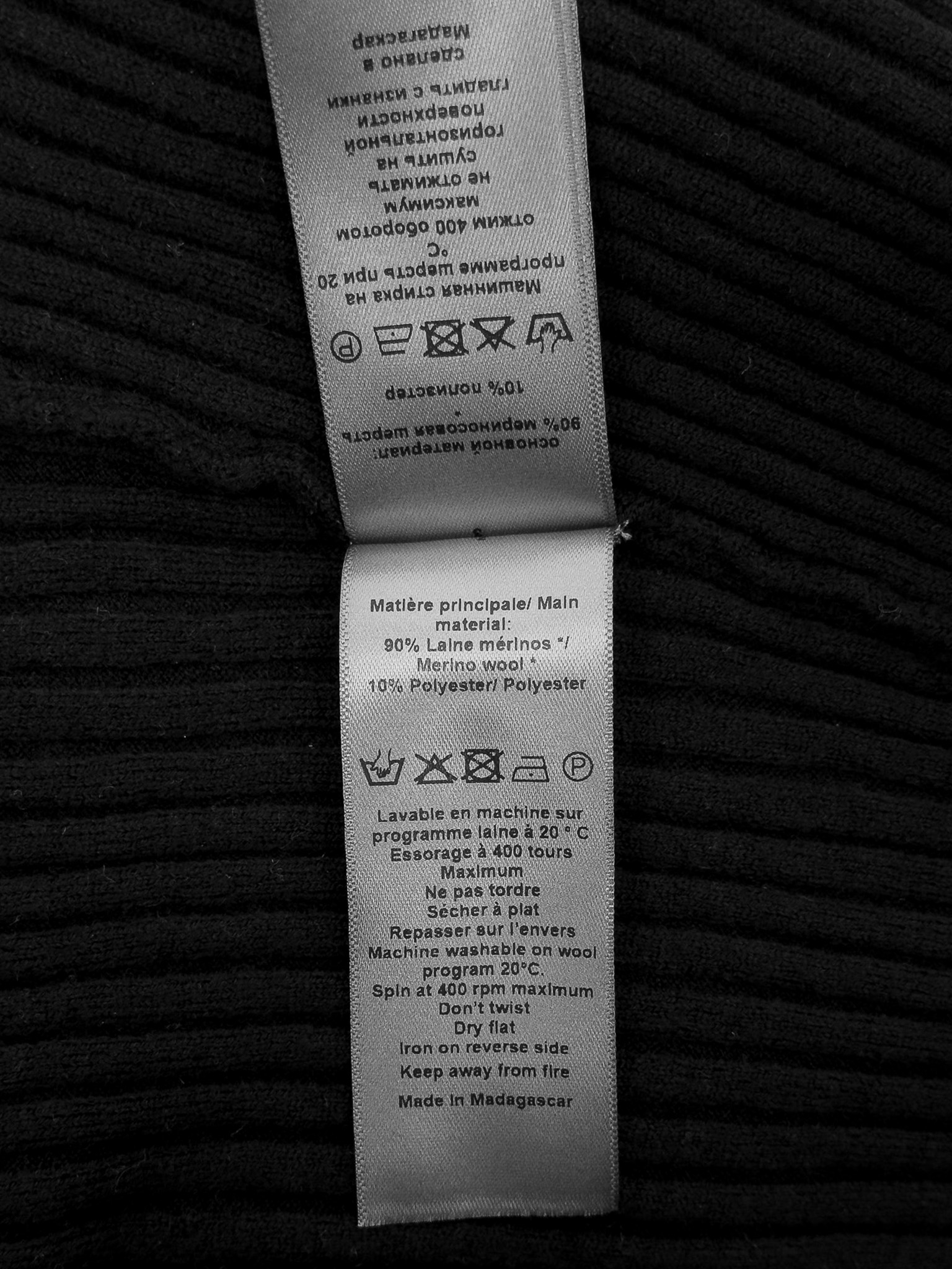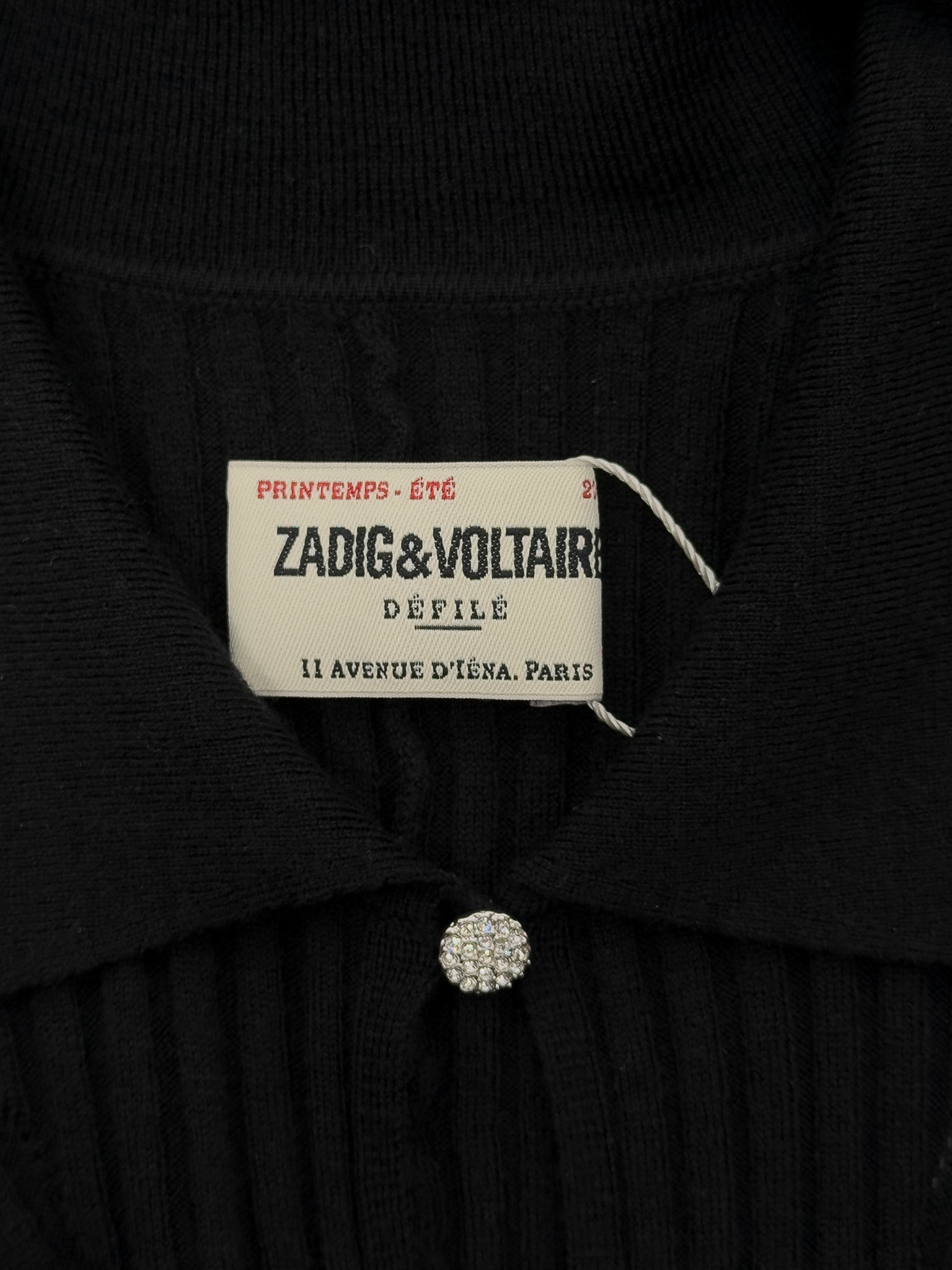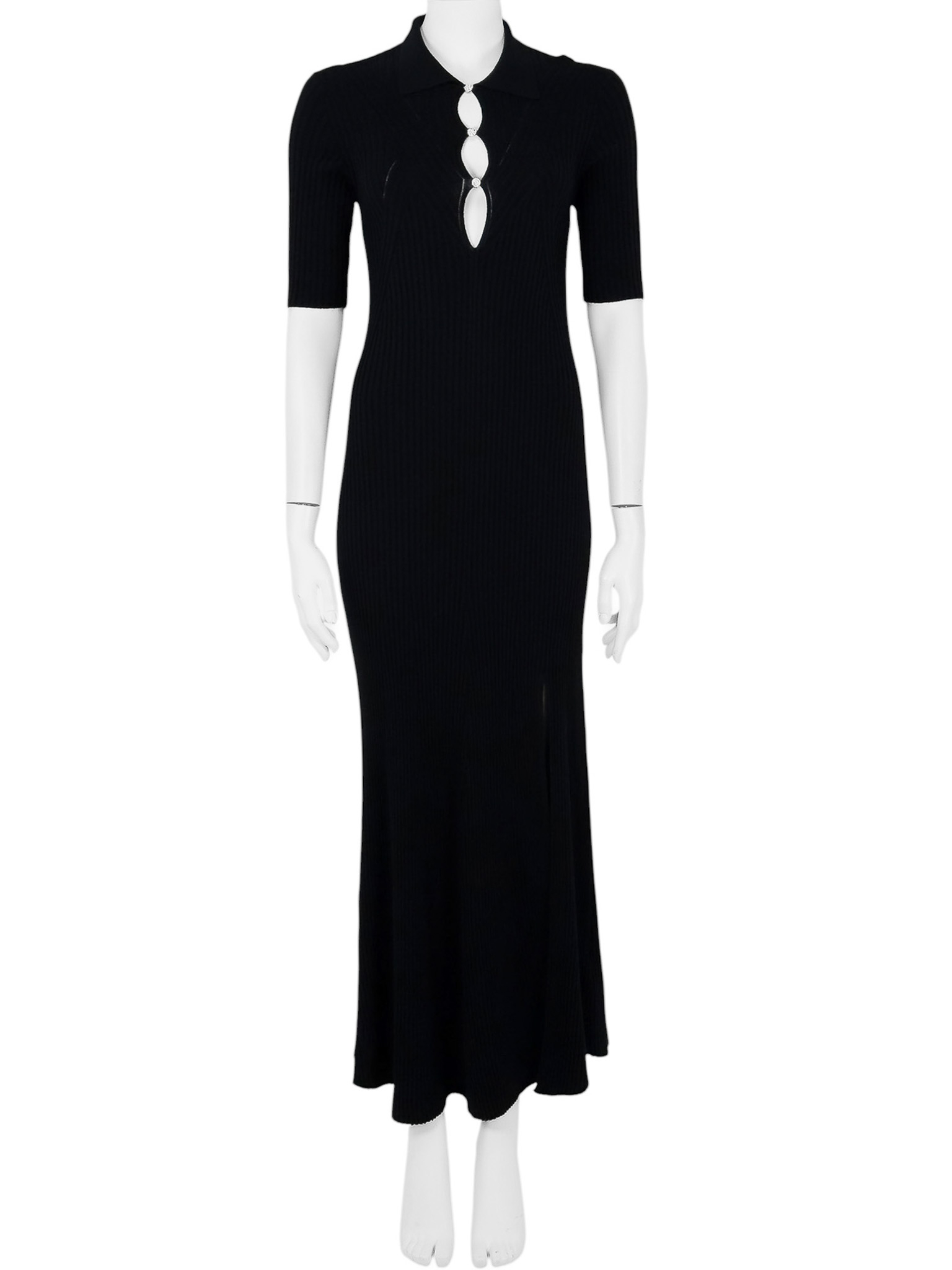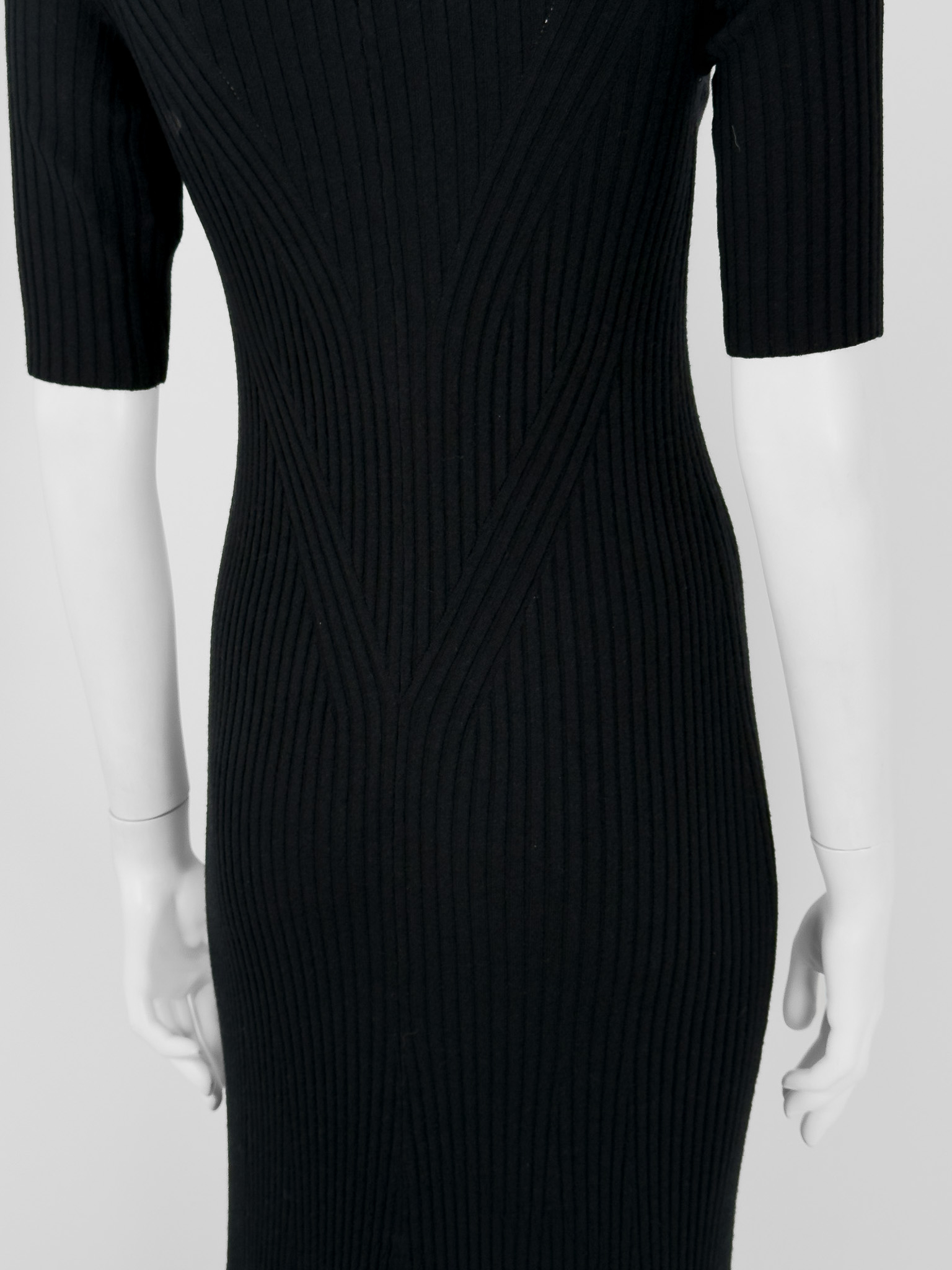 "Czarna wełniana długa prążkowana sukienka z krótkim rękawem, z przodu trzy odpinane guziki wysadzane cyrkoniami, ozdobne wycięcia, rozcięcie na przodzie. Stan nowa z metką. Skład: 90% wełna z merynosów, 10% poliester. Rozmiar z metki M. Wymiary: szerokość mierzona od pachy do pachy 38cm, długość całkowita 145cm."