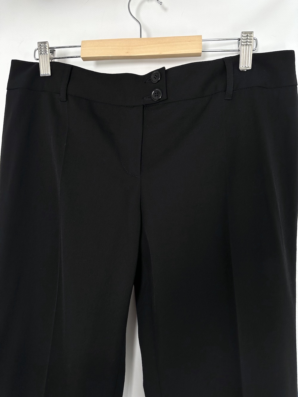 "Czarne wełniane spodnie, w kant, zapinane na dwa czarne logowane guziki oraz suwak, nogawki rozszerzane na dole, zakończone mankietem, szlufki w pasie, średni stan. Rozmiar z metki IT 46. Skład: 97% wełna, 3% inne włókna. Wymiary: szerokość w pasie 44cm, długość mierzona od zewnętrznej strony 104cm."