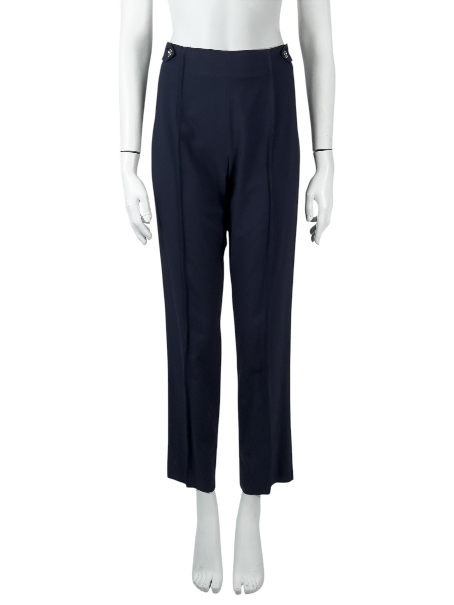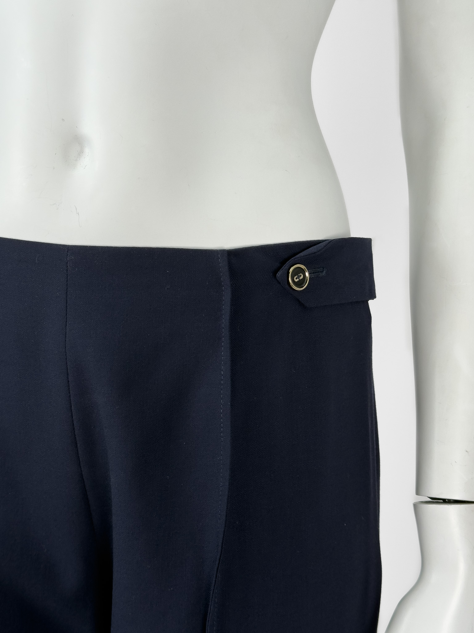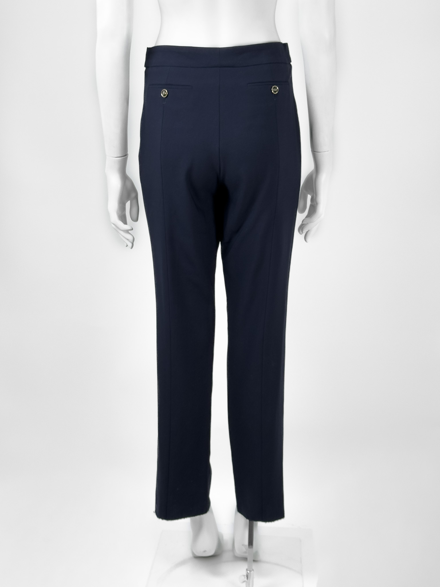 "Granatowe wełniane spodnie w kant, prosta nogawka zwężana ku dołowi, ozdobne złoto-czarne logowane guziki w pasie, zapinane na kryty suwak w bocznej części, wysoki stan, dwie kieszenie w tylnej części. Stan dobry, posiadają delikatne zaciągnięcia na wykończeniu nogawek. Rozmiar z metki IT 42. Skład: 100% wełna. Wymiary: szerokość w pasie 40cm, długość całkowita mierzona od zewnętrznej strony nogawki 101cm."
