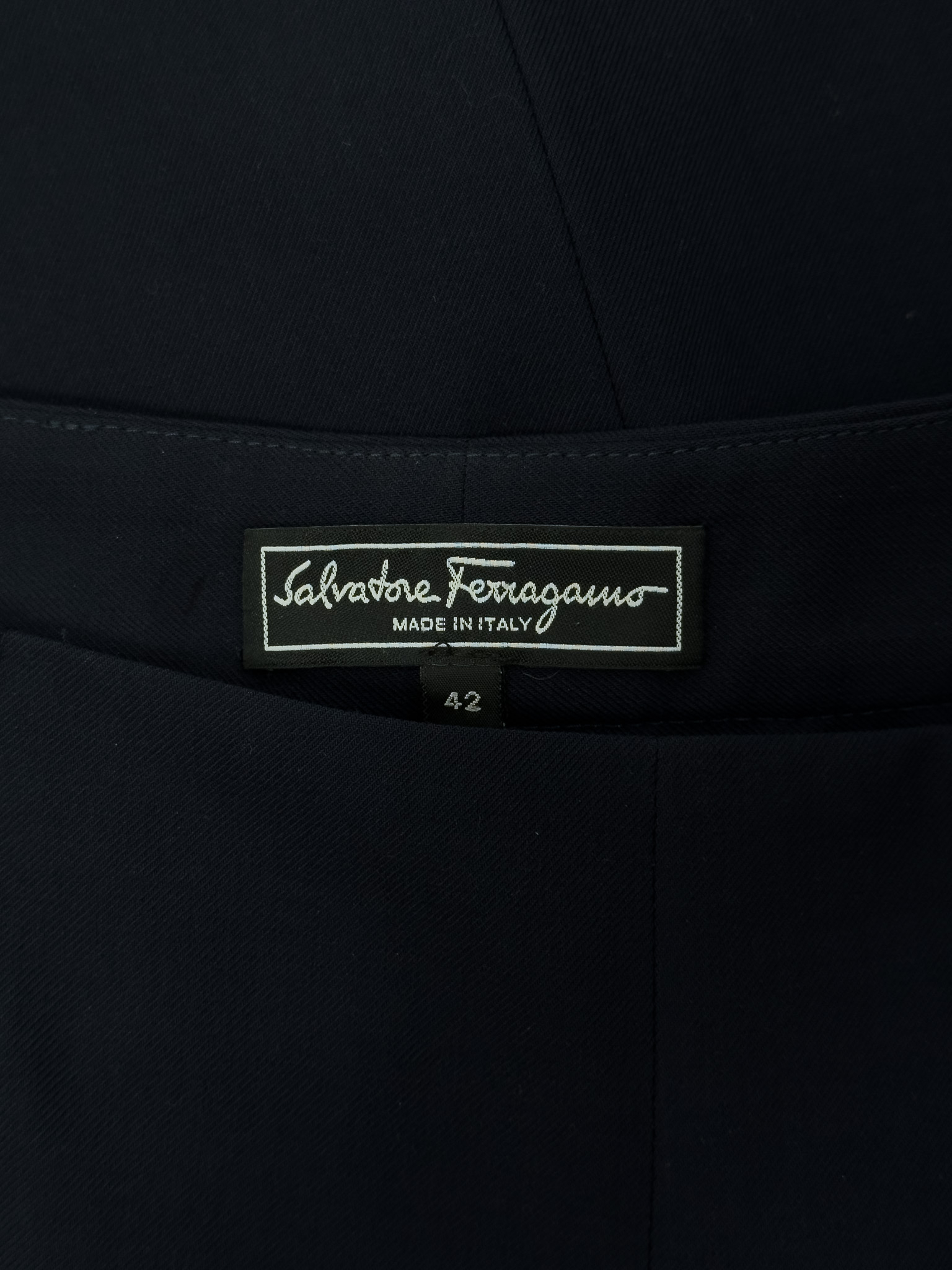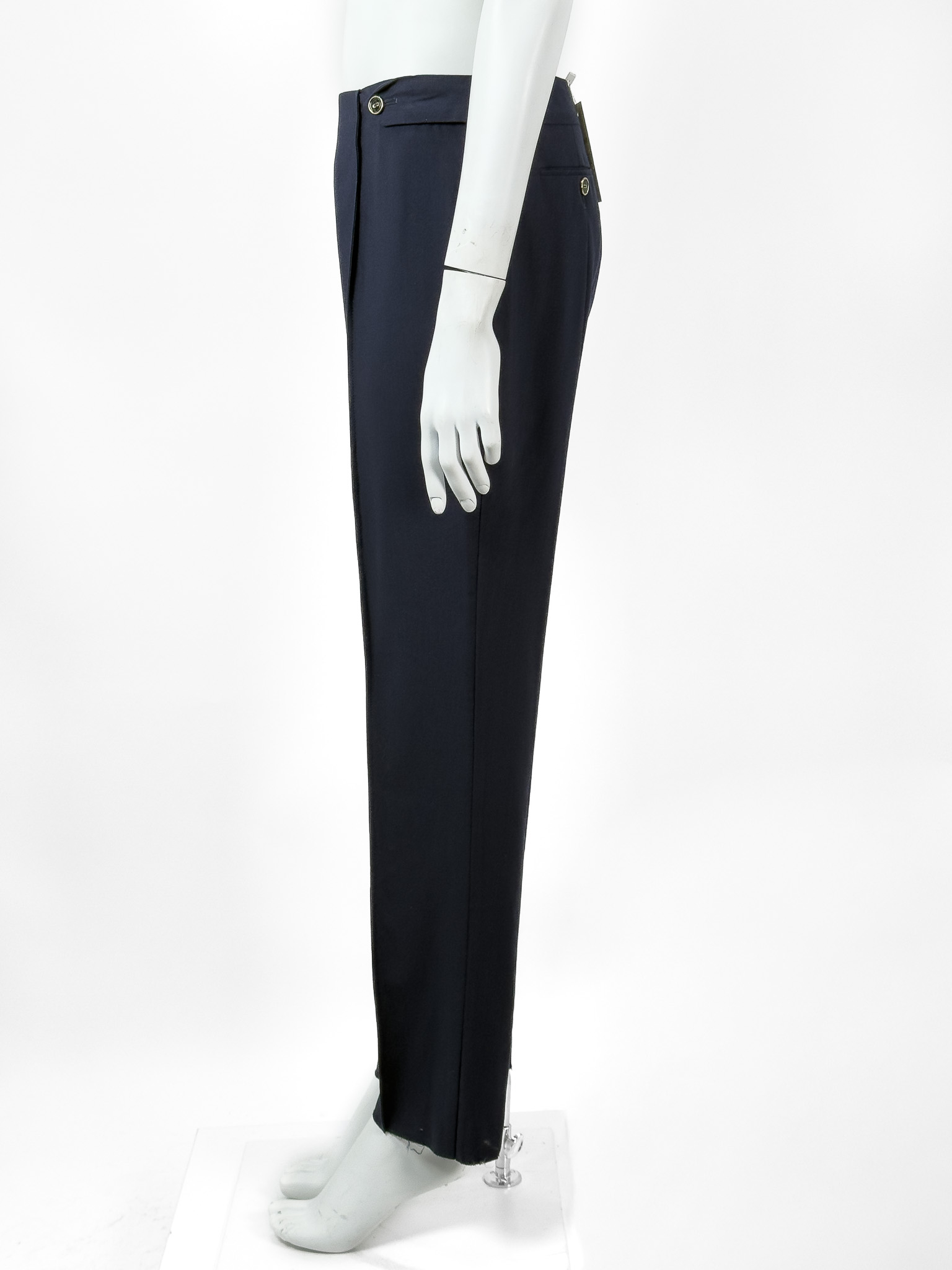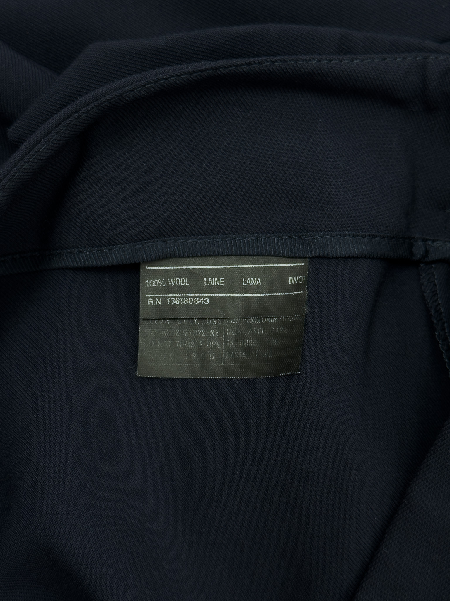 "Granatowe wełniane spodnie w kant, prosta nogawka zwężana ku dołowi, ozdobne złoto-czarne logowane guziki w pasie, zapinane na kryty suwak w bocznej części, wysoki stan, dwie kieszenie w tylnej części. Stan dobry, posiadają delikatne zaciągnięcia na wykończeniu nogawek. Rozmiar z metki IT 42. Skład: 100% wełna. Wymiary: szerokość w pasie 40cm, długość całkowita mierzona od zewnętrznej strony nogawki 101cm."