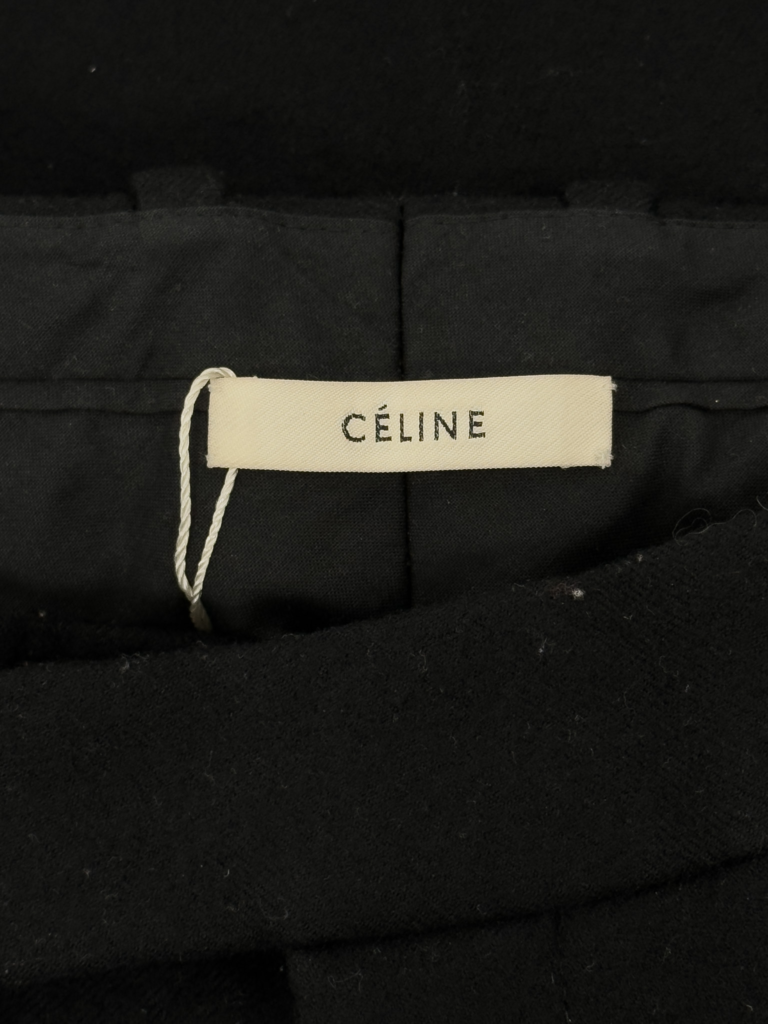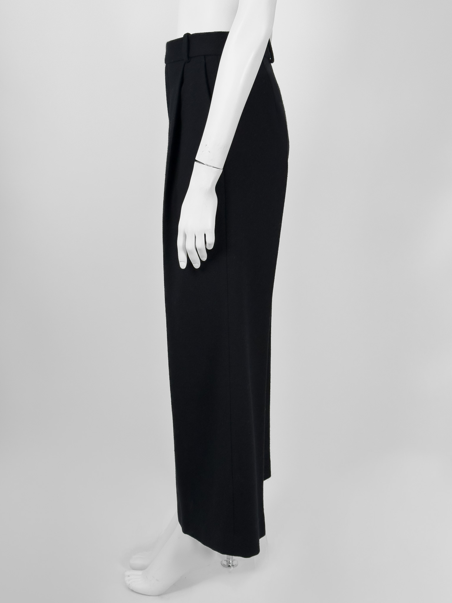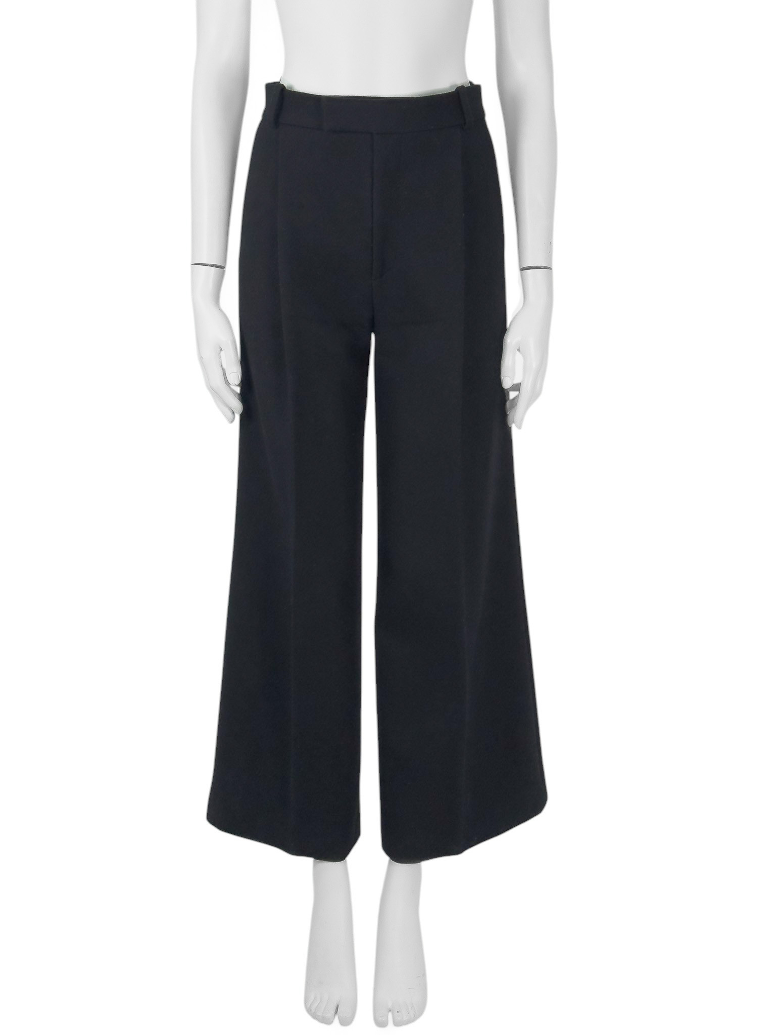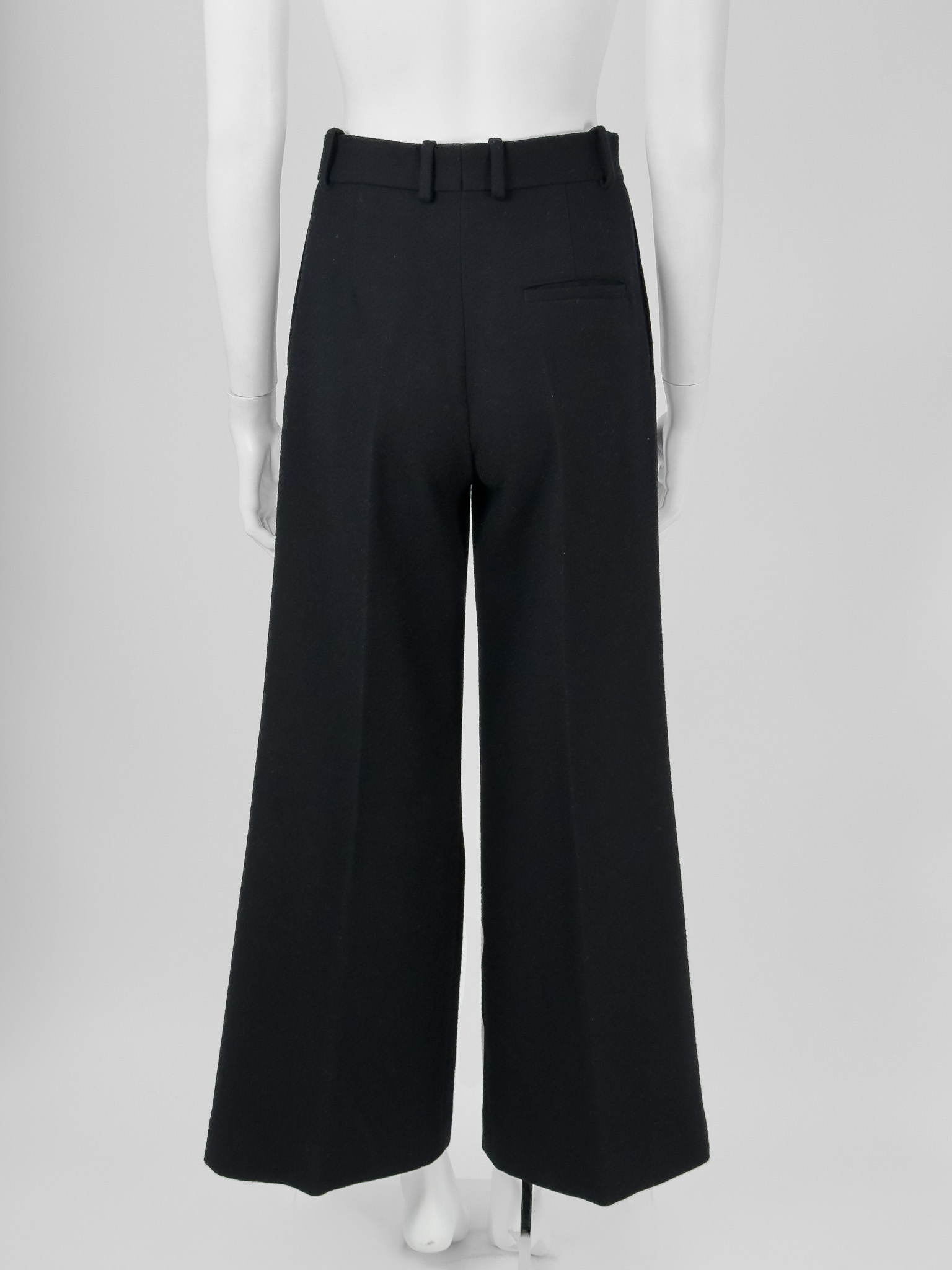 "Wełniane spodnie, wysoki stan, prosta nogawka, rozszerzana na wykończeniu, w kant, zapinane na kryty suwak, guzik oraz dwie haftki. Stan bardzo dobry, posiadają delikatne zmechacenia. Rozmiar z metki 34. Skład: 100% wełna; podszewka: 100% bawełna. Wymiary: szerokość w pasie 35cm, długość całkowita mierzona od zewnętrznej strony nogawki 102cm."