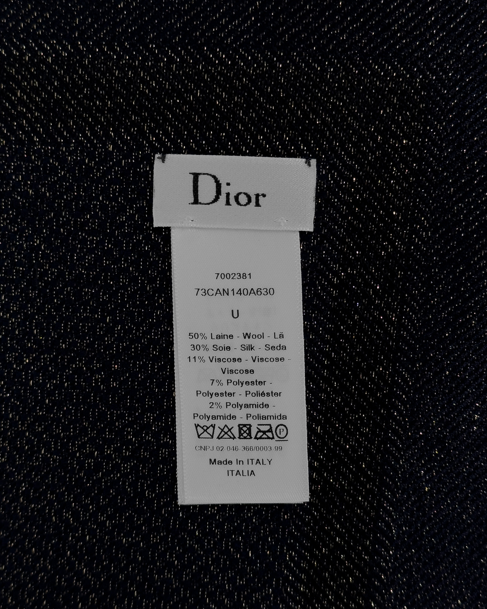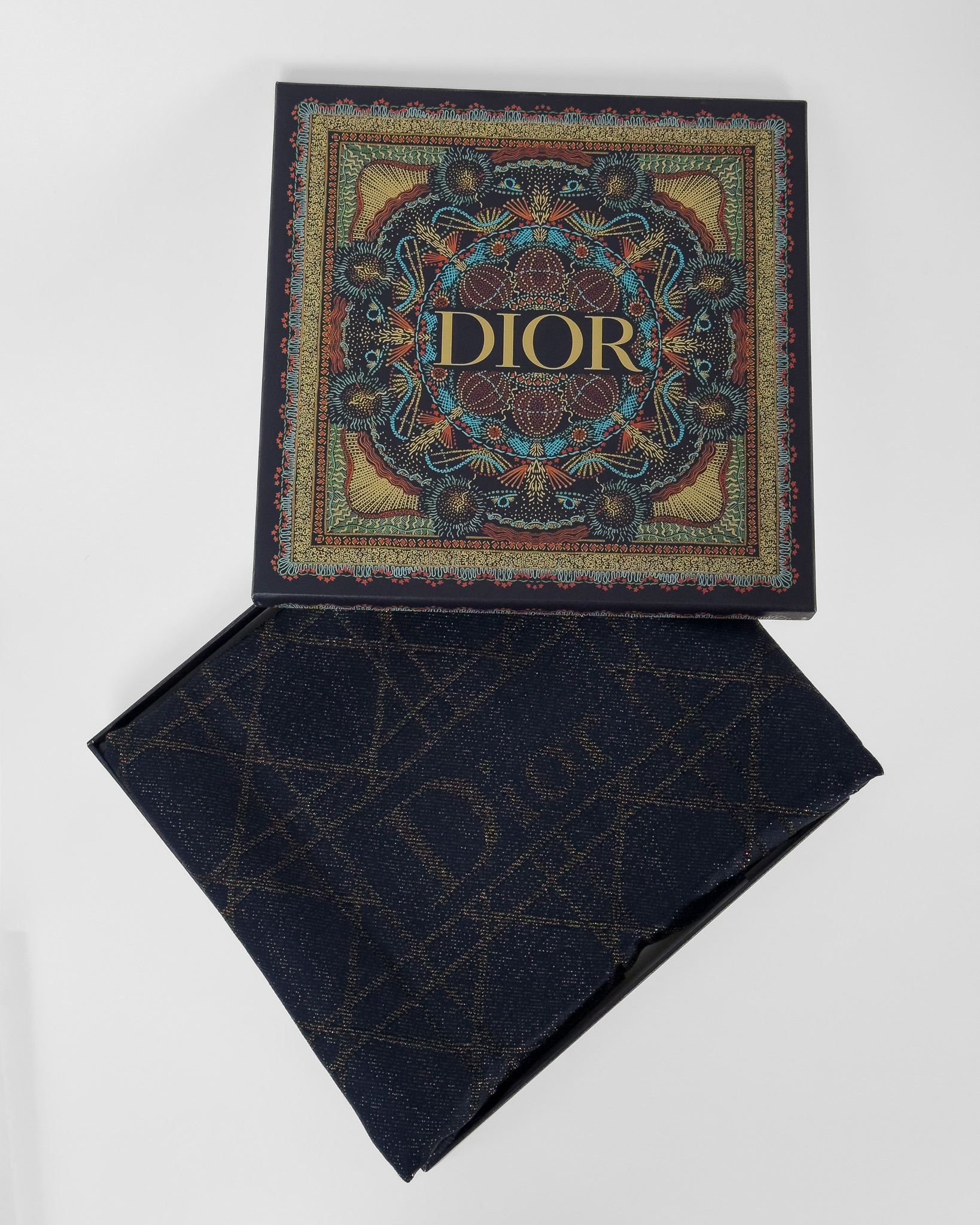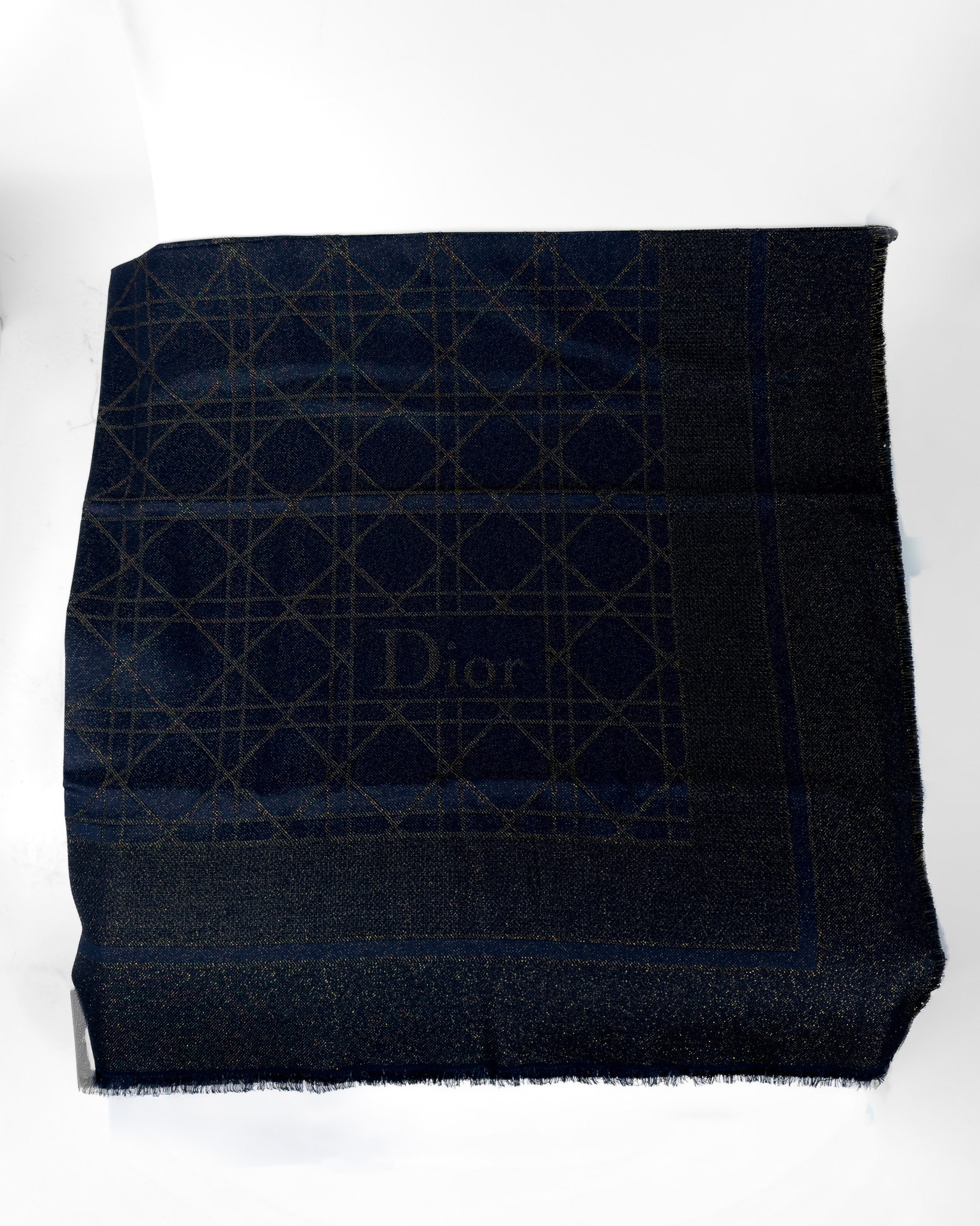 "Granatowa chusta ozdobiona złotą błyszczącą nitką, duże logo marki w centralnej części, wykończona frędzlami, w zestawie z pudełkiem. Stan idealny. Skład: 50% wełna, 30% jedwab, 11% wiskoza, 7% poliester, 2% poliamid. Wymiary: 139cm x 139cm."
