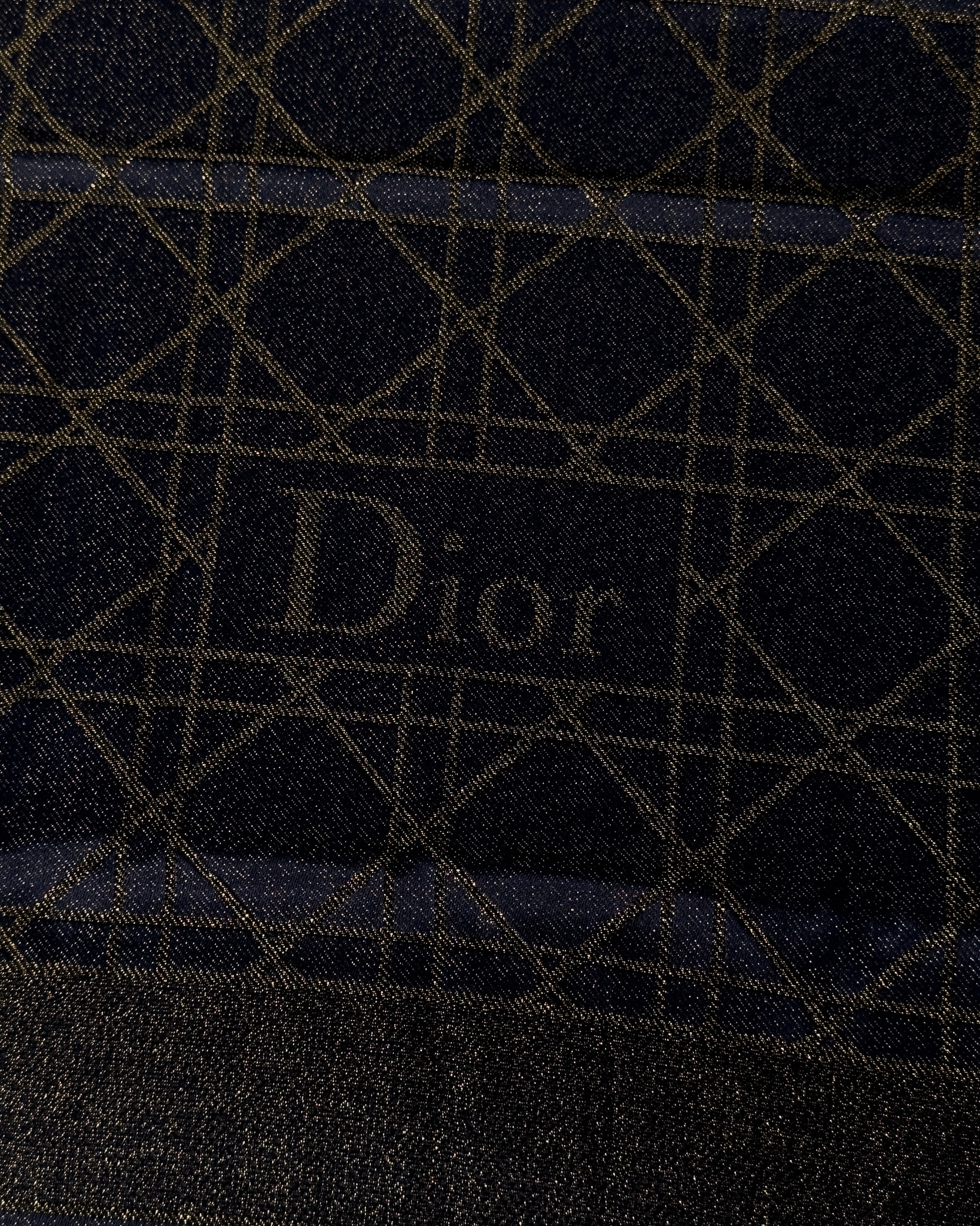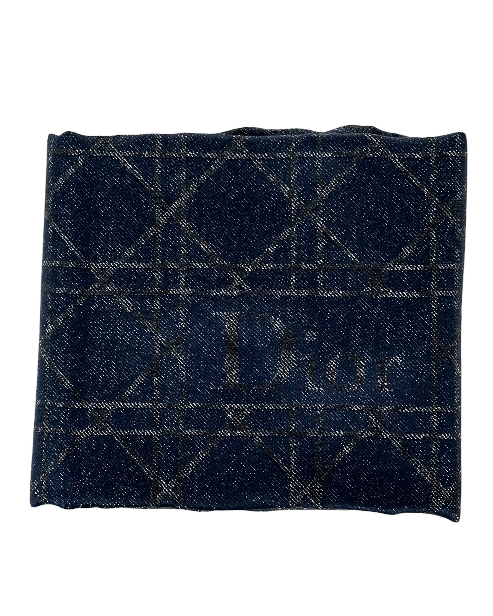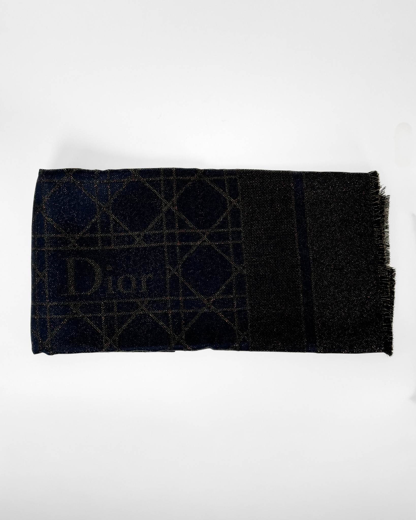 "Granatowa chusta ozdobiona złotą błyszczącą nitką, duże logo marki w centralnej części, wykończona frędzlami, w zestawie z pudełkiem. Stan idealny. Skład: 50% wełna, 30% jedwab, 11% wiskoza, 7% poliester, 2% poliamid. Wymiary: 139cm x 139cm."