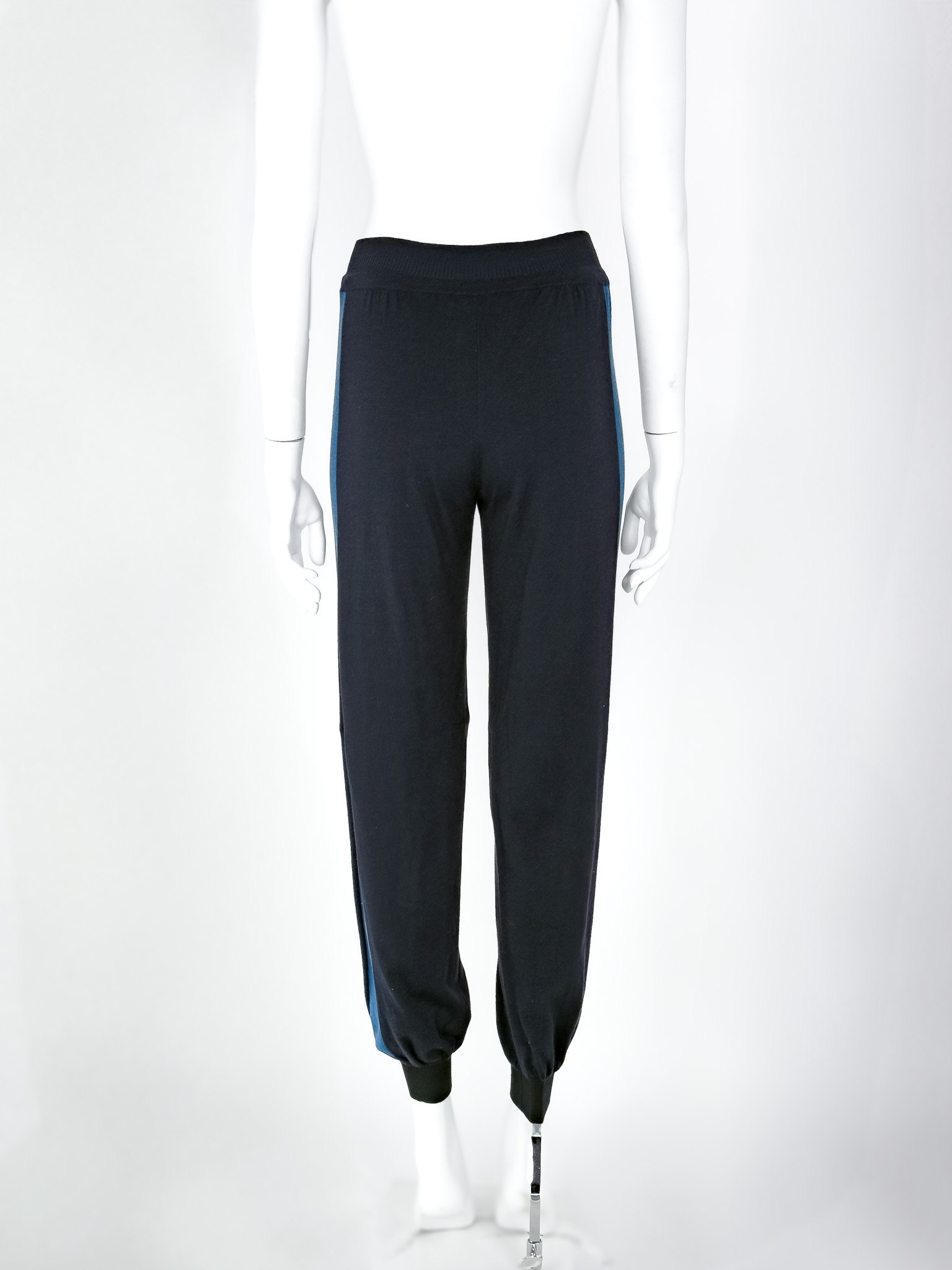 "Granatowe wełniano-kaszmirowo-jedwabne spodnie dresowe ozdobione niebieskimi lampasami, wysoki stan, sznurek oraz guma w talii, nogawki wykończone prążkowanymi ściągaczami. Rozmiar z metki S. Brak metki ze składem. Wymiary: szerokość w pasie 27cm, długość całkowita mierzona od zewnętrznej strony nogawki 102cm."