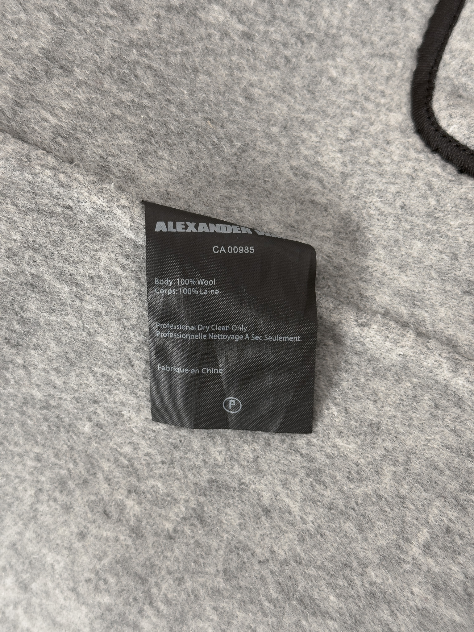 "Szary wełniany żakiet o dłuższym kroju, wykończony srebrnym suwakiem, dwie kieszenie z klapami po bokach, szpiczasty kołnierz, zapinany na jeden duży srebrny guzik, wykończony przeszyciami, brak podszewki. Skład: 100% wełna. Rozmiar z metki XS. Wymiary: szerokość mierzona od pachy do pachy 47cm, długość całkowita 78cm."