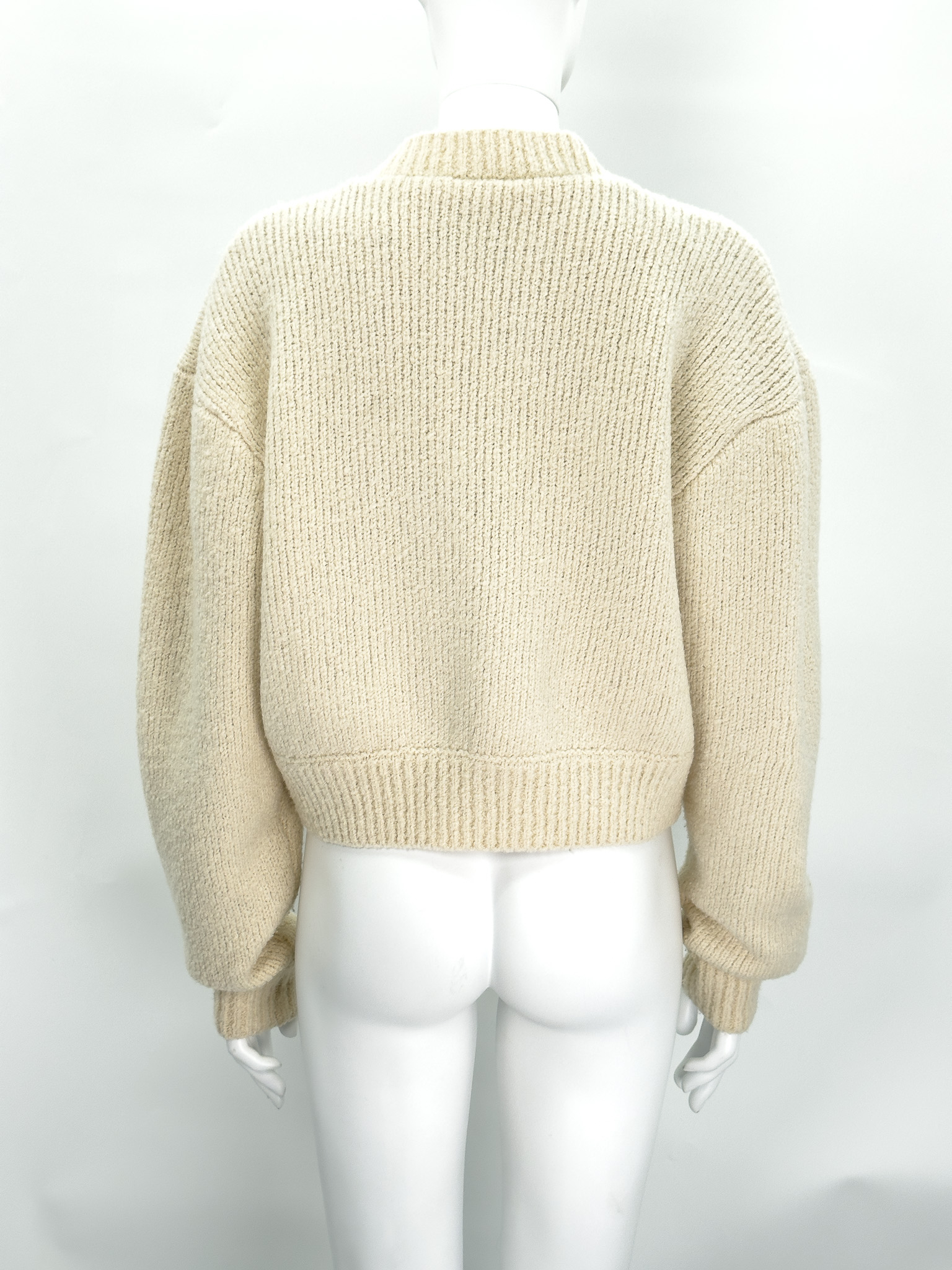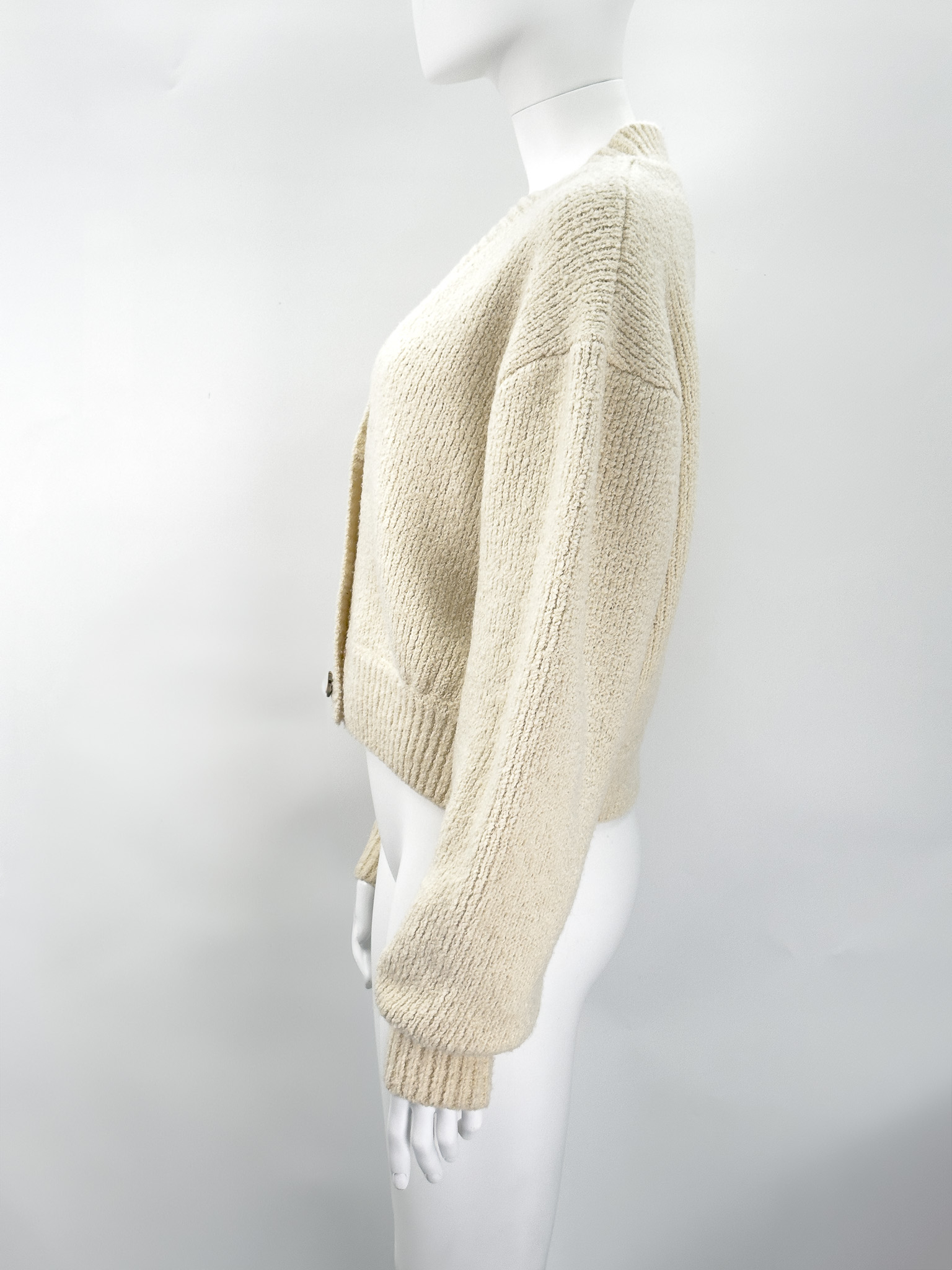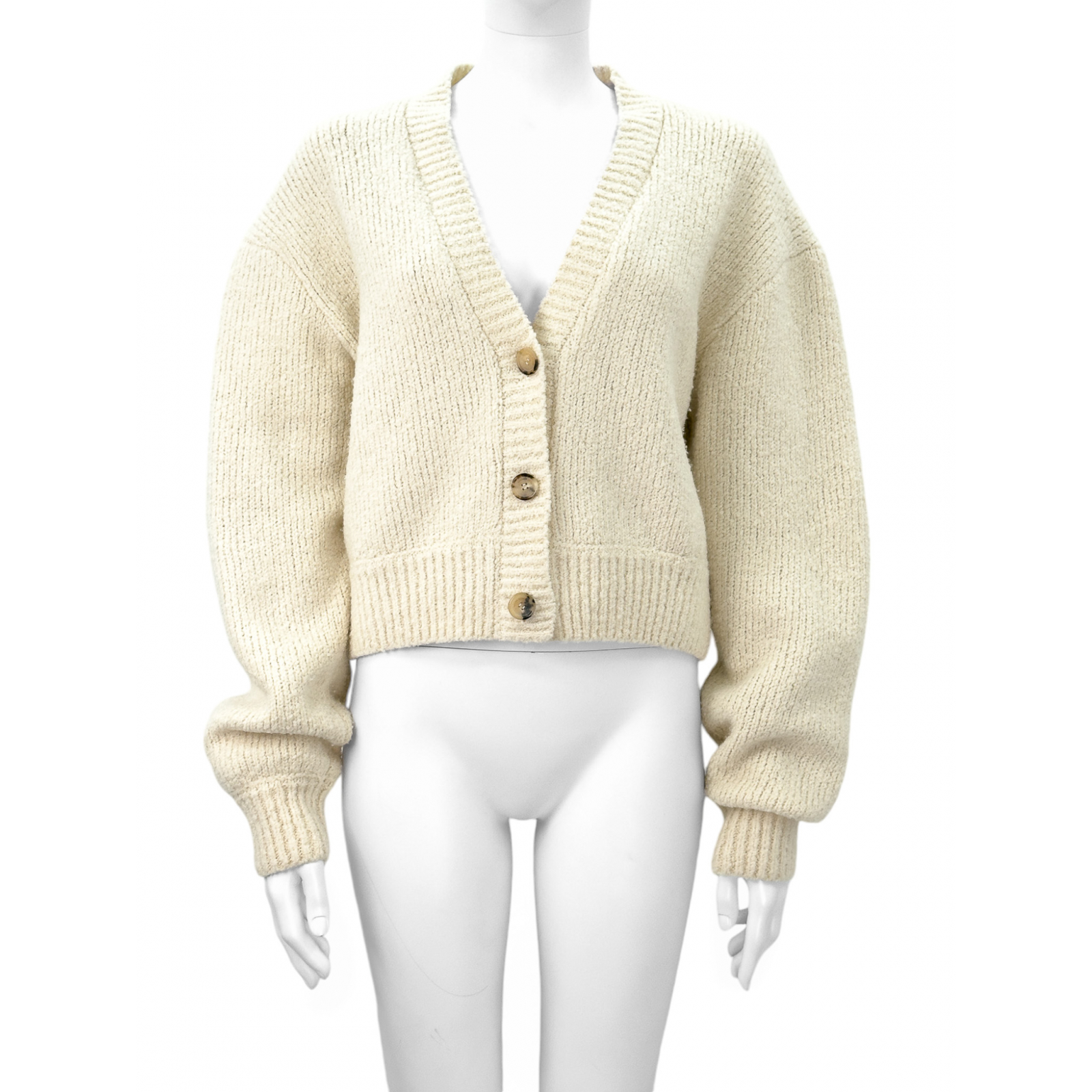 "Kremowy wełniany kardigan zapinany na trzy szylkretowe logowane guziki, krój oversize, obniżona linia ramion, głęboki dekolt w szpic, dekolt, mankiety oraz dół wykończone prążkowanym ściągaczem, podszewka ozdobiona kwiatowym wzorem. Stan dobry. Rozmiar z metki 34. Skład: 87% wełna merynosów, 8% poliamid, 5% kaszmir; podszewka: 100% jedwab. Wymiary: szerokość mierzona od pachy do pachy 60cm, długość całkowita 53cm."